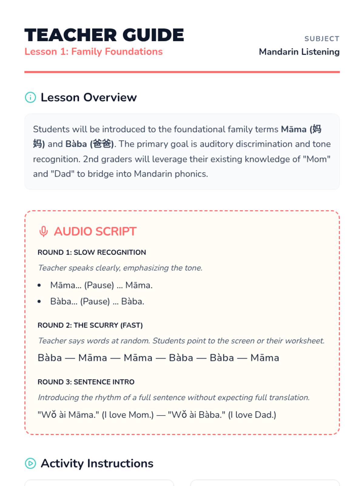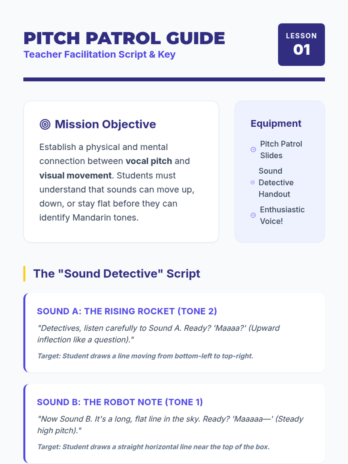 This sequence introduces 2nd-grade students to Mandarin tones and Pinyin sounds through auditory discrimination and interactive games. Students learn to hear and identify the four tones and key initial consonants, building a foundation for tonal language comprehension.