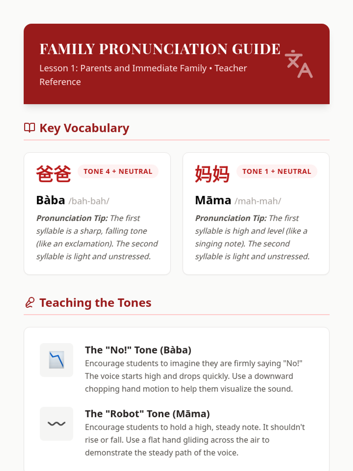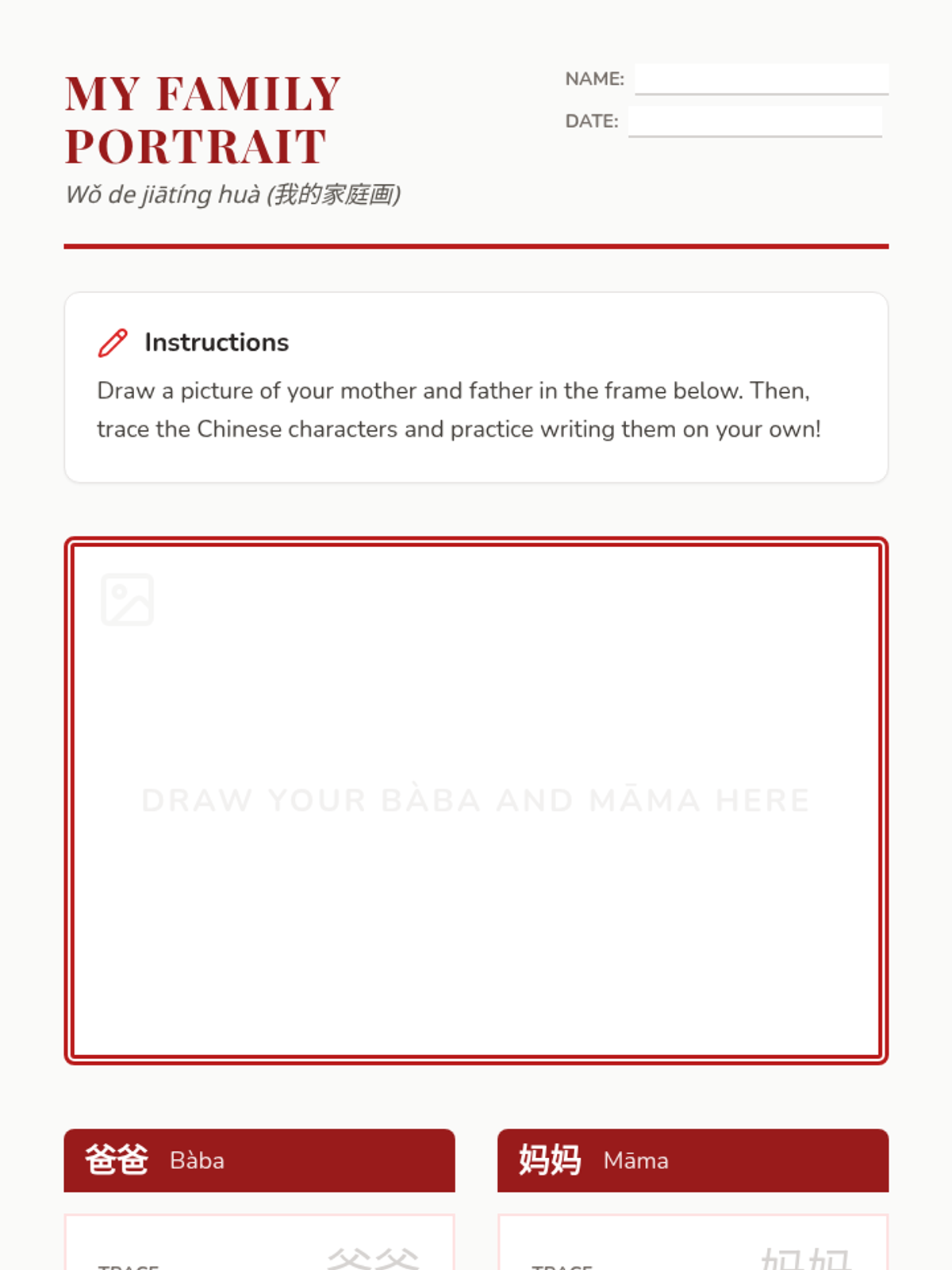 Students explore social structures and family relationships through Mandarin characters, focusing on the 'person' and 'female' radicals, pronouns, and familial hierarchy. The unit culminates in a project-based family tree where students apply their knowledge of character structure and labels.