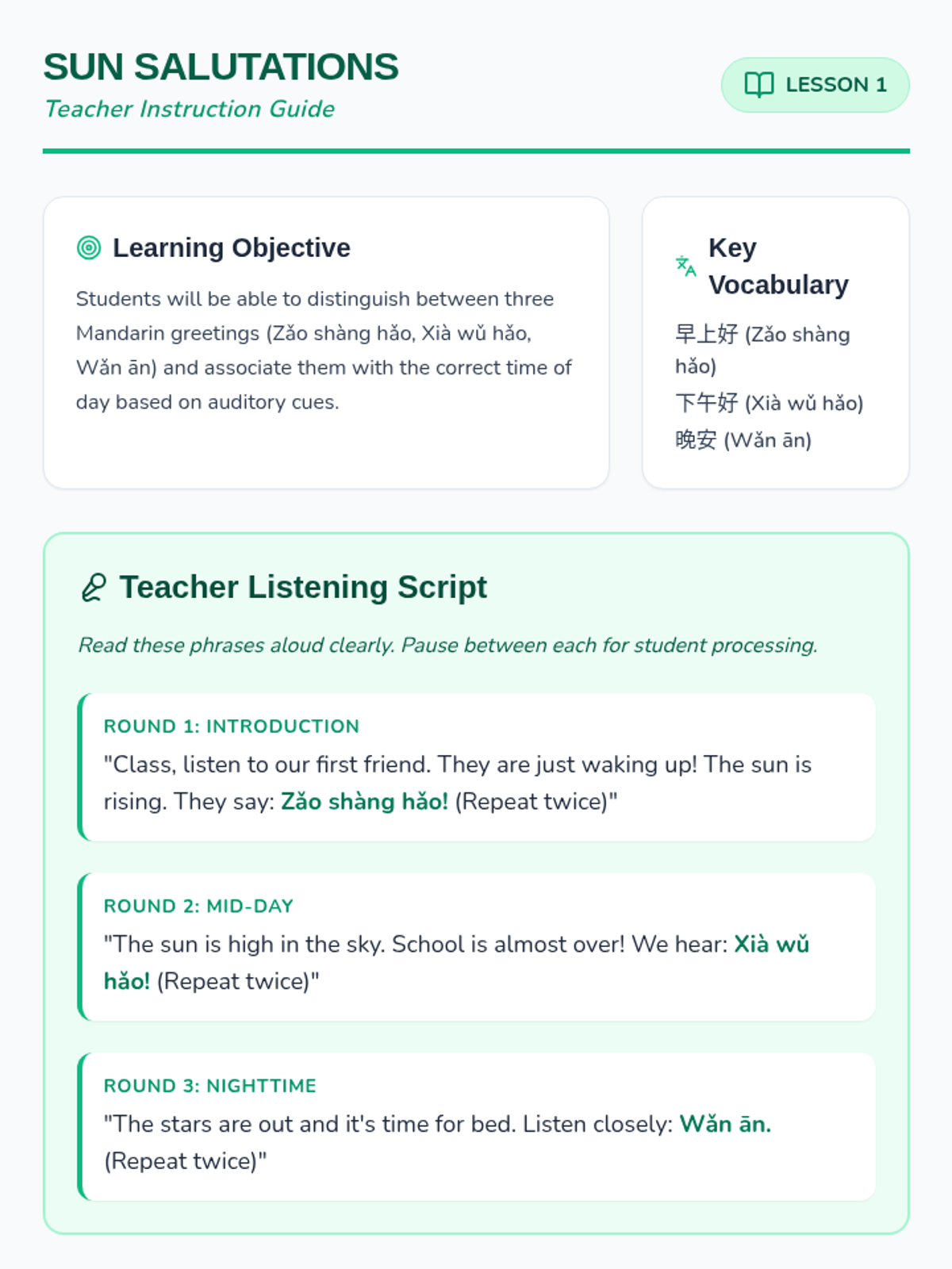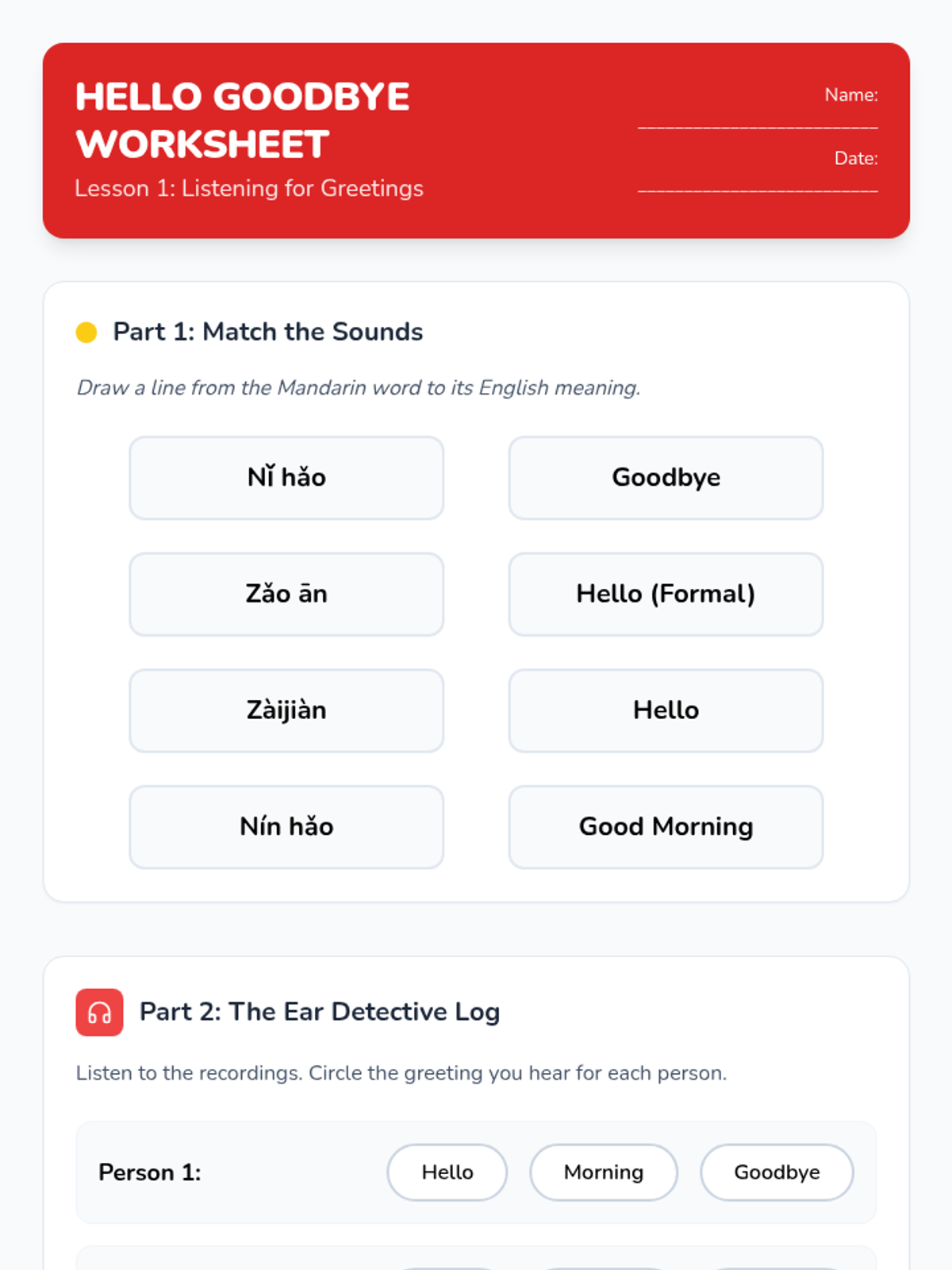 A foundational Mandarin Chinese sequence for 2nd graders focusing on greetings, introductions, and emotional expression through listening. Students develop auditory recognition of temporal greetings, names, and social cues within simple dialogues.