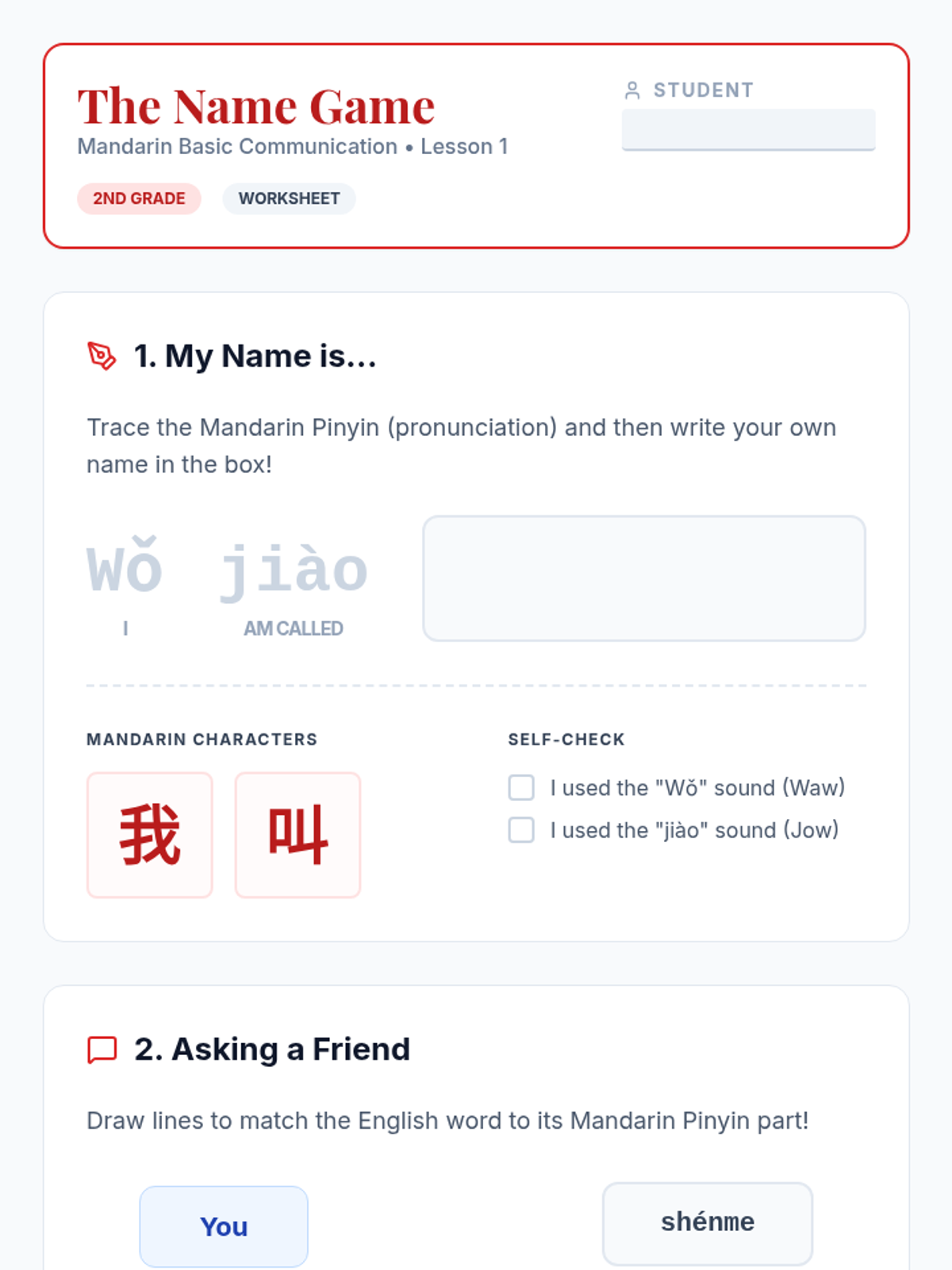 A 5-lesson sequence for 2nd graders to master basic self-introductions in Mandarin Chinese. Students progress from basic names to nationalities and preferences, culminating in a comprehensive 'All About Me' presentation.