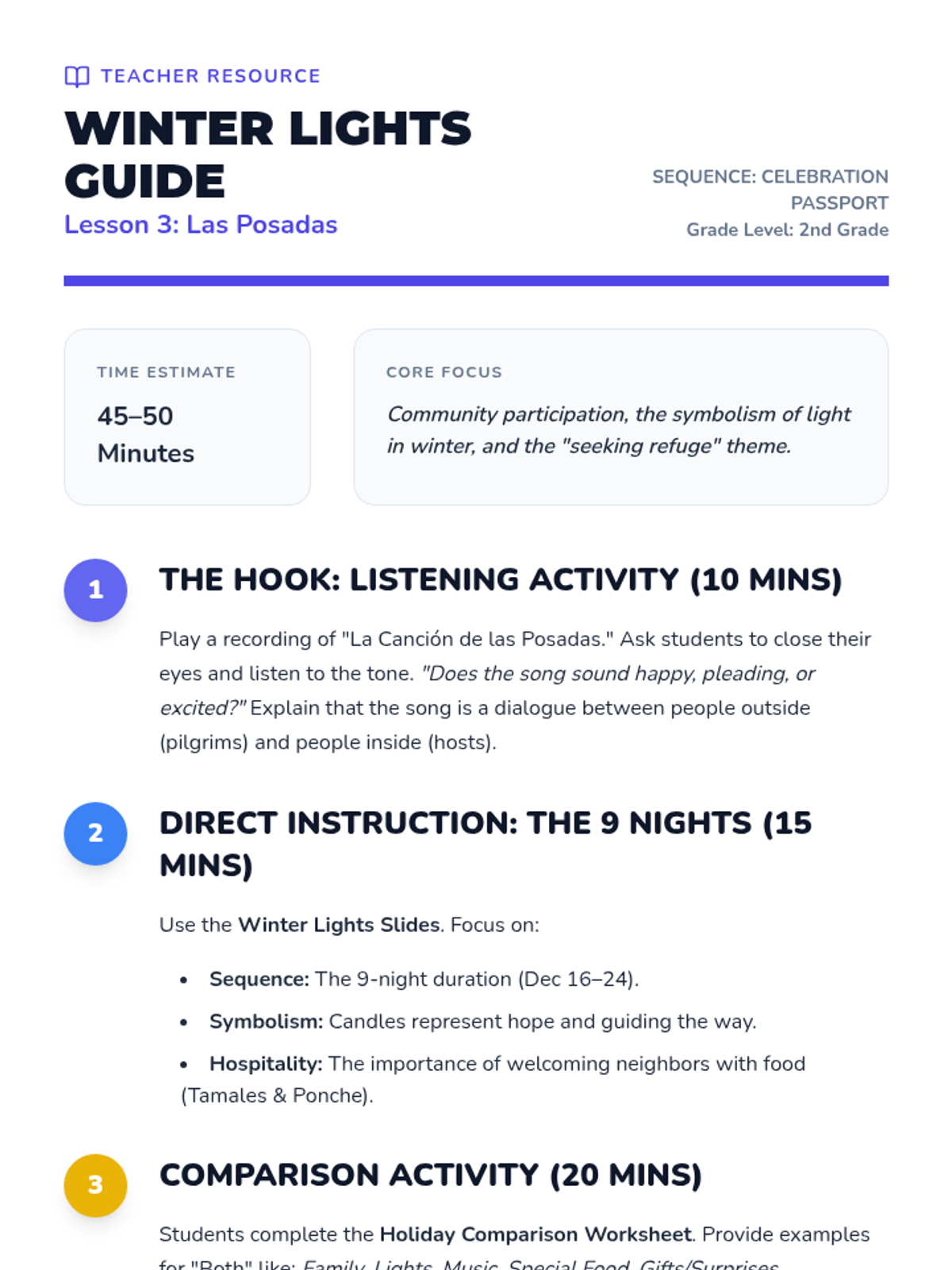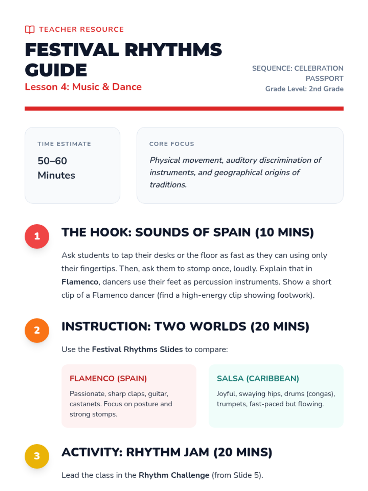 A 5-lesson sequence exploring the culinary heritage of the Spanish-speaking world, focusing on key ingredients like corn and cacao, mealtime customs, and tropical fruits. Students conclude by creating a class cookbook.