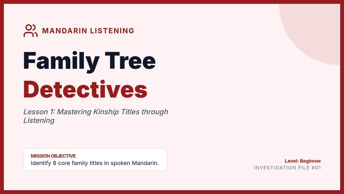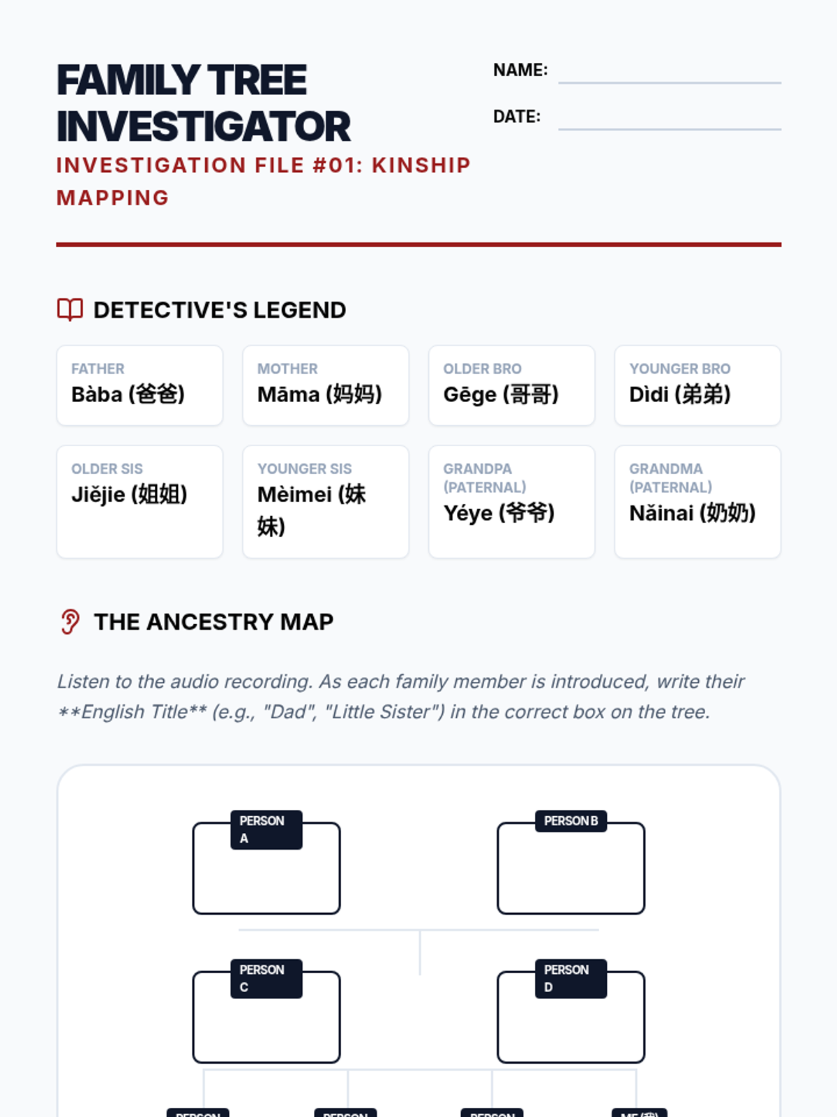 A foundational Mandarin Chinese listening sequence for 2nd graders focusing on family vocabulary, sibling hierarchy, possessive pronouns, and descriptive adjectives through auditory-visual association and logic puzzles.