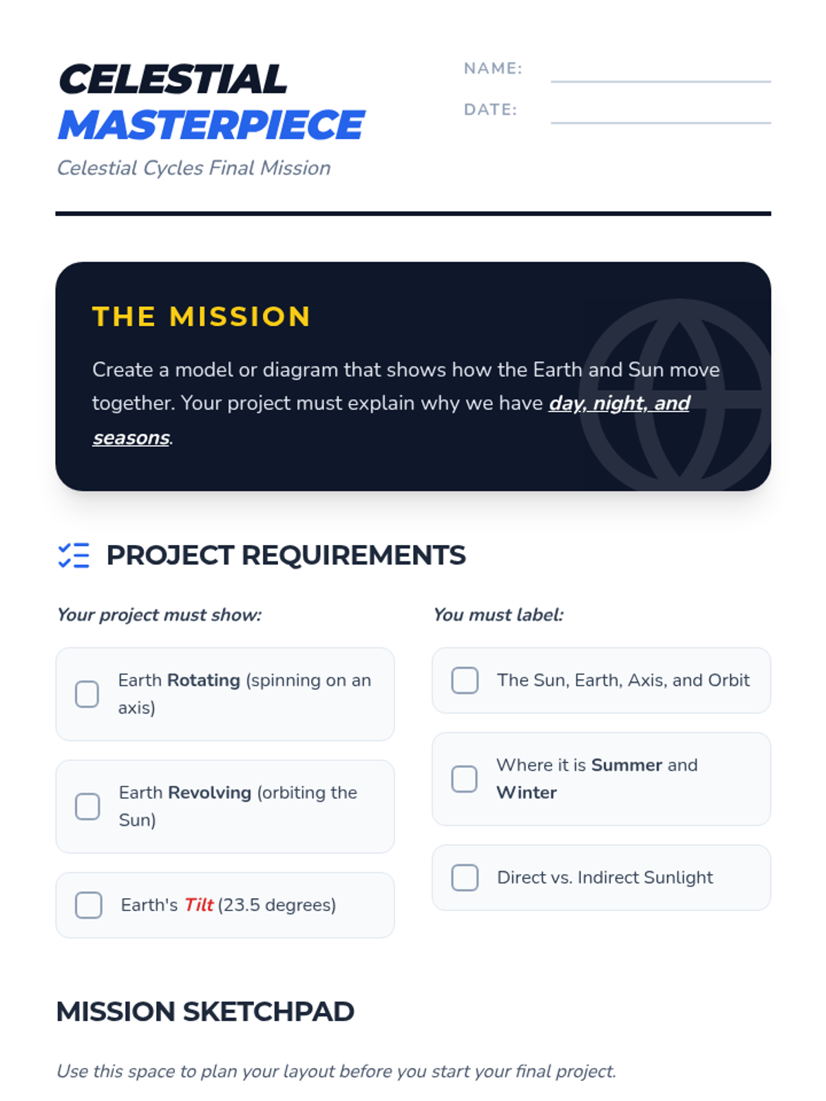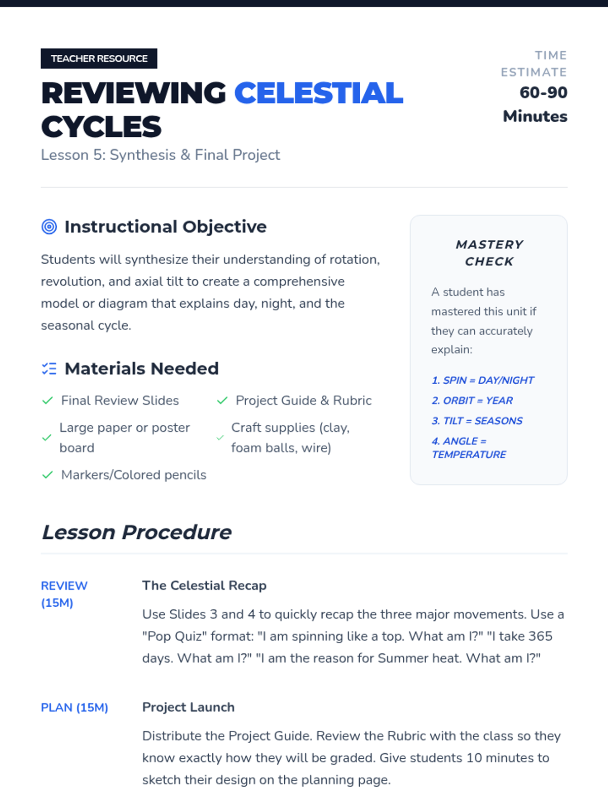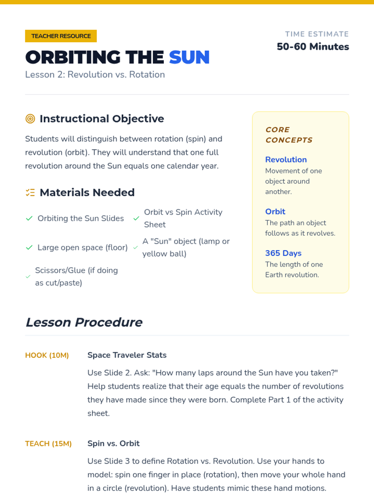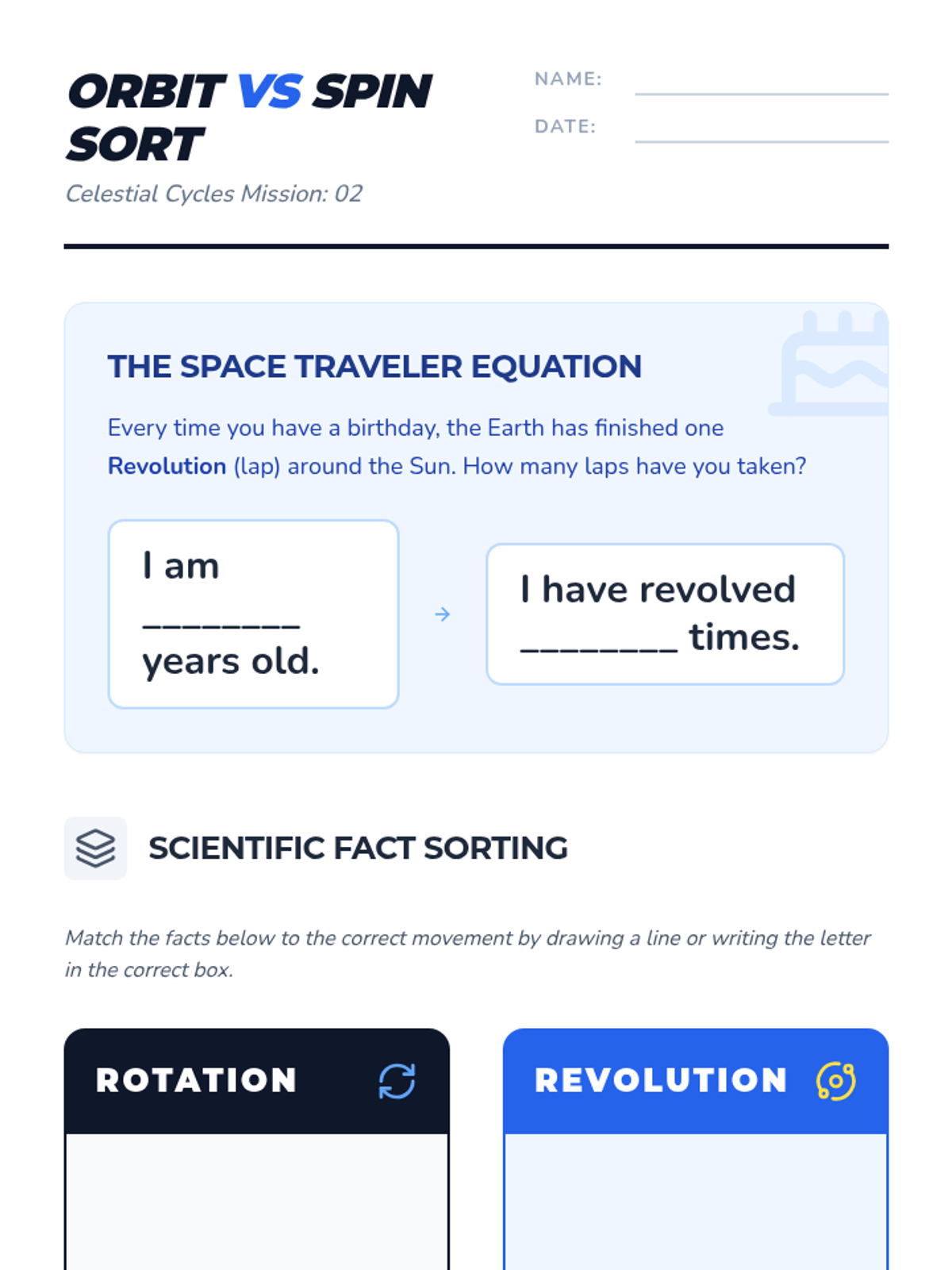 Students explore Earth's rotation and revolution to explain daily and yearly cycles. They connect Earth's spin to day and night and its orbit and tilt to the changing seasons through physical modeling and data analysis.