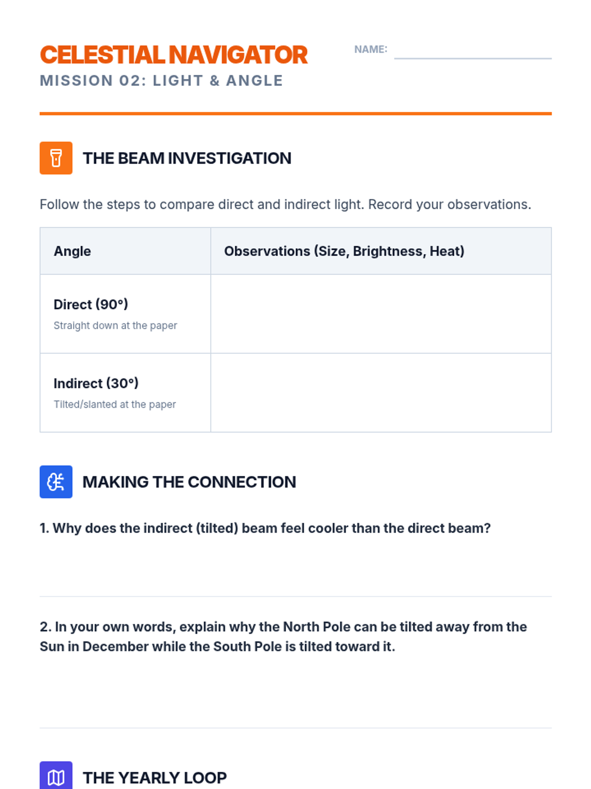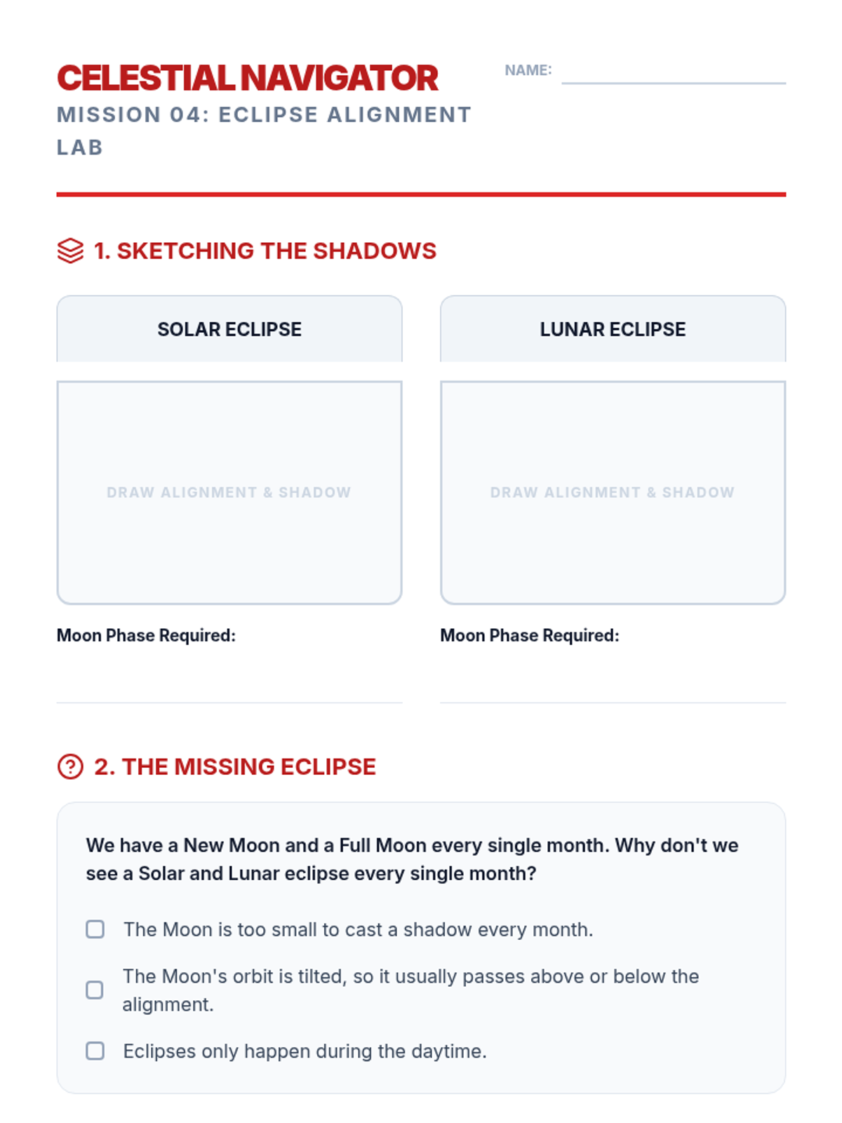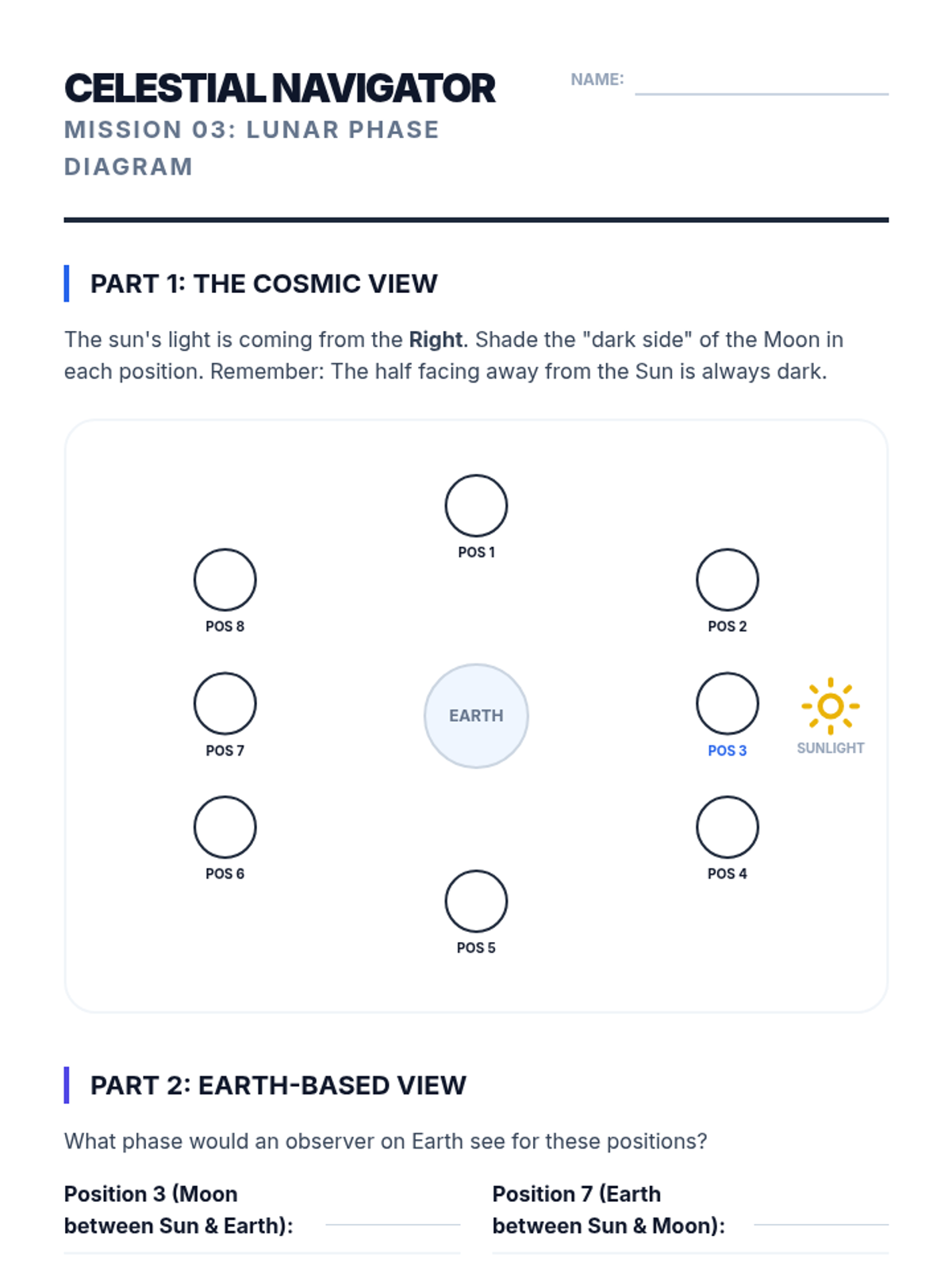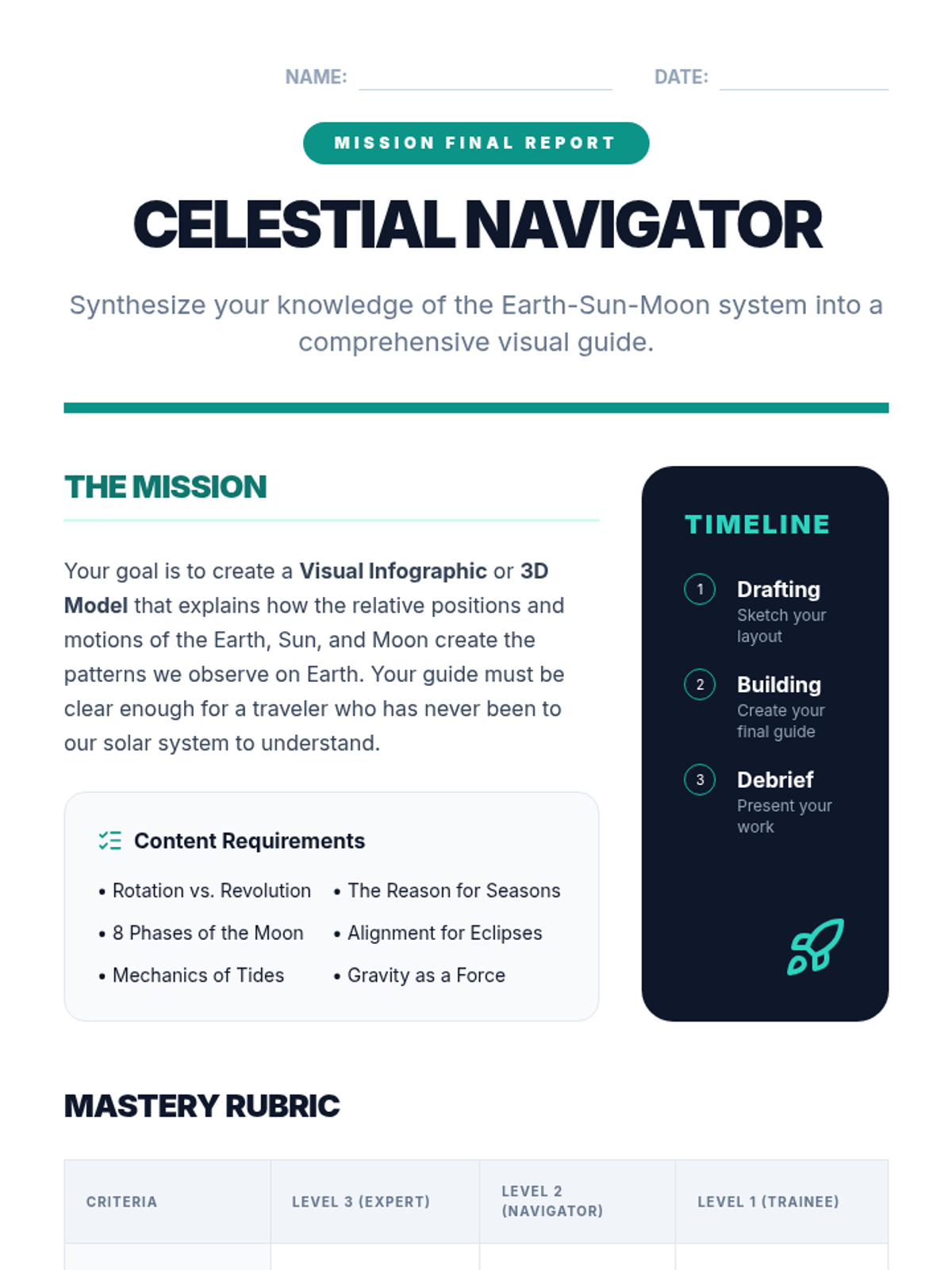 A comprehensive 5-lesson sequence for 6th-grade students to master Earth-Sun-Moon interactions. Students will use spatial reasoning and scientific modeling to explain rotation, revolution, seasons, moon phases, eclipses, and tides through kinesthetic activities, data analysis, and visual synthesis.