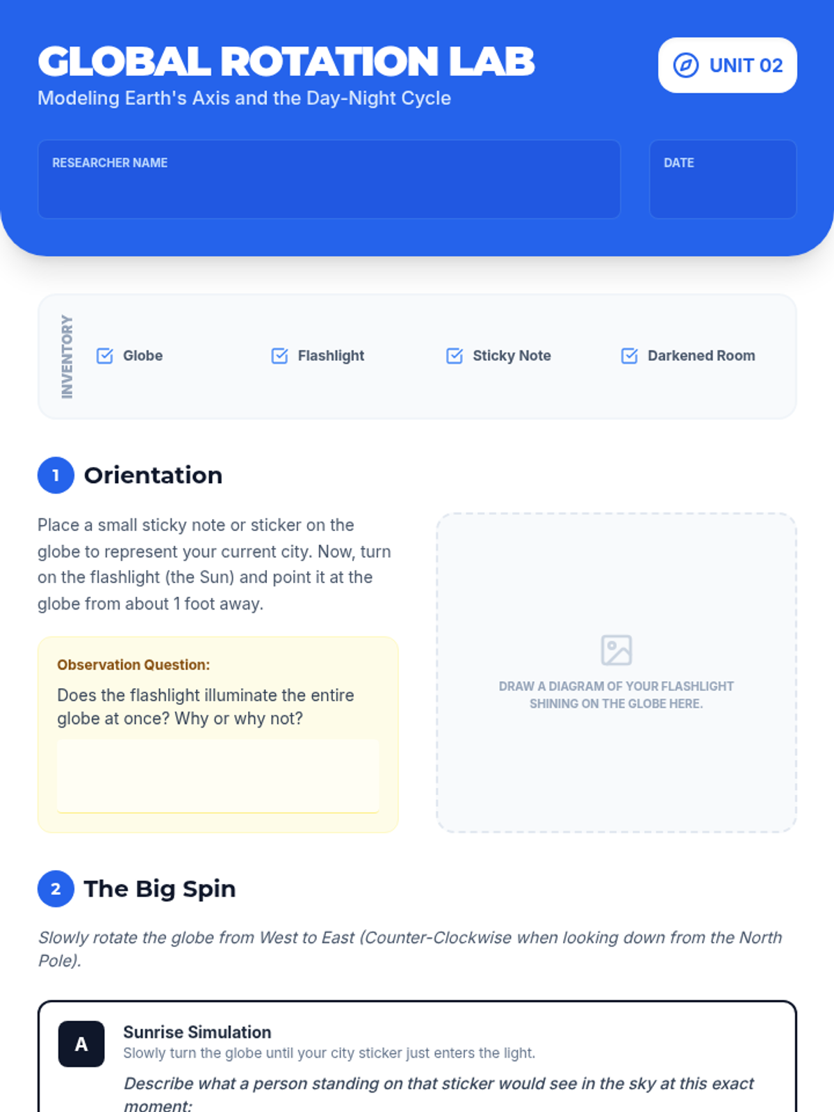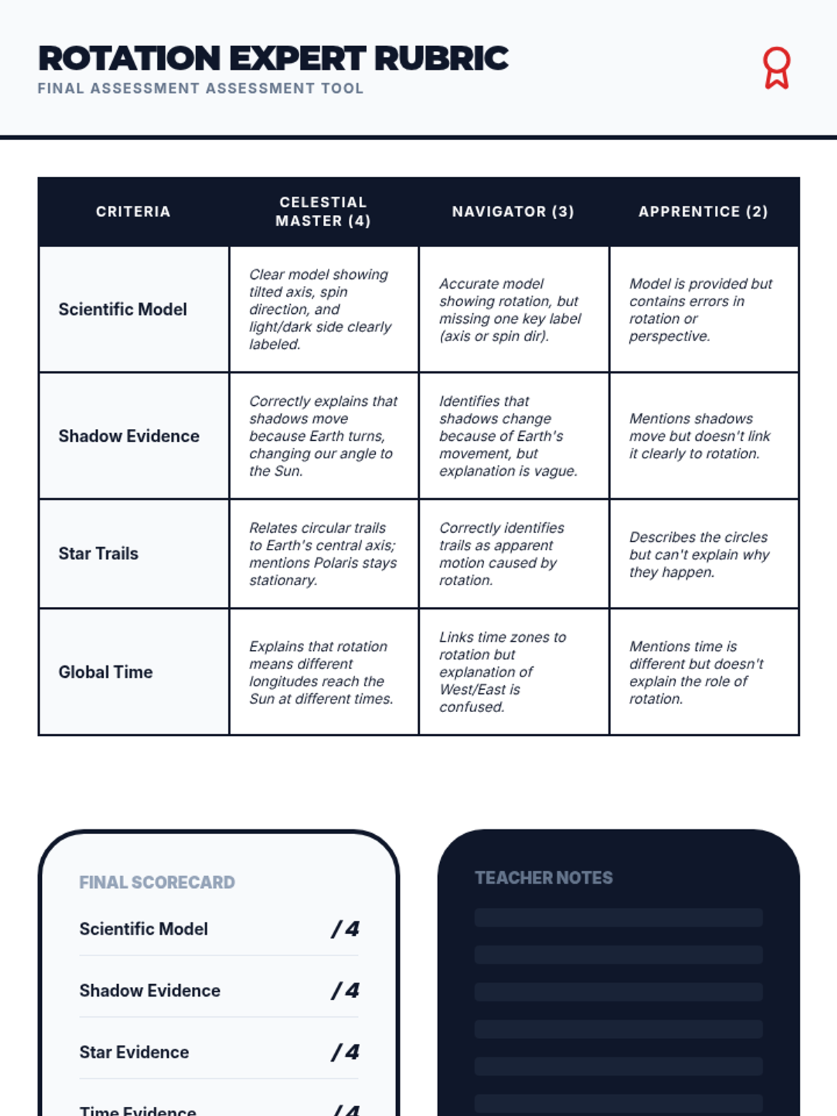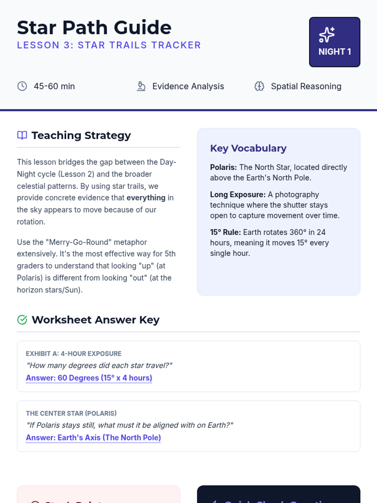 This 5th-grade astronomy sequence explores how Earth's rotation creates observable patterns like moving shadows, day and night, and apparent star movement. Students use hands-on tracking, physical modeling, and data analysis to transition from a geocentric observation to a heliocentric understanding of our planet's spin.