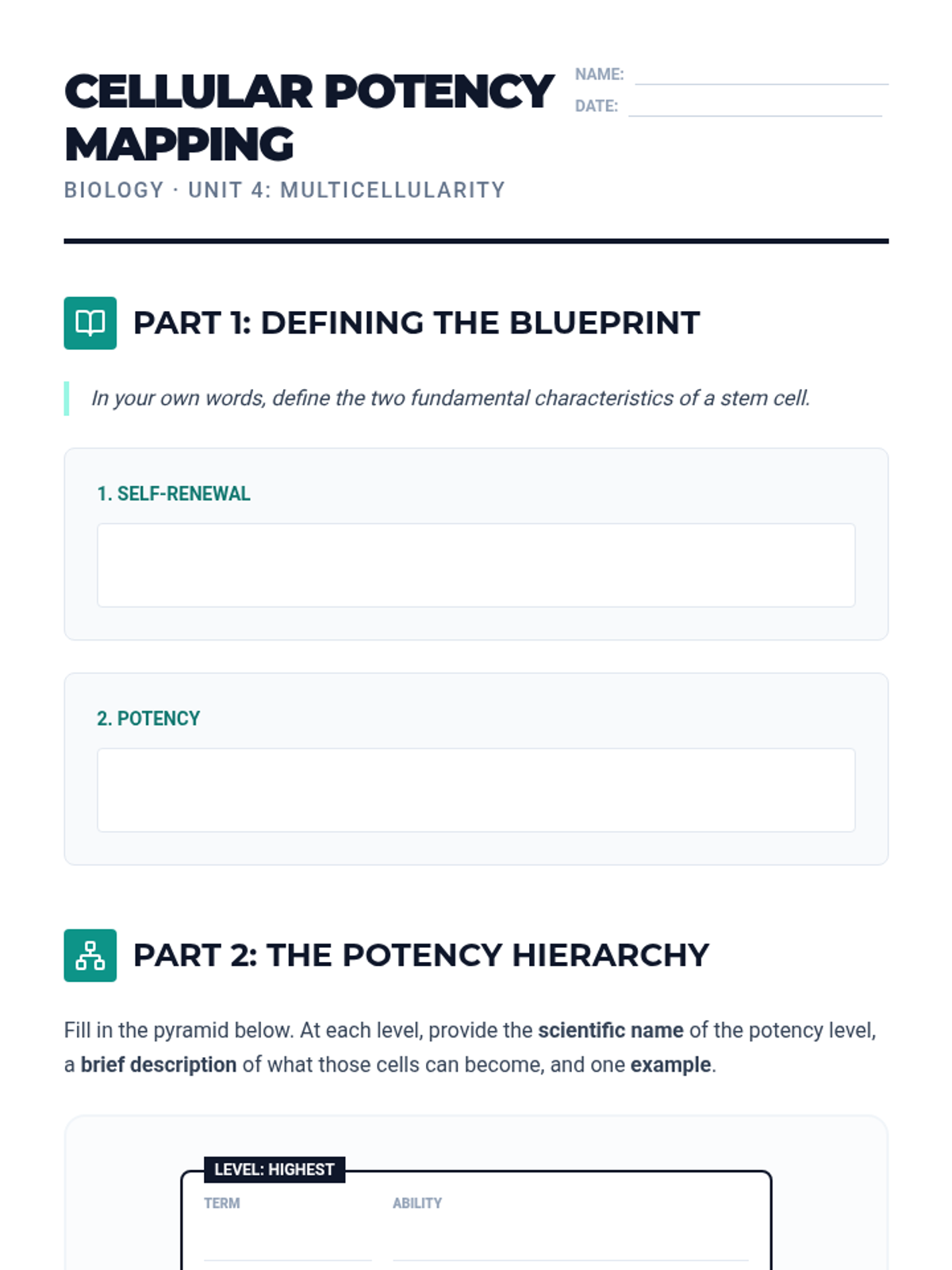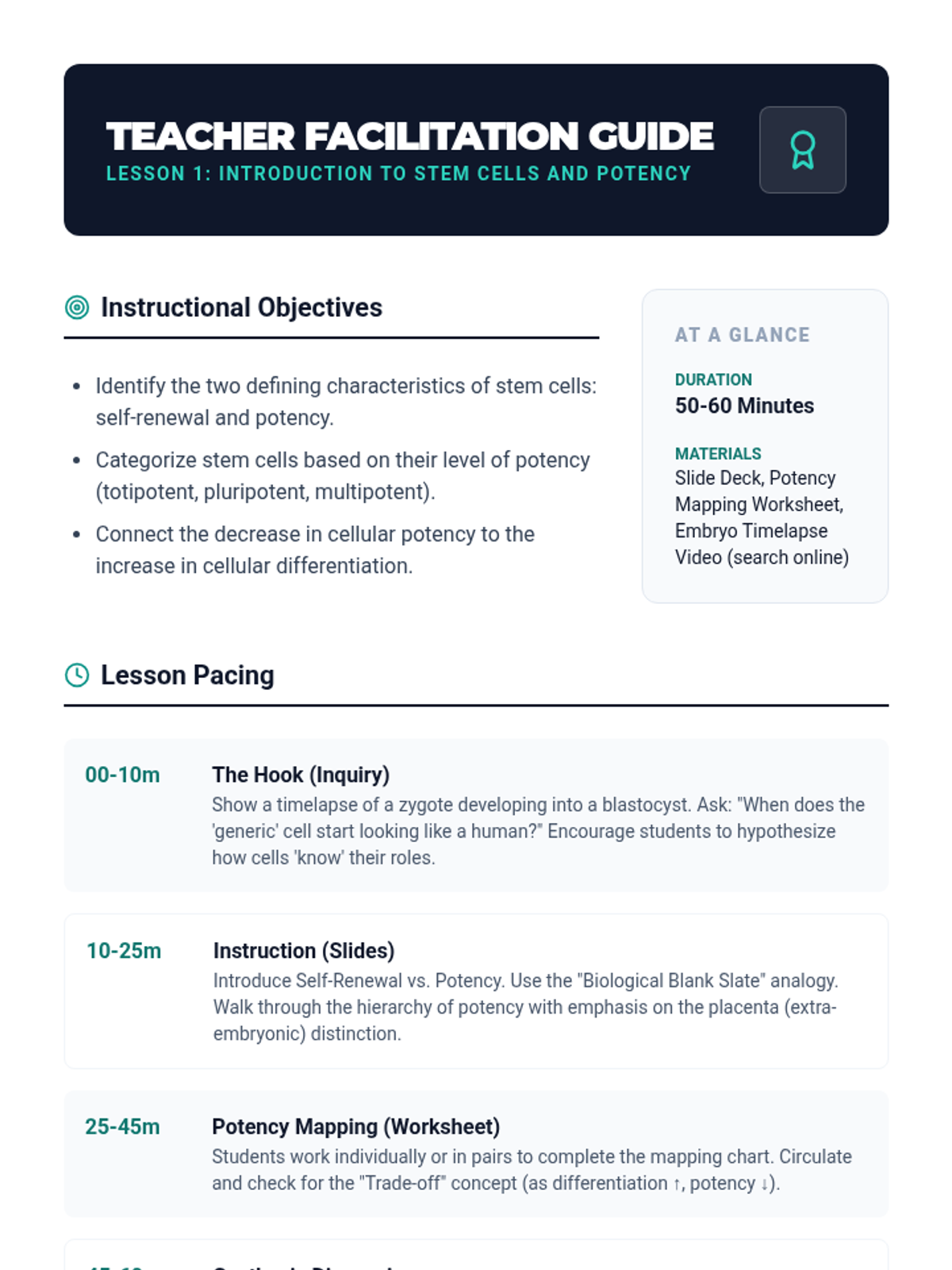 This inquiry-driven sequence guides students through the biological mechanisms that allow a single zygote to develop into a complex, multicellular organism. Students investigate the role of stem cells, the gene regulation processes that dictate cell specialization, and the implications of regulatory failure.