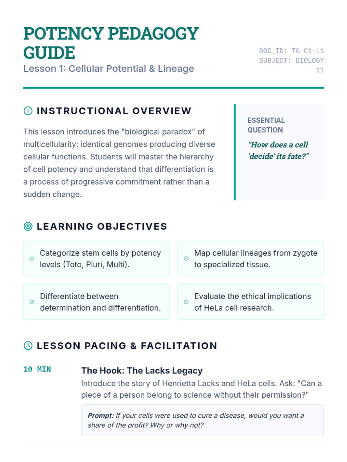 A comprehensive 11th-grade biology sequence exploring how a single zygote differentiates into a complex multicellular organism through gene regulation, specialization, and the implications of cellular dysfunction.