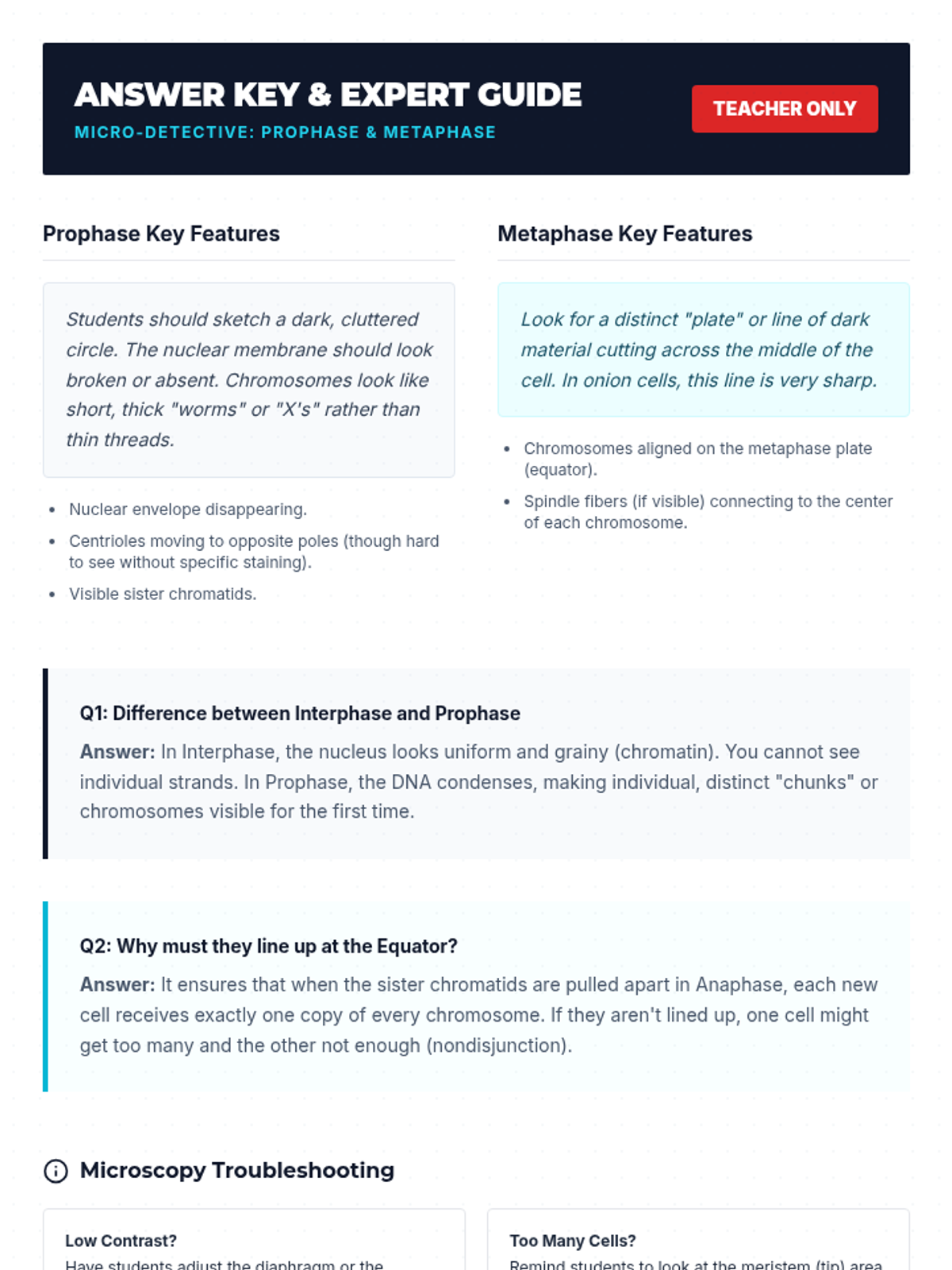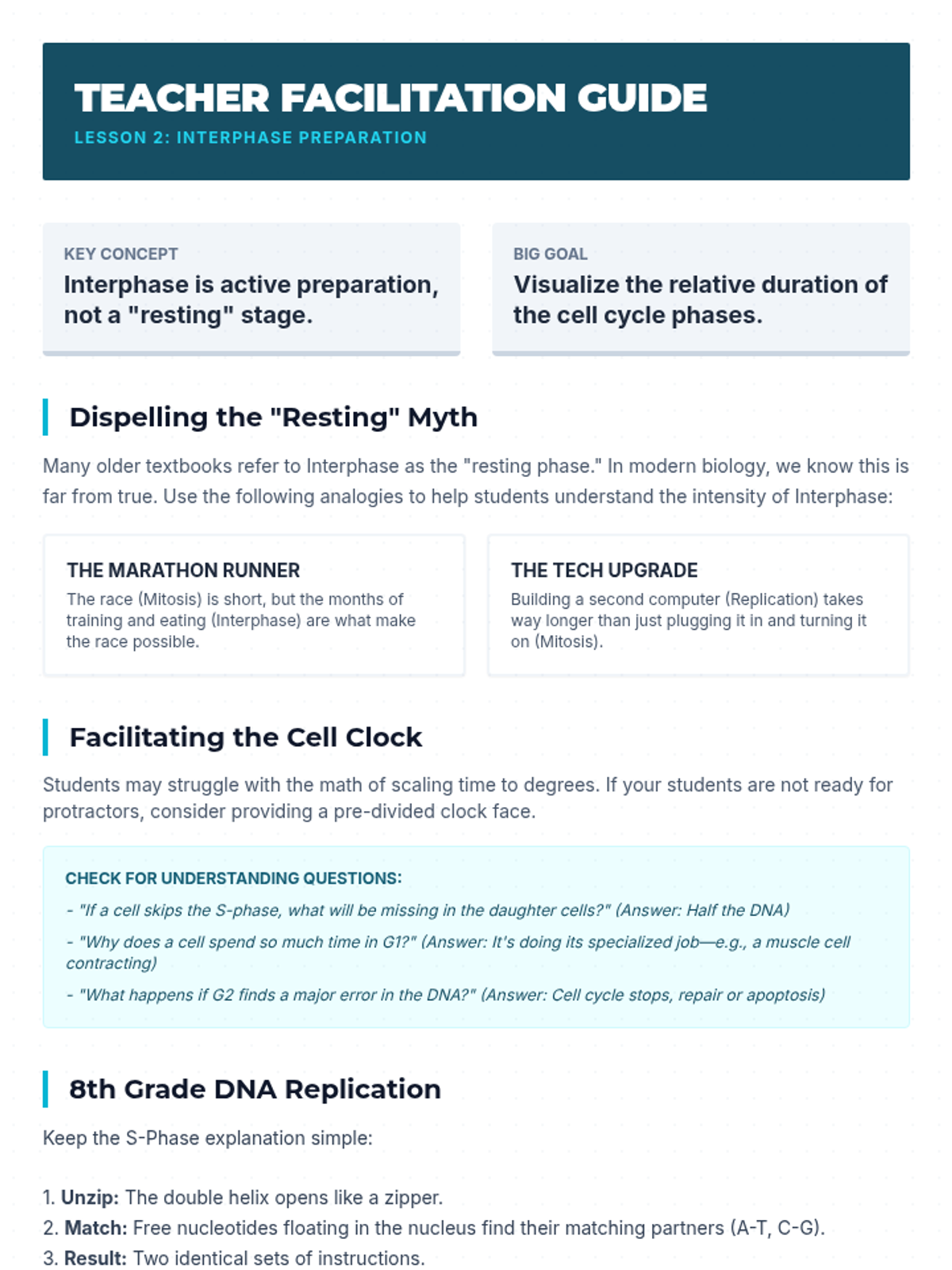 This sequence introduces the fundamental concepts of the cell cycle and mitosis for 8th-grade students. Learners explore why cells must remain small, how they prepare for division during interphase, and the precise mechanical stages of somatic cell replication. The unit culminates in a creative stop-motion project where students synthesize their understanding of the biological 'blueprint' for growth and repair.