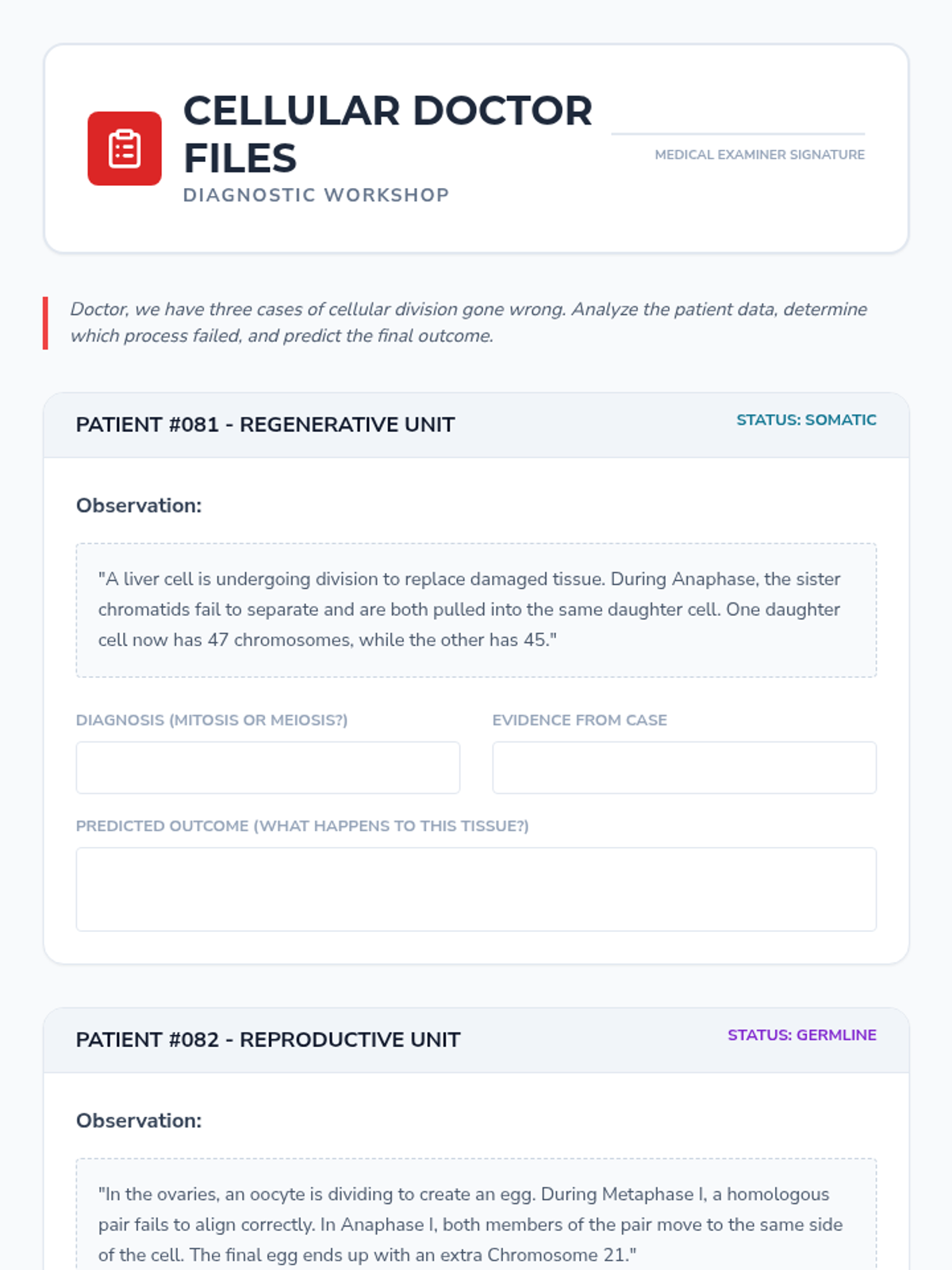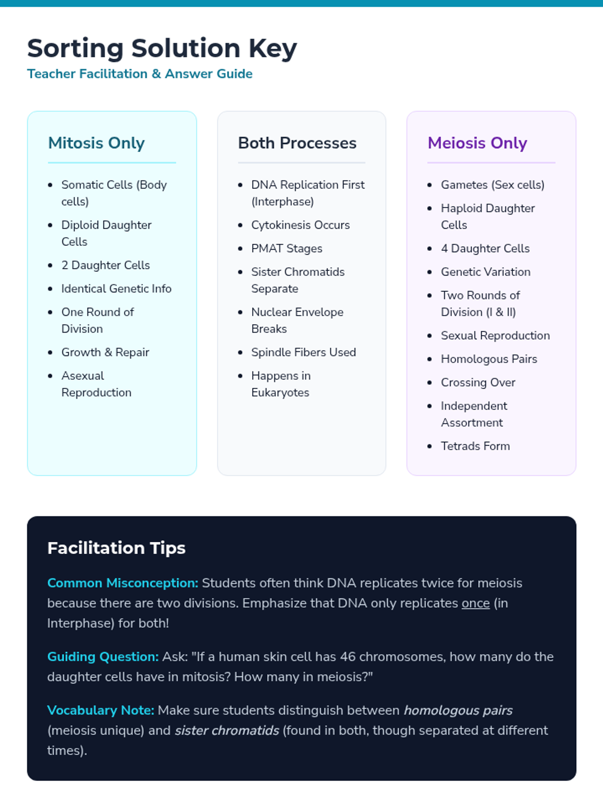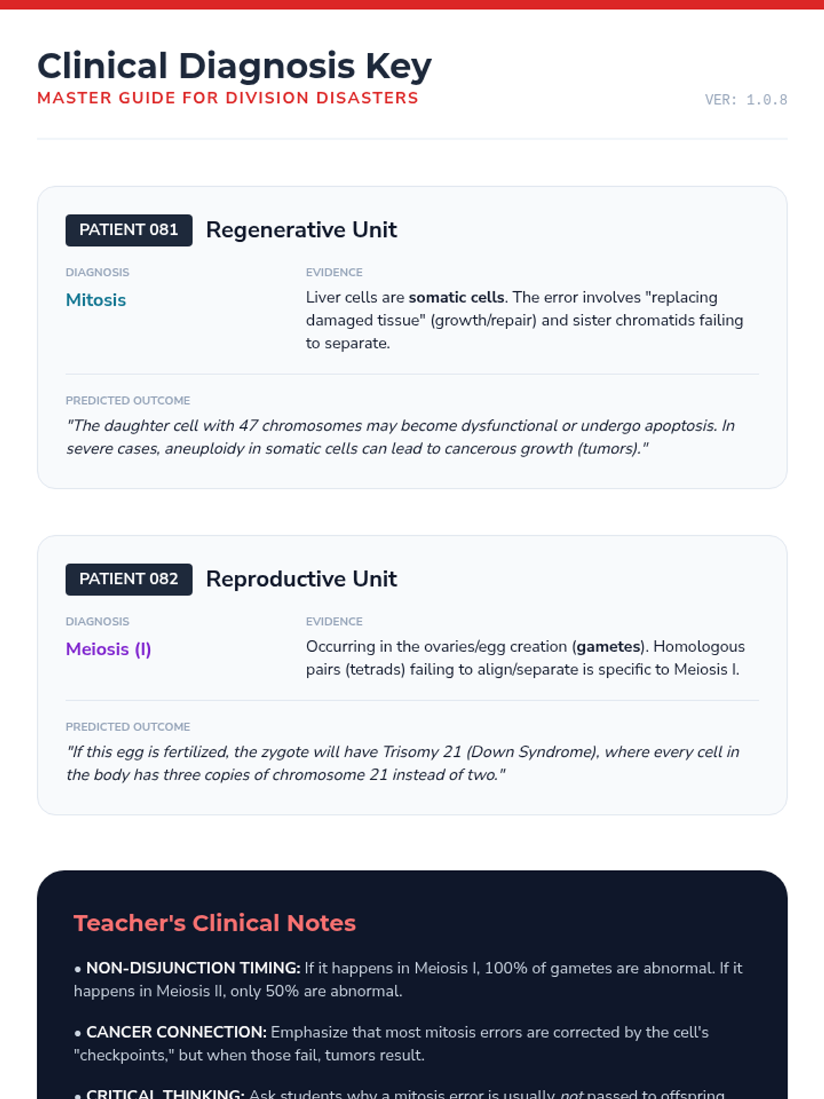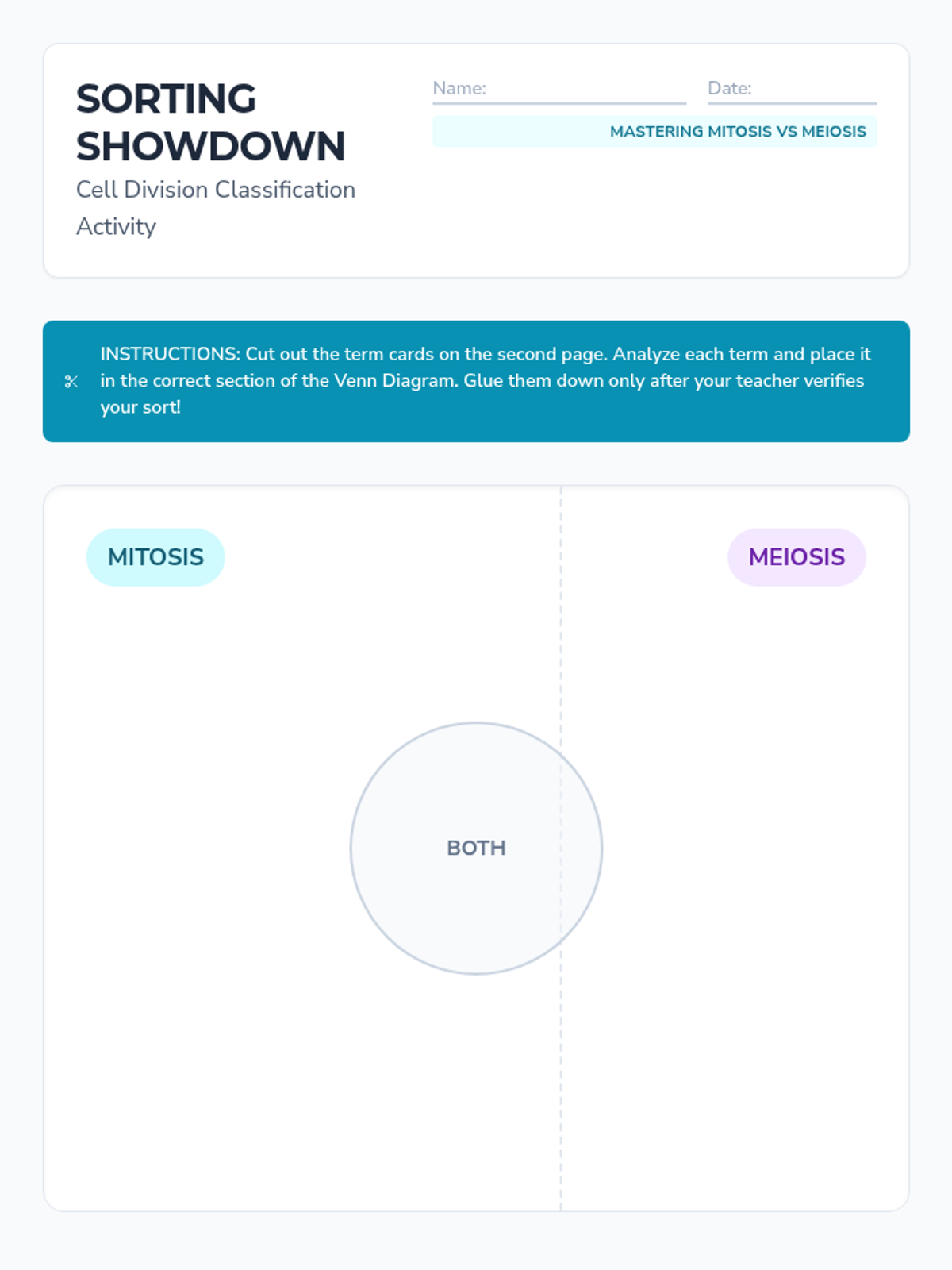 A comprehensive 8th-grade unit comparing mitosis and meiosis through classification, visual identification, error analysis, and real-world organism studies. Students master the distinct purposes and outcomes of cellular division for growth versus reproduction.
