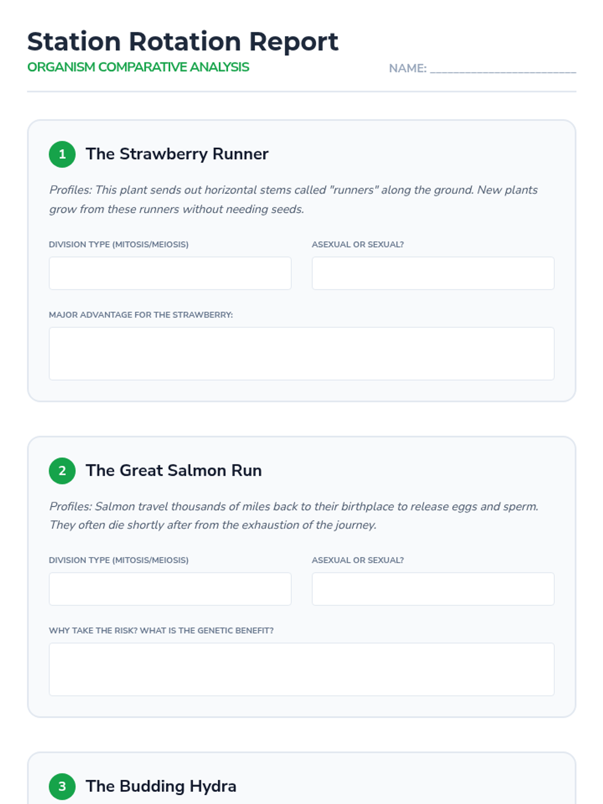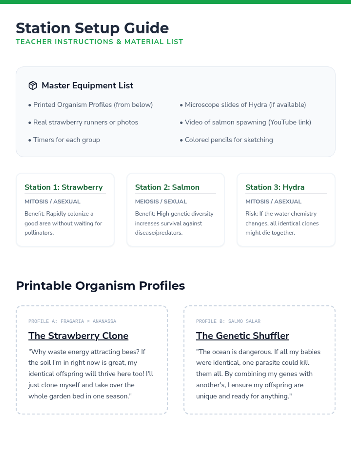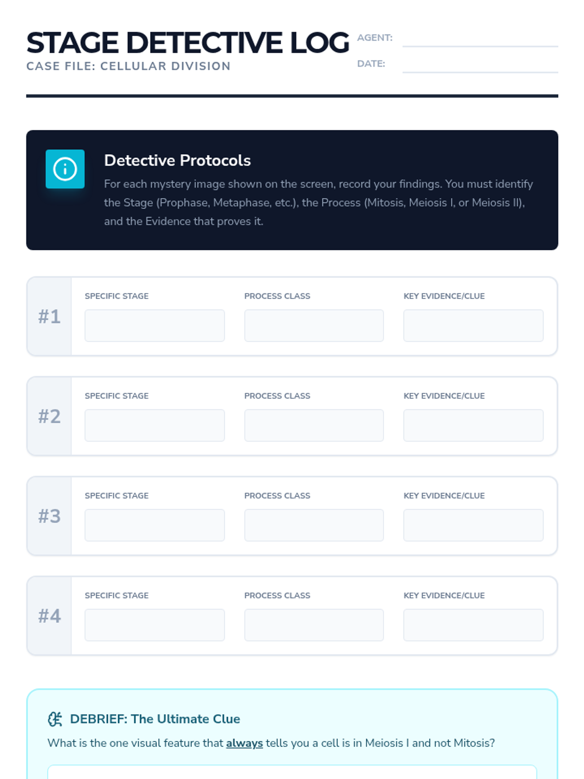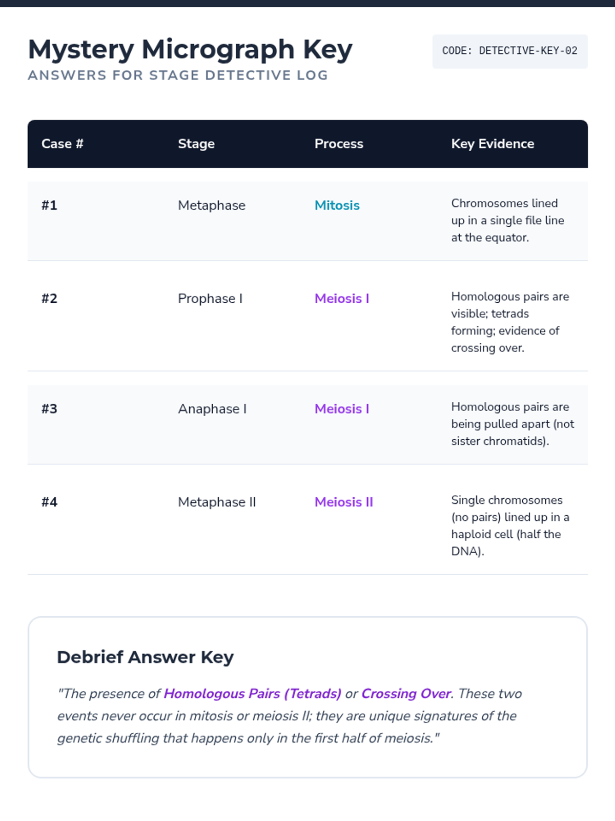 A comprehensive 8th-grade unit comparing mitosis and meiosis through classification, visual identification, error analysis, and real-world organism studies. Students master the distinct purposes and outcomes of cellular division for growth versus reproduction.