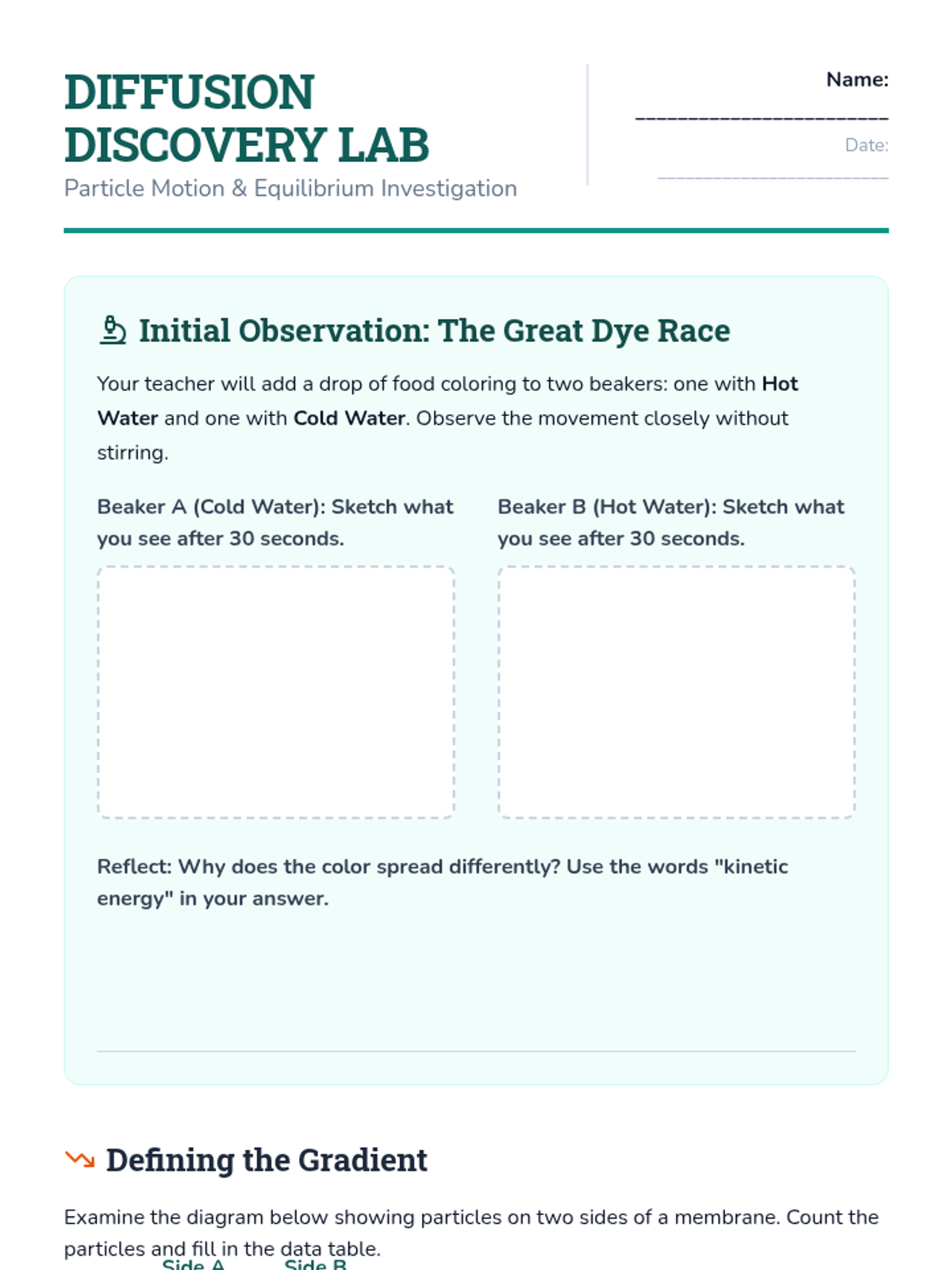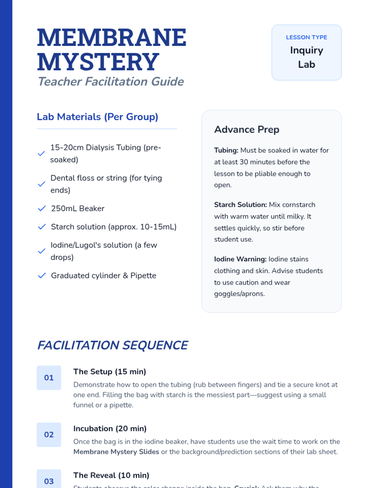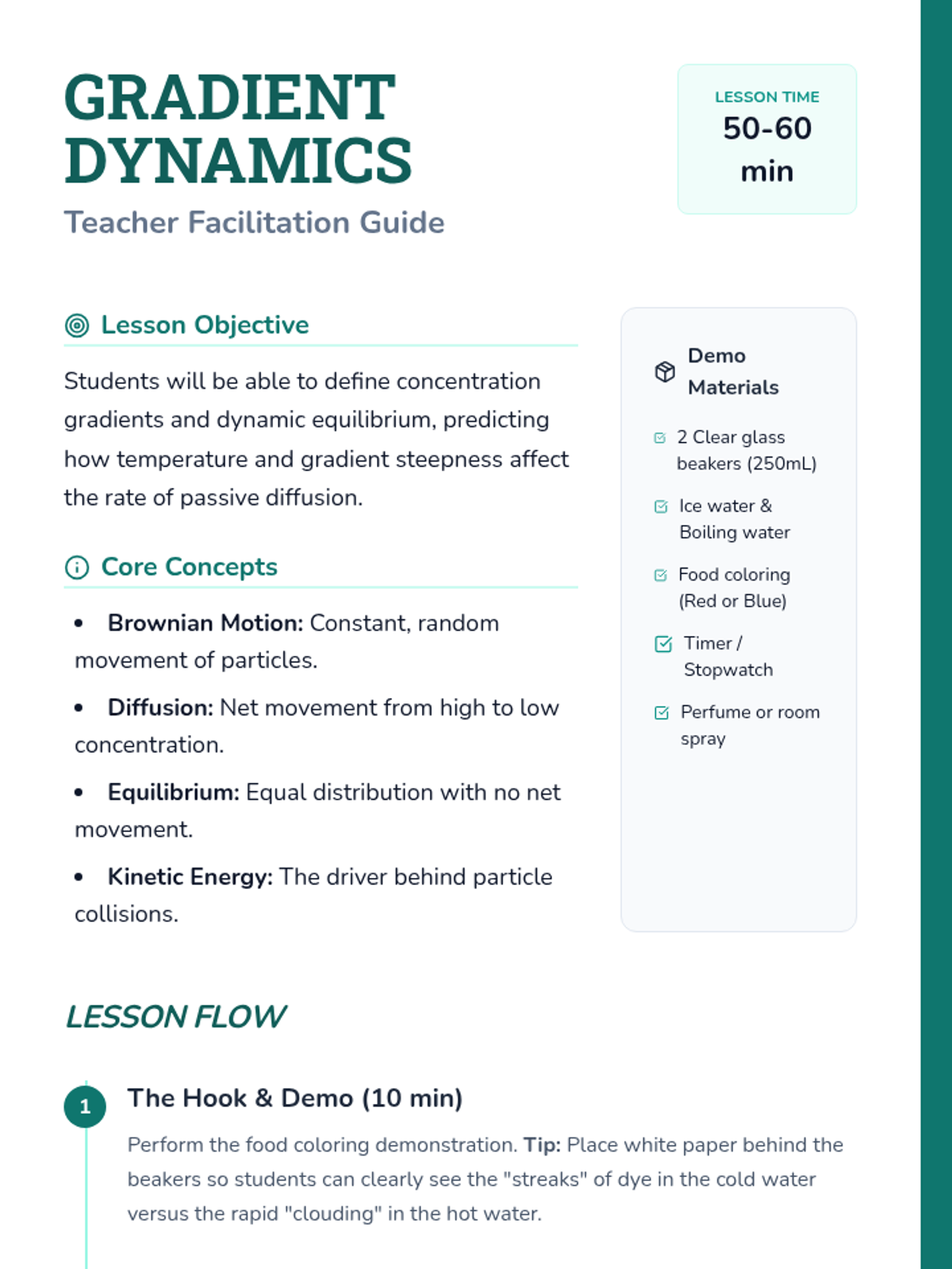 An exploration of passive transport, diffusion, and osmosis. Students investigate how concentration gradients drive molecular movement across selectively permeable membranes through hands-on labs and mathematical modeling.