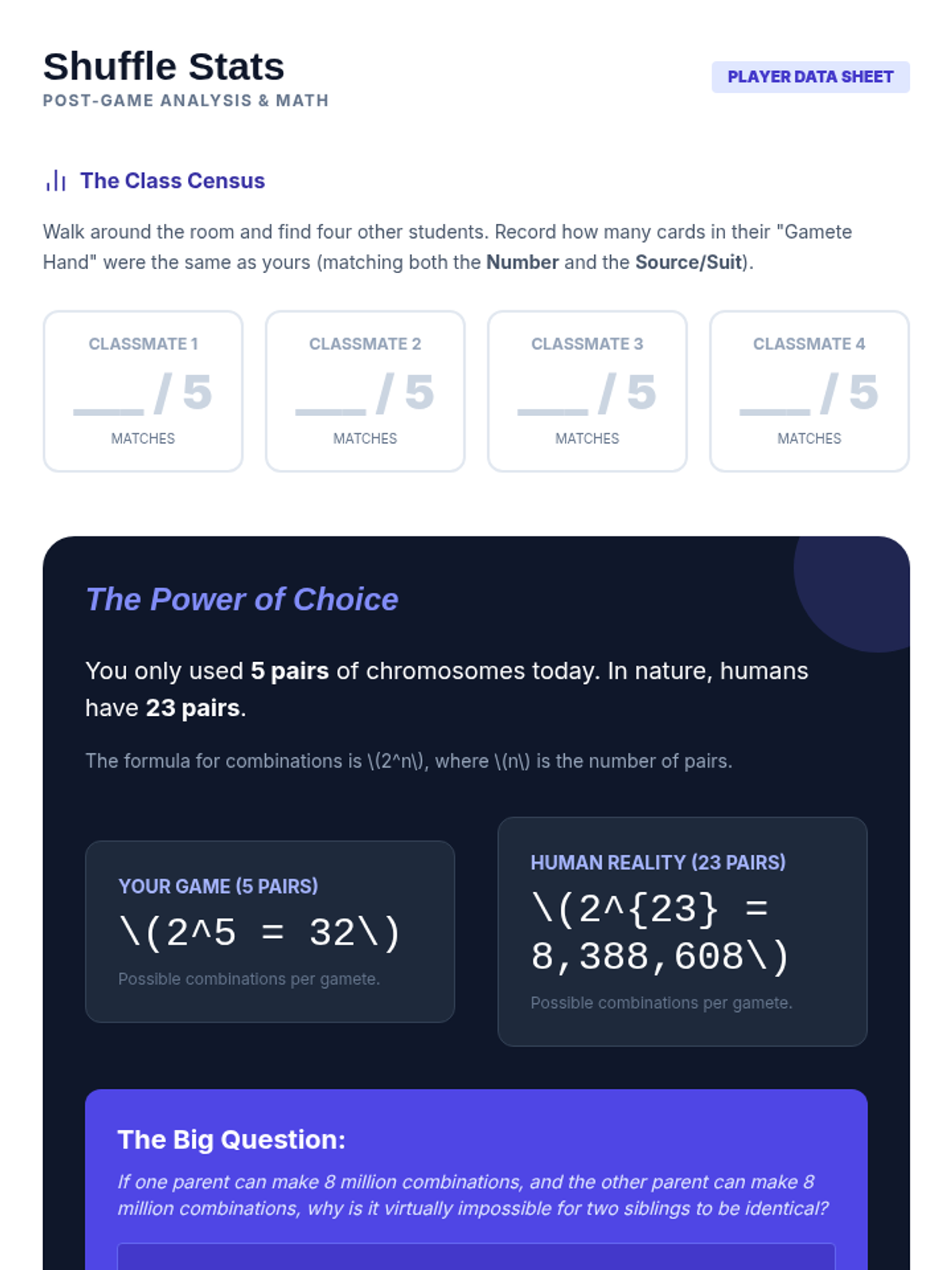 A 5-lesson sequence exploring the differences between sexual and asexual reproduction, specifically comparing mitosis and meiosis. Students use simulations, games, and modeling to understand genetic diversity and the biological importance of unique offspring.