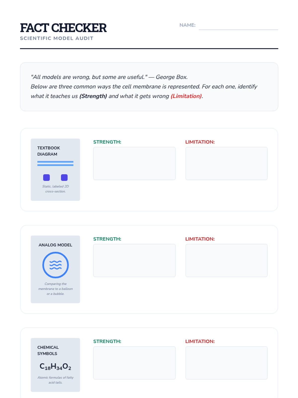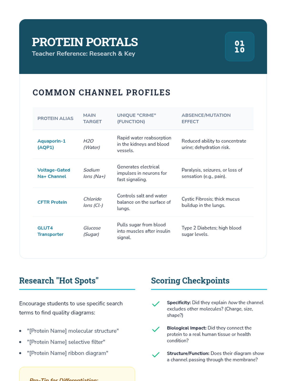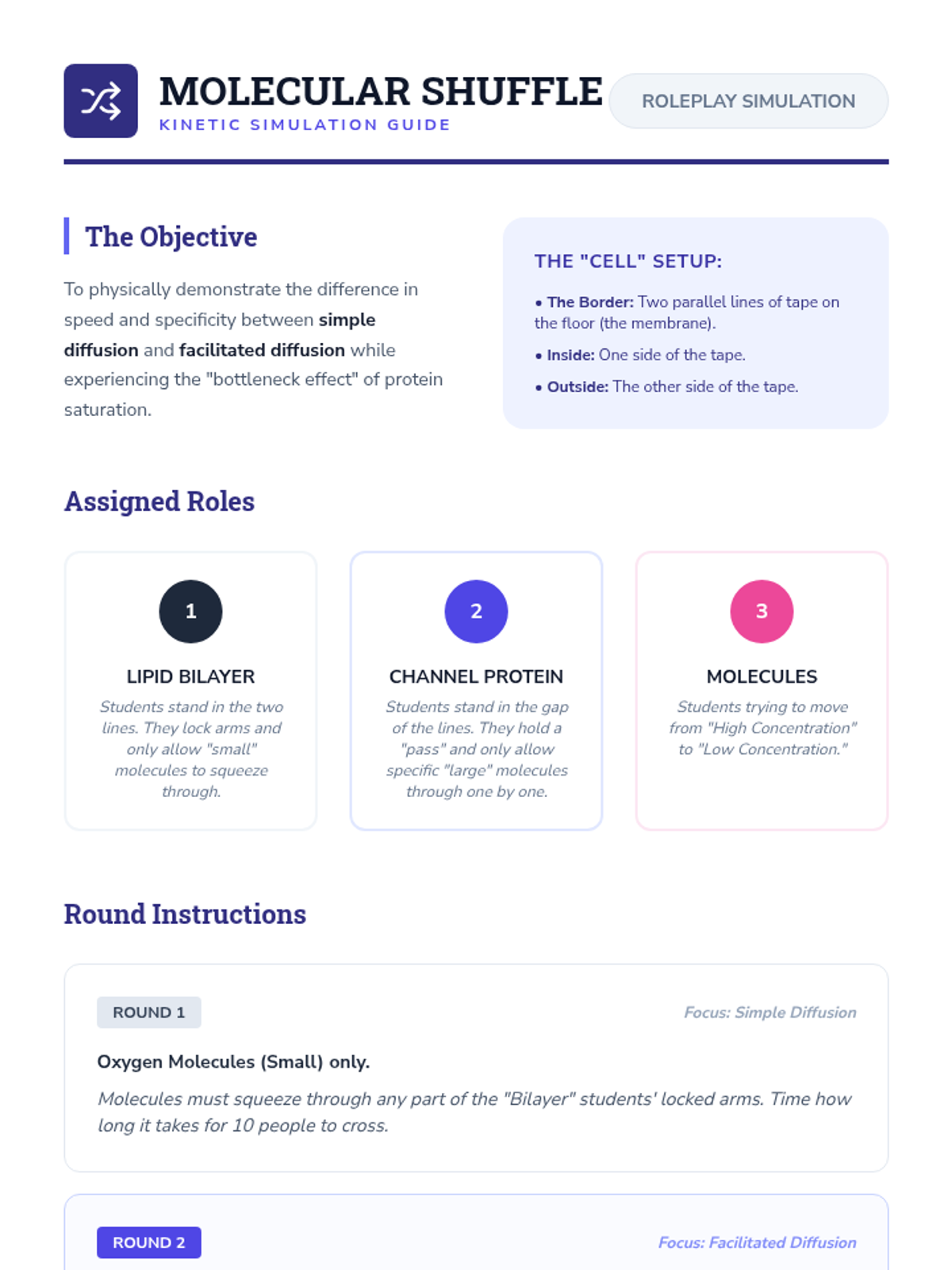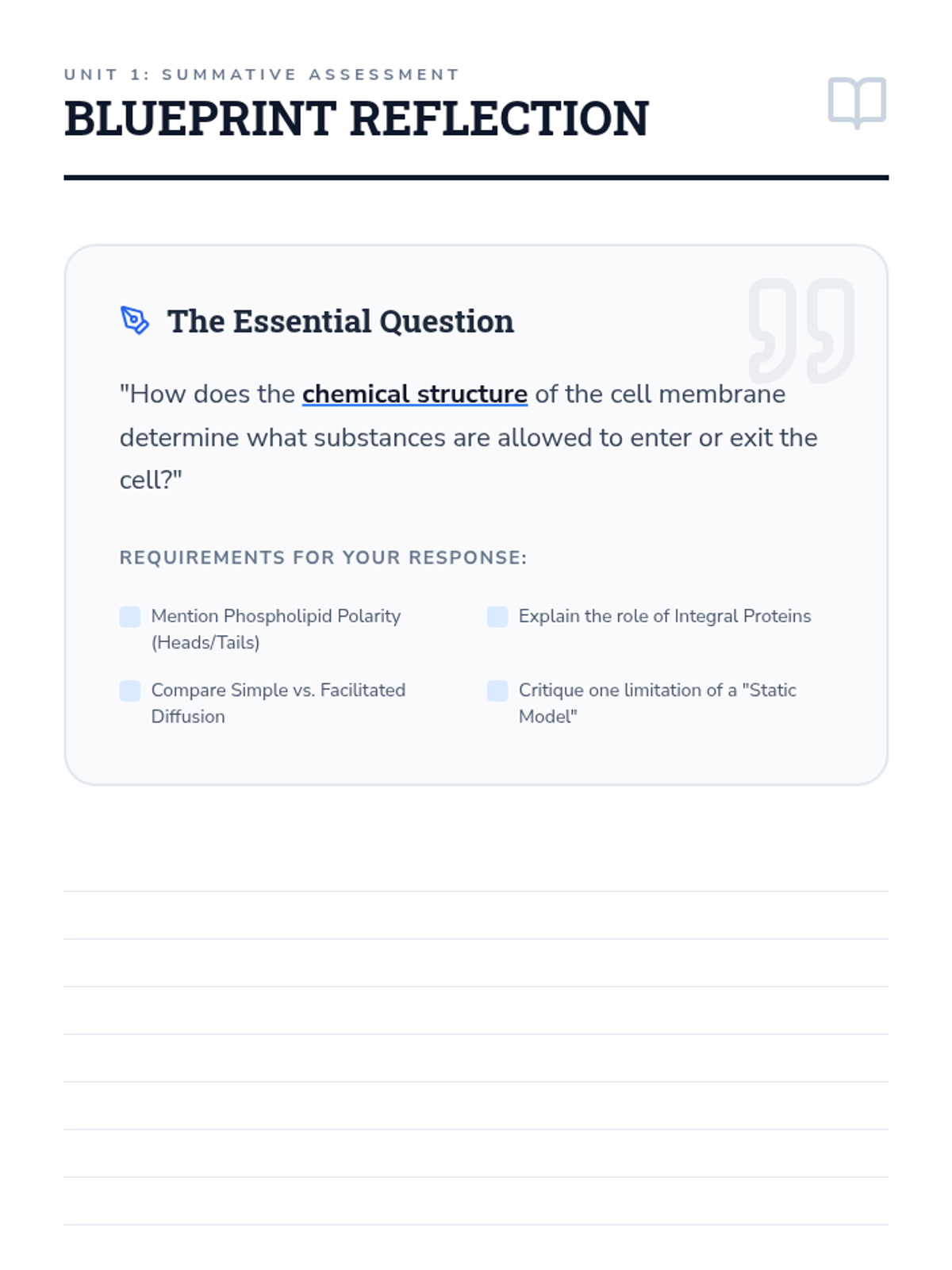 A comprehensive biology sequence for 9th-grade students focusing on the chemistry of phospholipids, the structure of the fluid mosaic model, and the mechanics of facilitated diffusion and specific transport proteins. Students progress from chemical fundamentals to complex system modeling and critical analysis of biological representations.