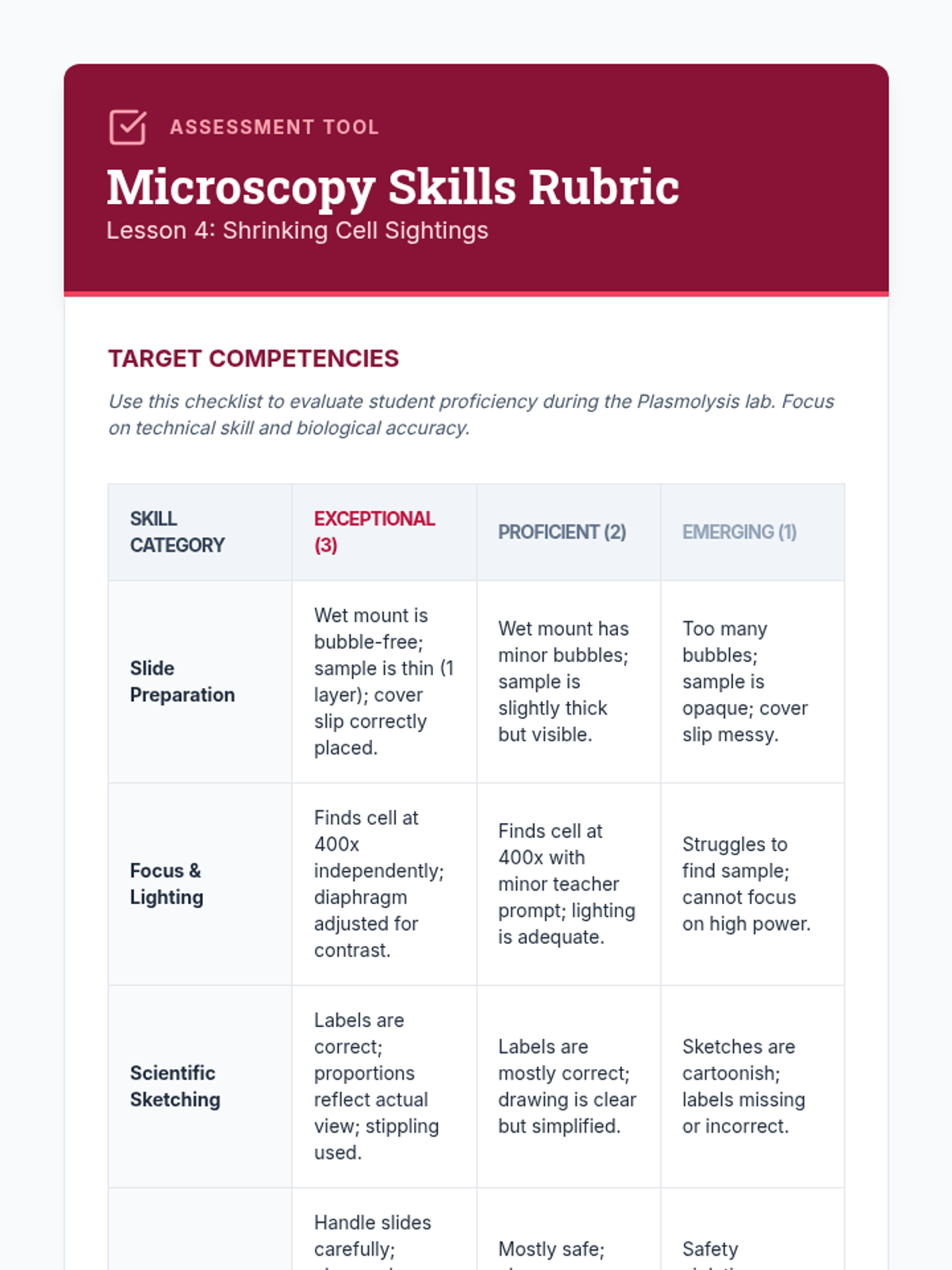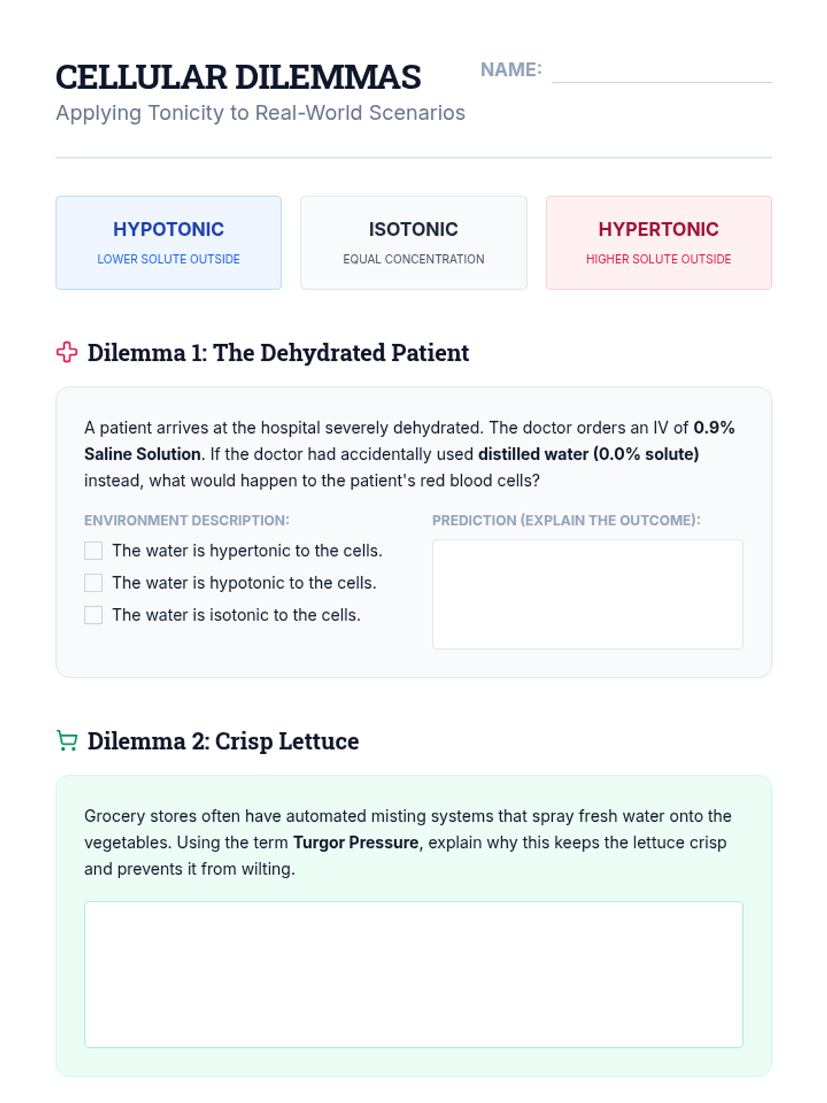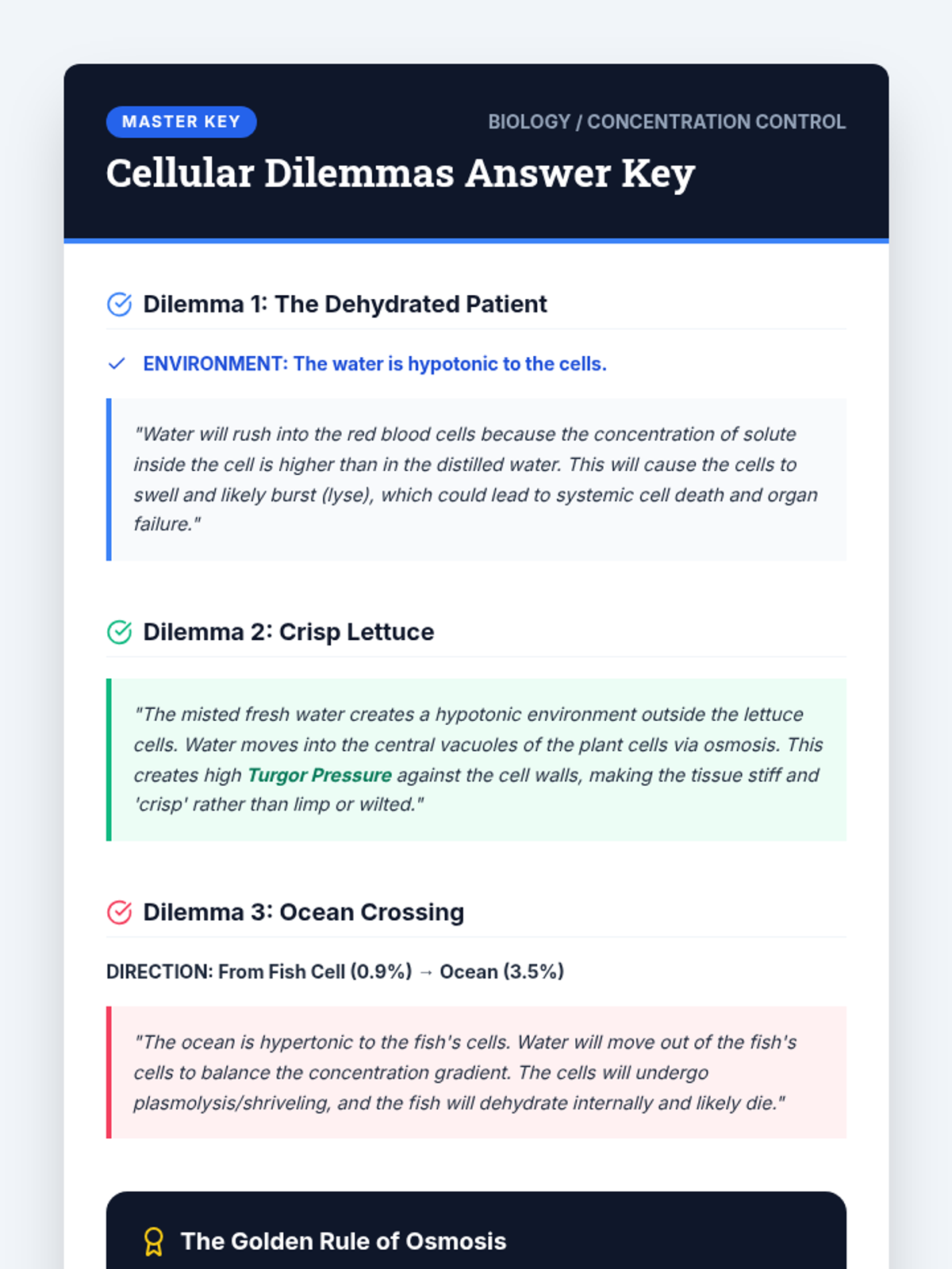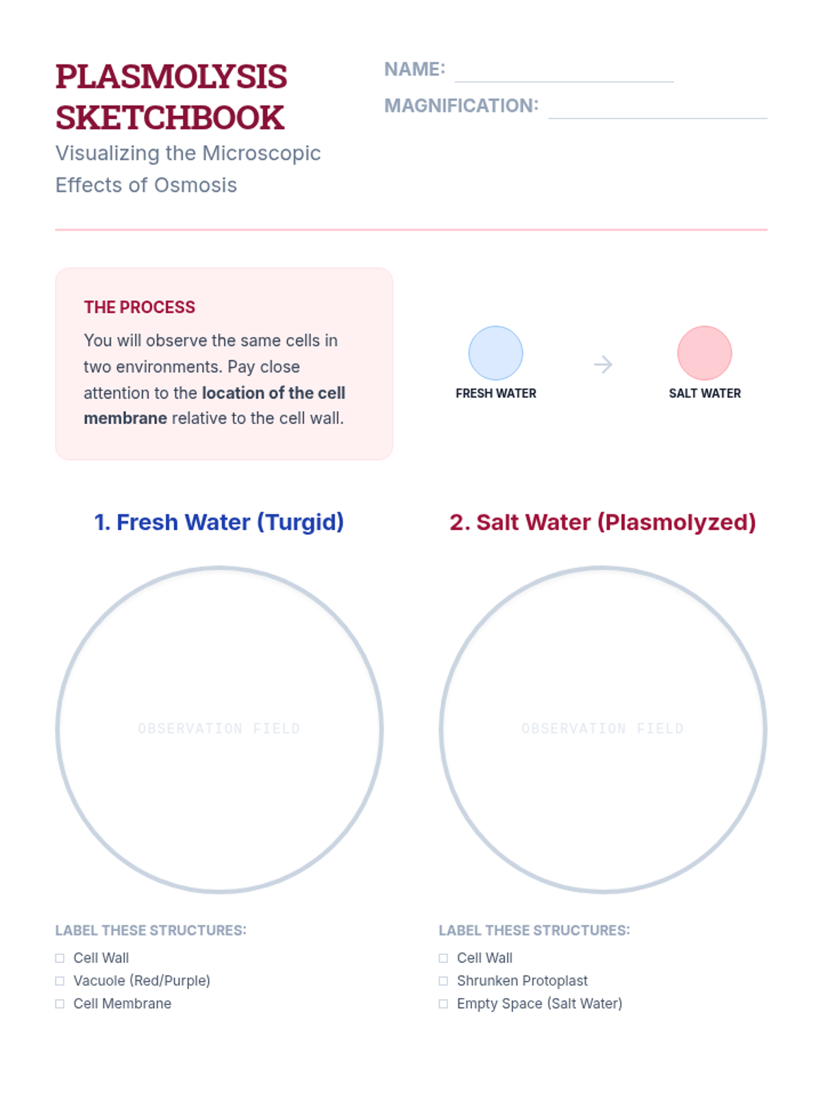 A 10th-grade biology sequence exploring the physical laws of cellular transport through inquiry-based experimentation, data analysis, and microscopic observation. Students progress from simple diffusion to quantitative osmosis experiments and clinical case studies.