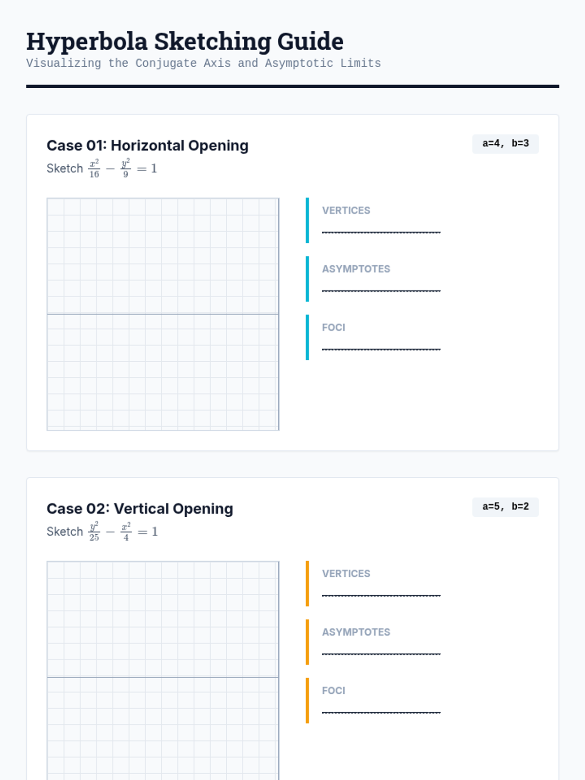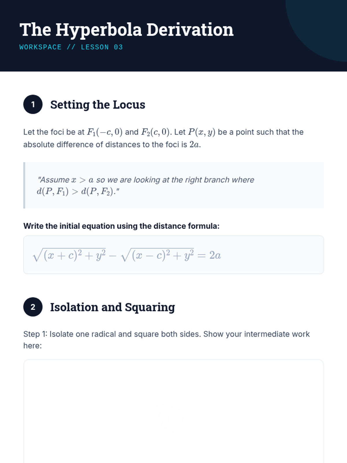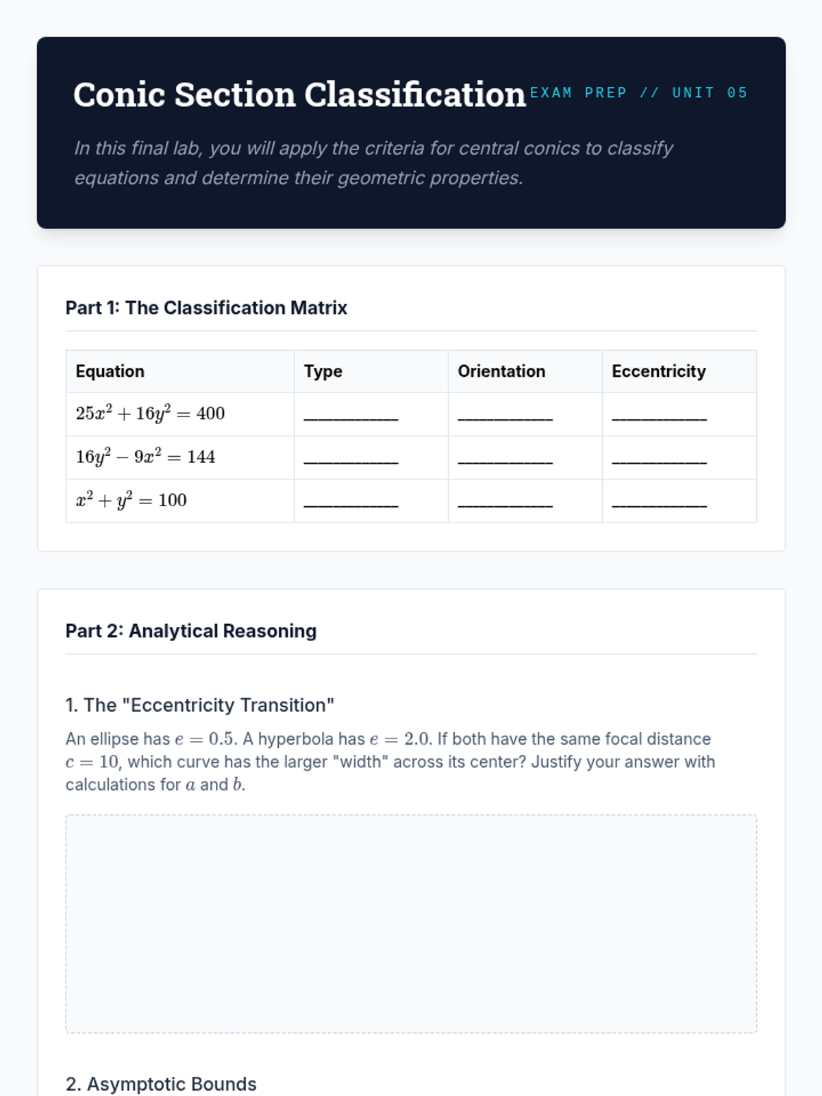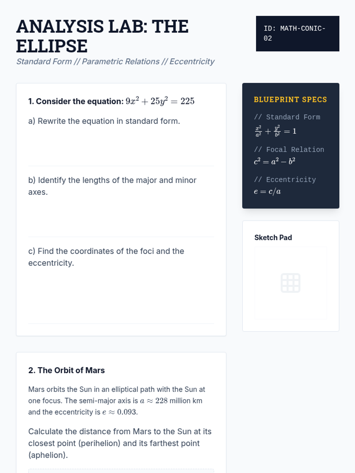 This sequence explores the geometric and algebraic foundations of ellipses and hyperbolas. Students move from locus definitions and dynamic simulations to rigorous algebraic derivations, parameter analysis, and comparative studies of central conics.