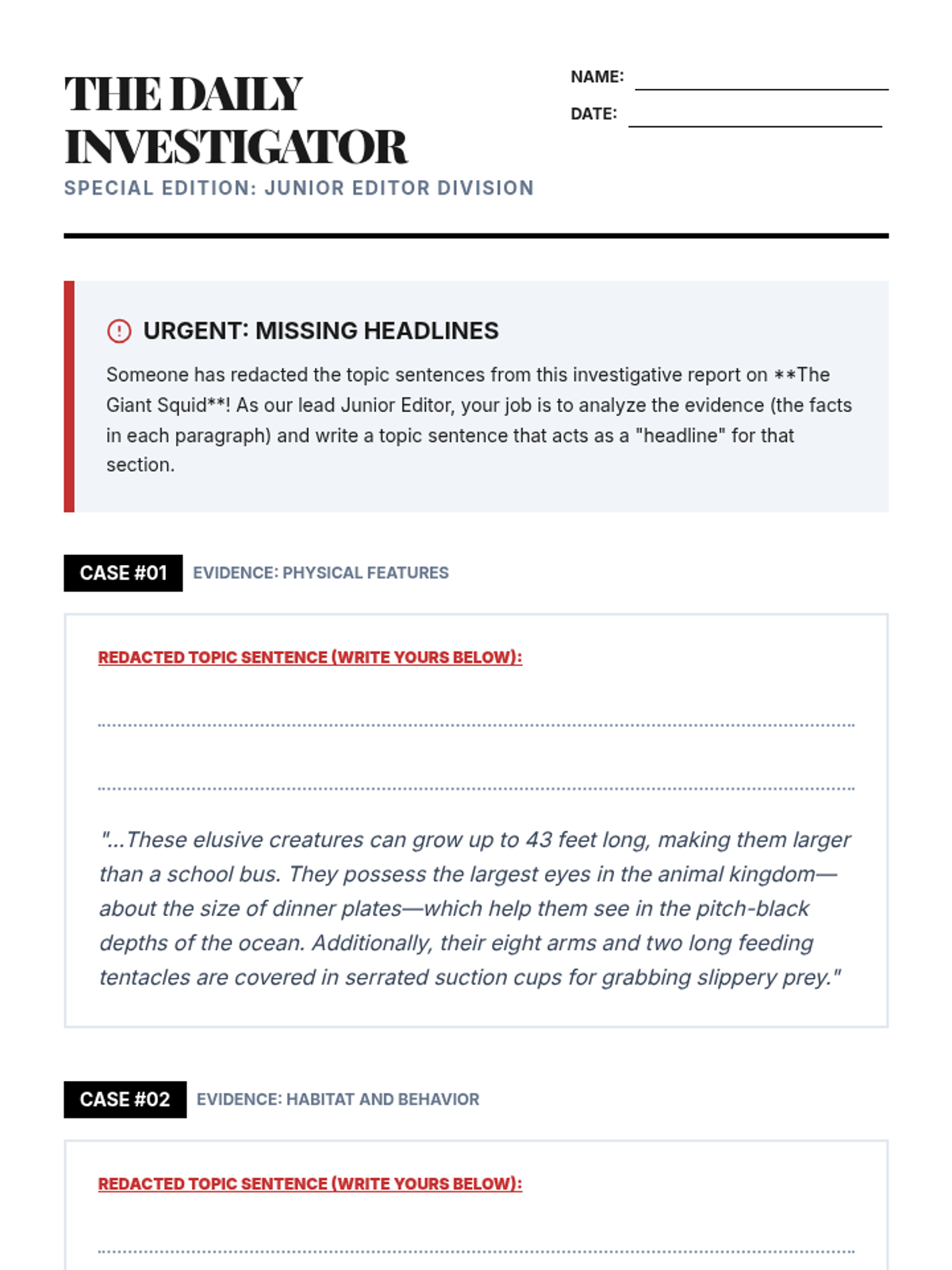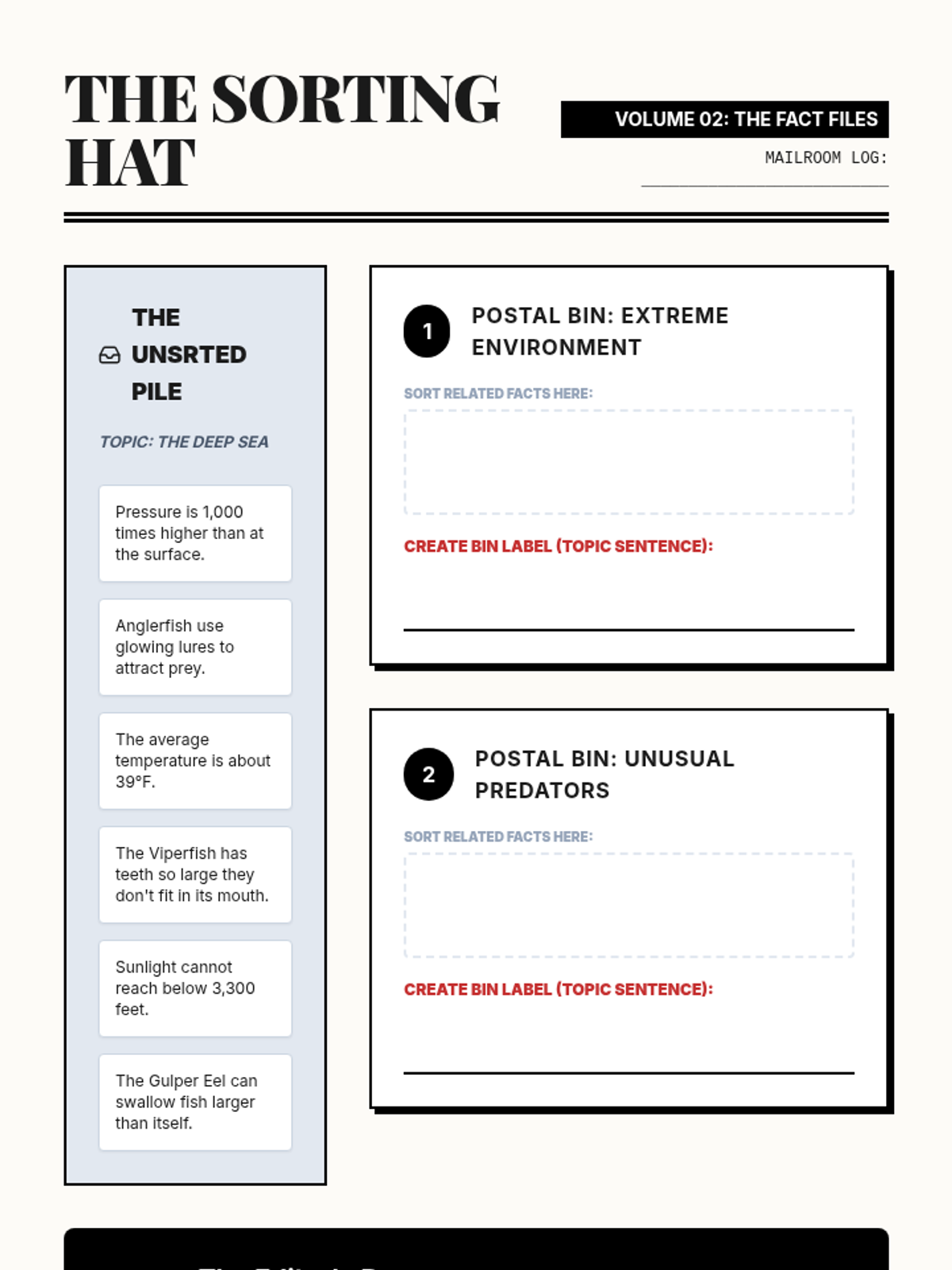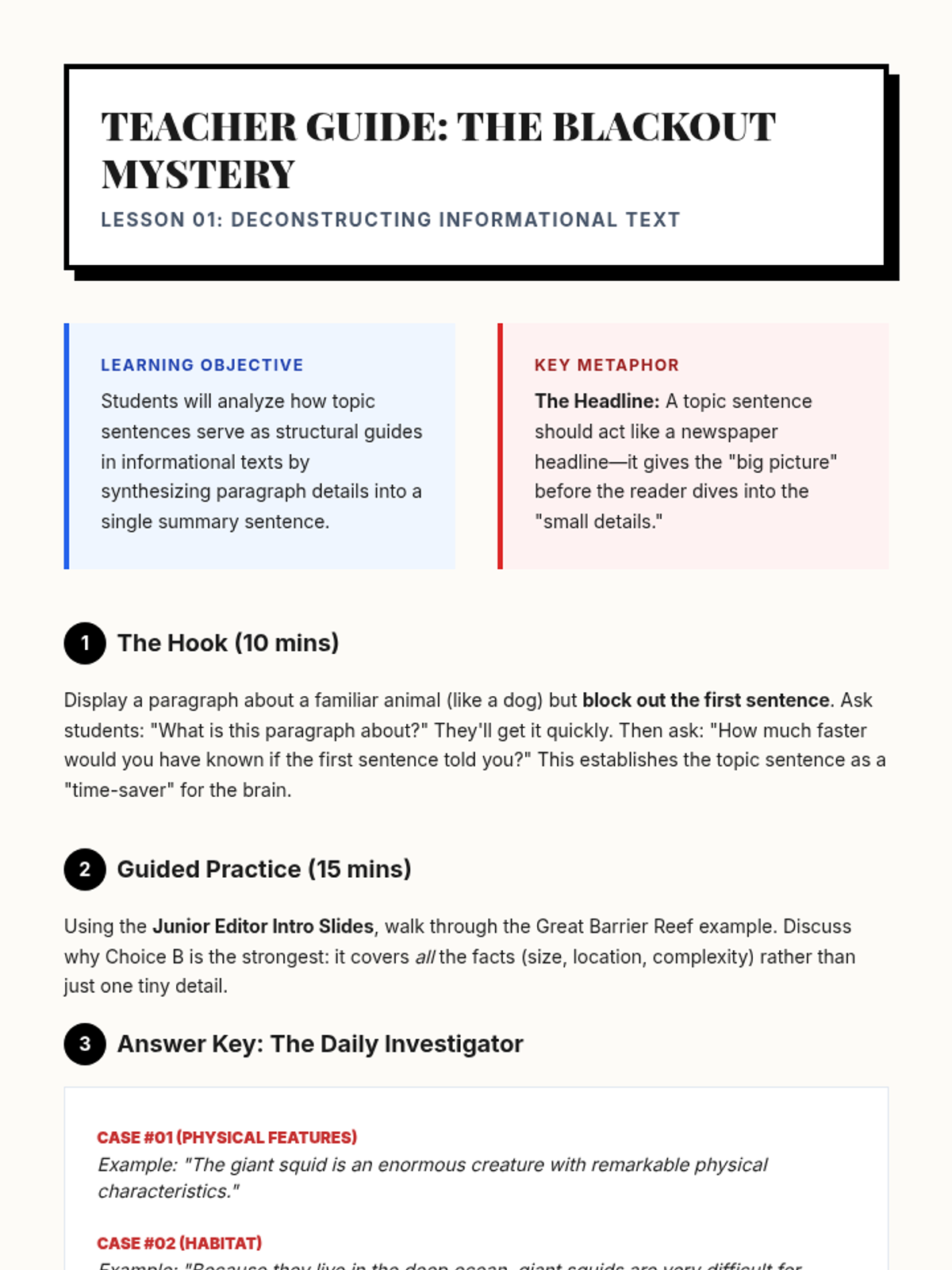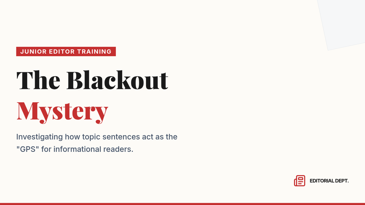 A 5th-grade writing sequence where students act as Junior Editors to master topic sentences and informational thesis statements through deconstruction, sorting, and structural planning.