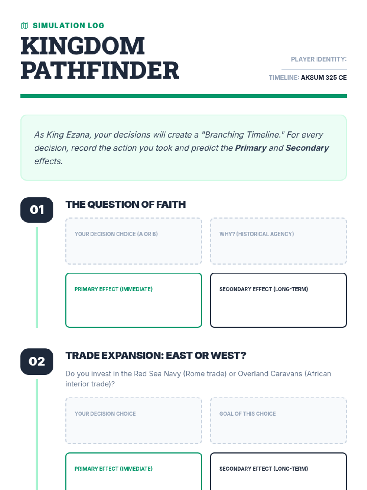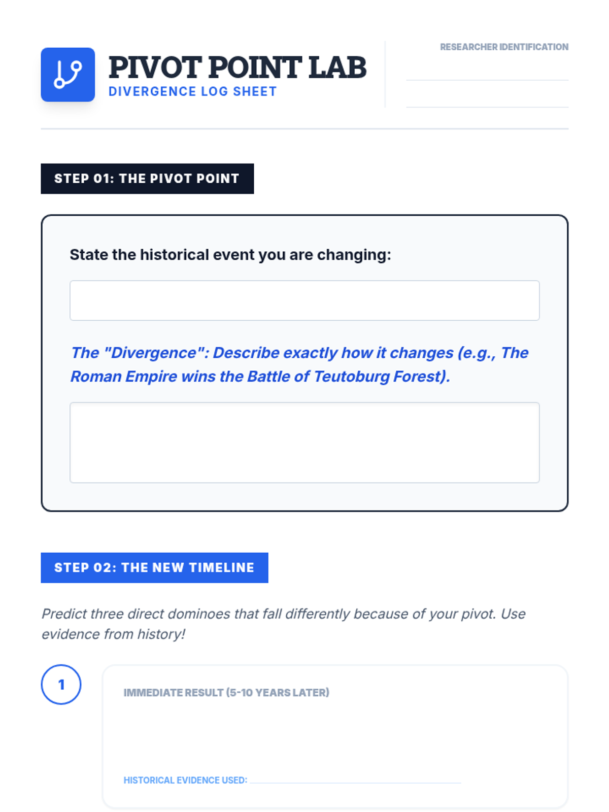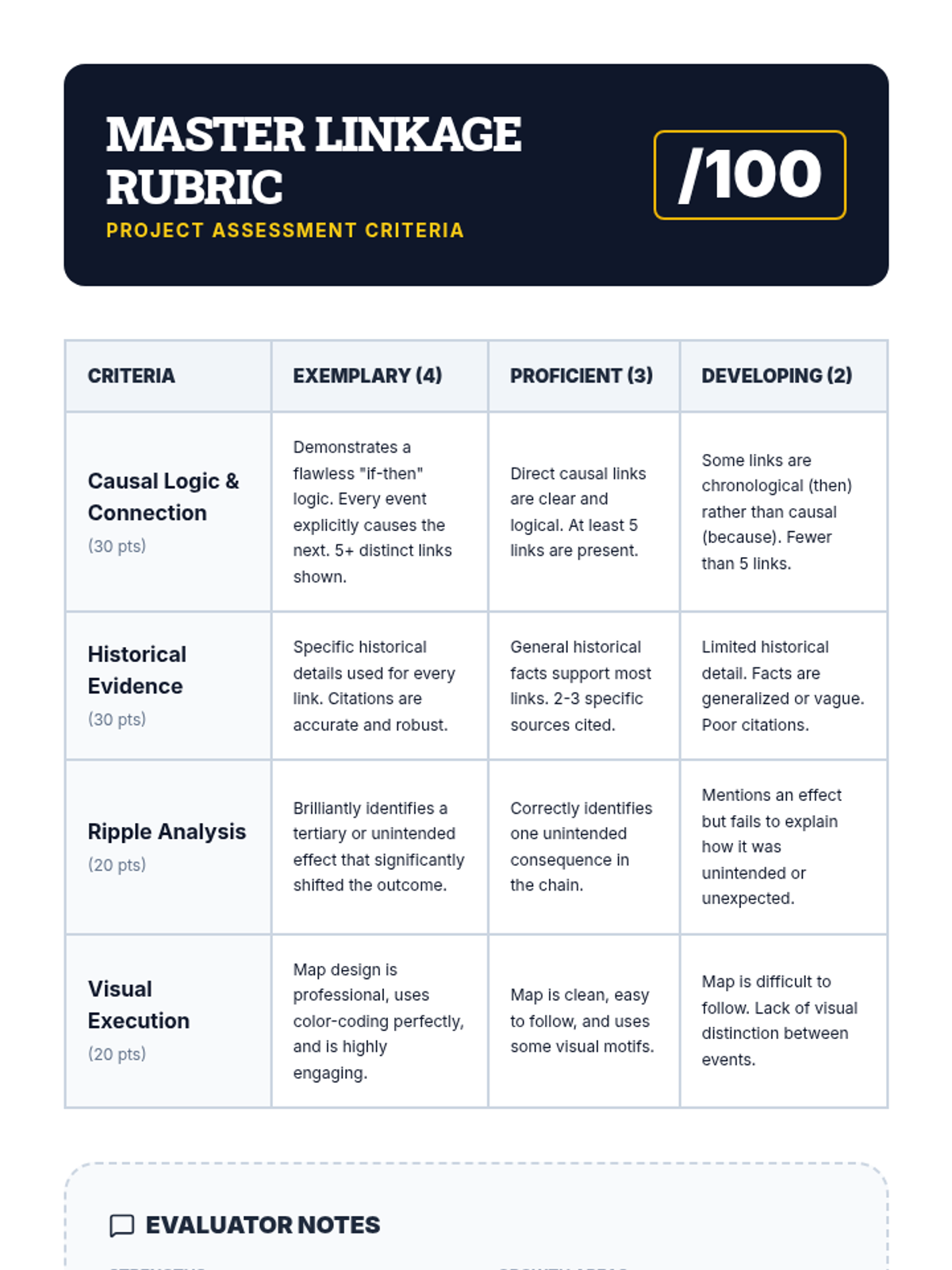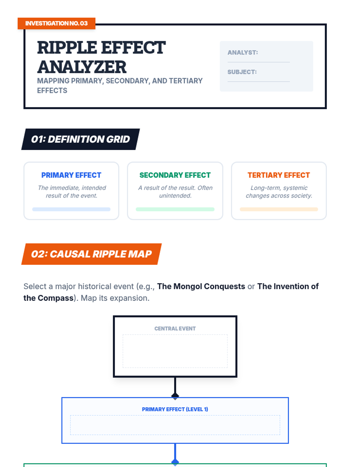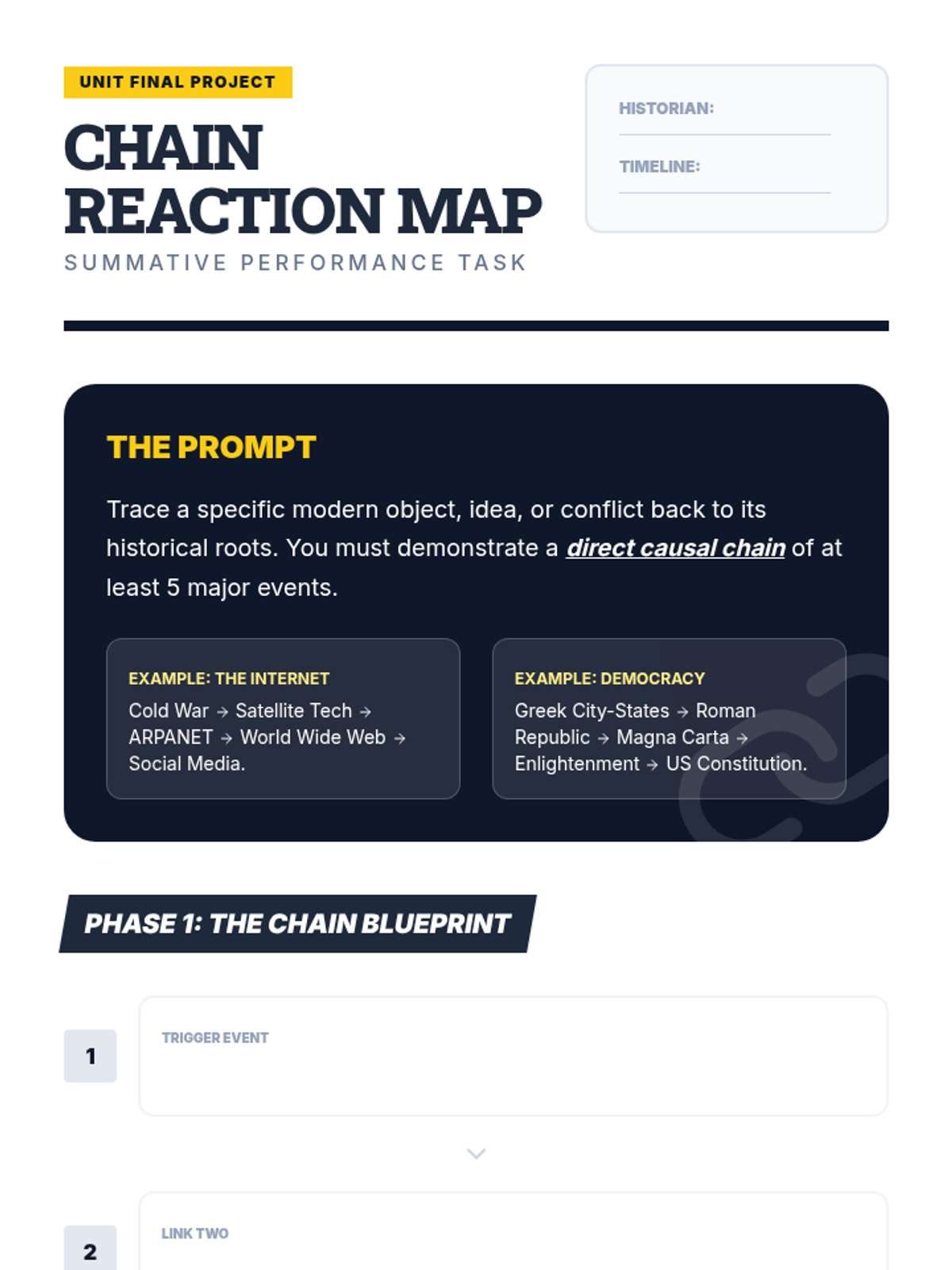 A game-based exploration of chronology and causation for 7th-grade students, focusing on the 'domino effect' of historical events and the power of individual agency. Students use simulations, counterfactual reasoning, and causal mapping to understand how one event triggers a chain of unintended consequences.
