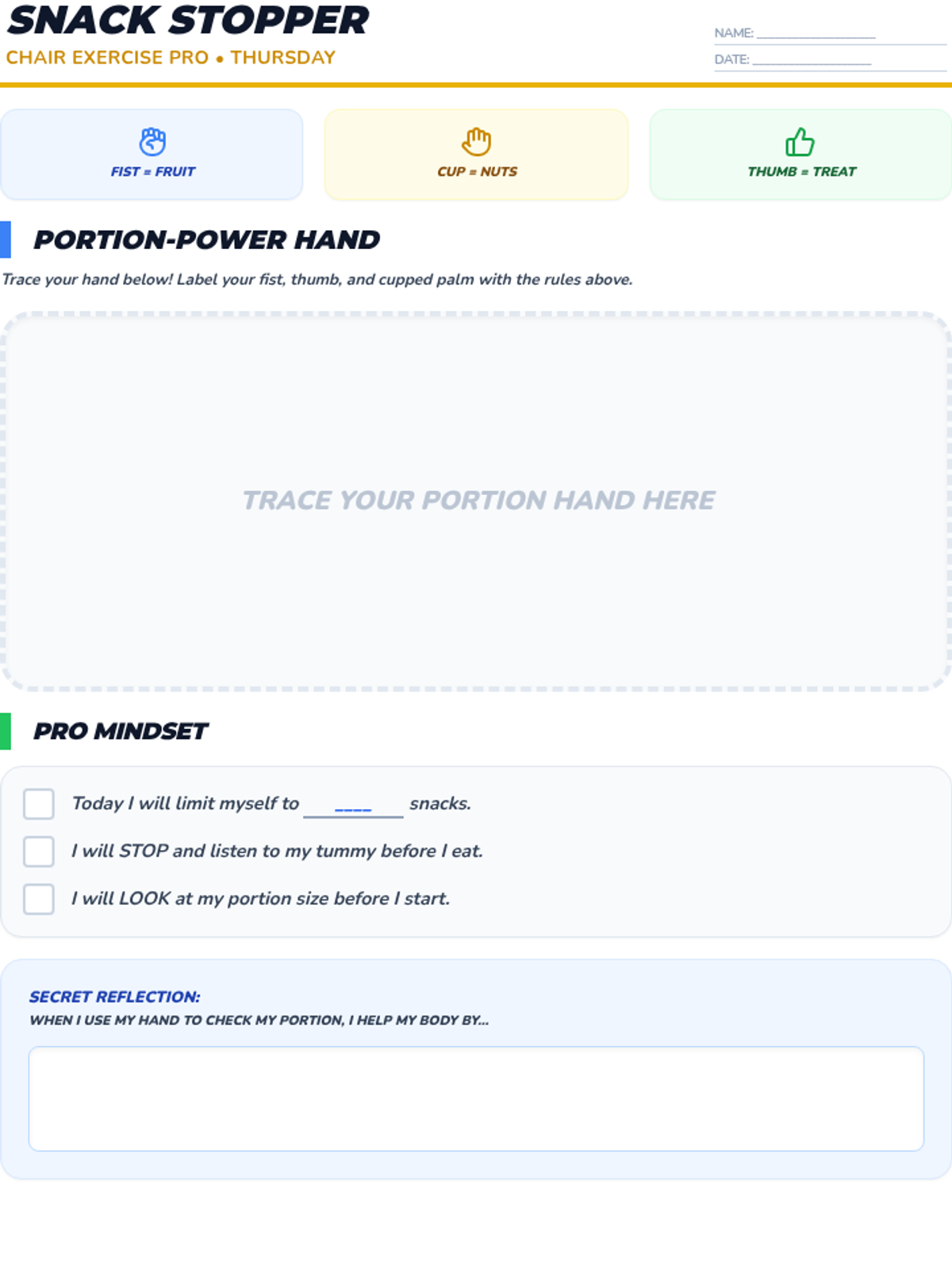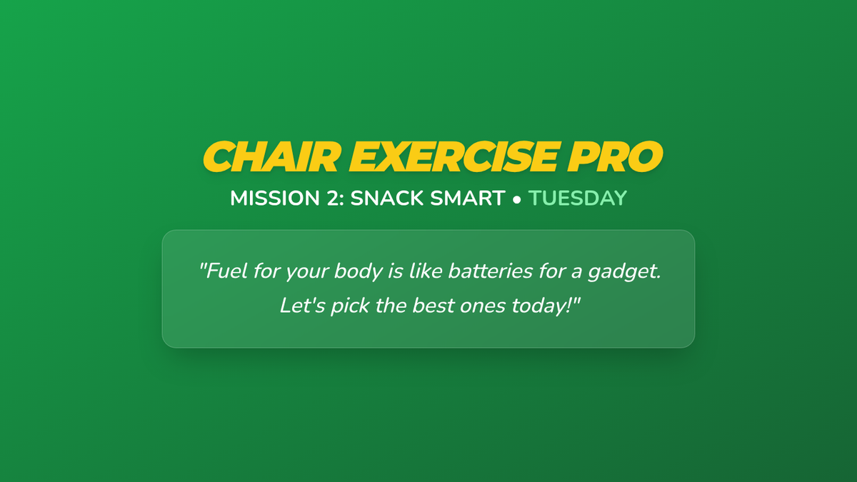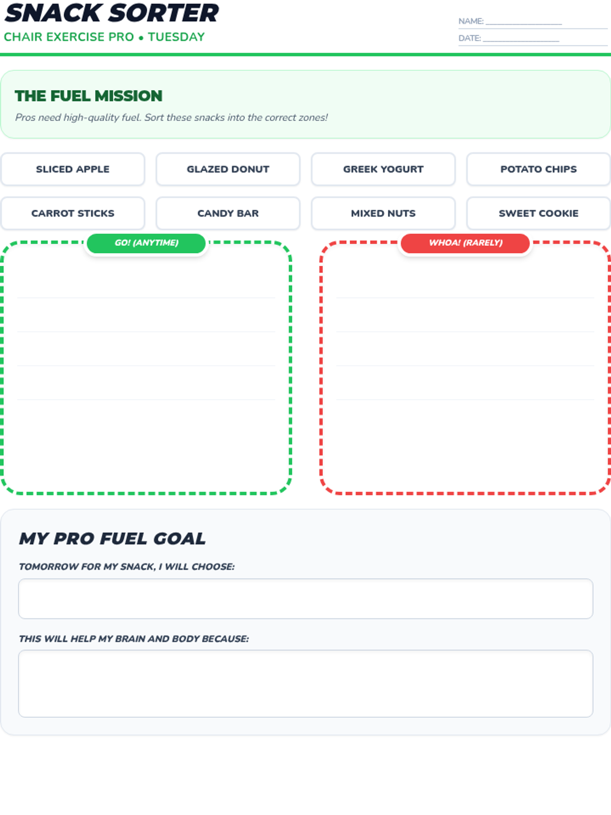 A 5-day fitness and nutrition program for students aged 8-10, focusing on chair-based cardio exercises and healthy snacking habits. The sequence alternates between active exercise days (Monday, Wednesday, Friday) and nutrition discussion days (Tuesday, Thursday).