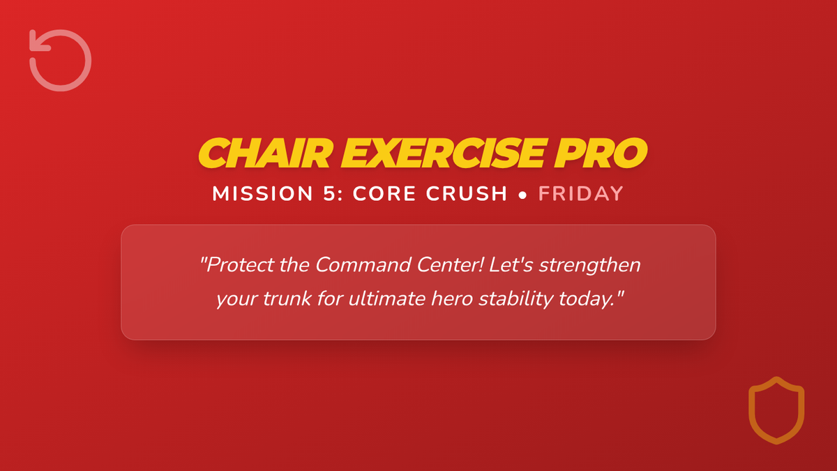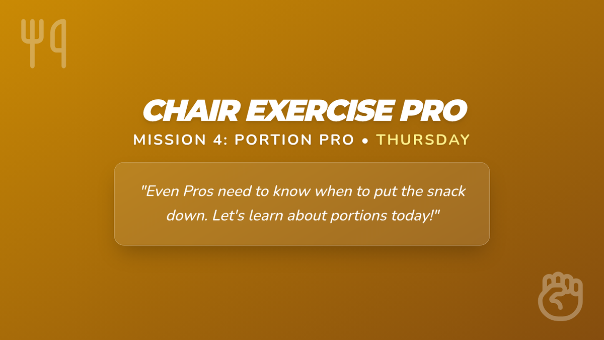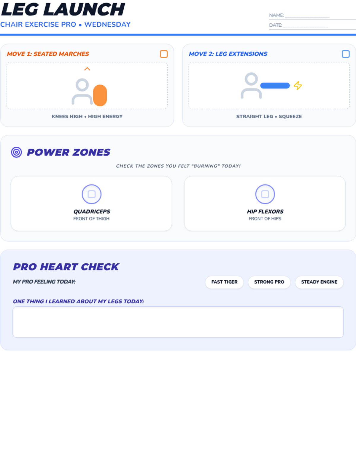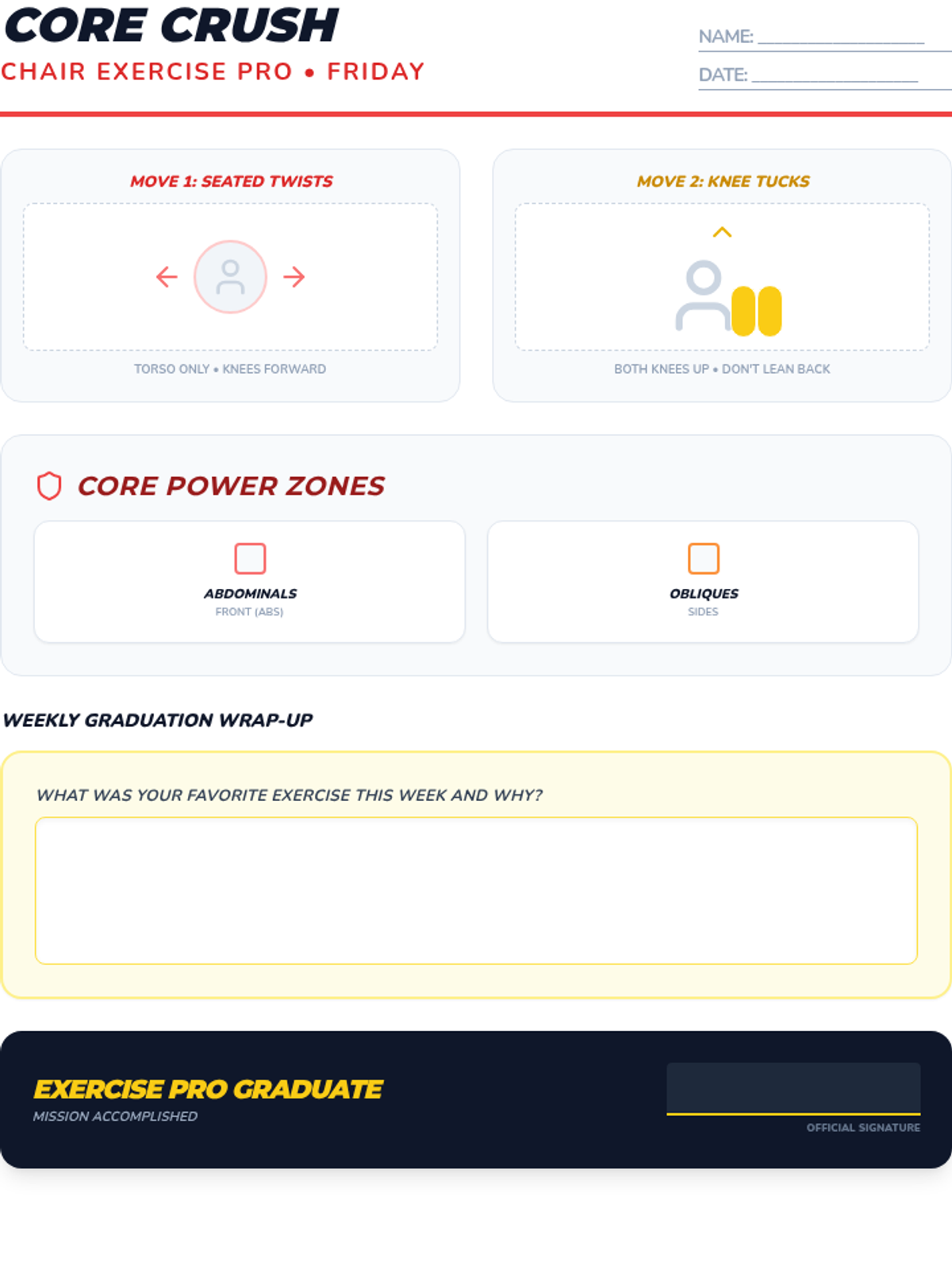 A 5-day fitness and nutrition program for students aged 8-10, focusing on chair-based cardio exercises and healthy snacking habits. The sequence alternates between active exercise days (Monday, Wednesday, Friday) and nutrition discussion days (Tuesday, Thursday).