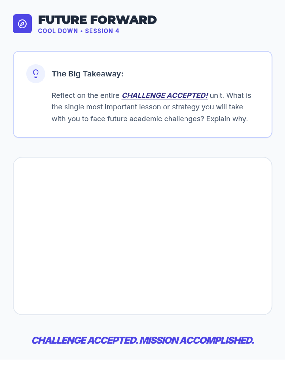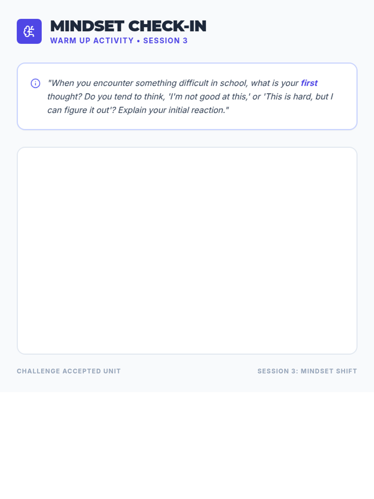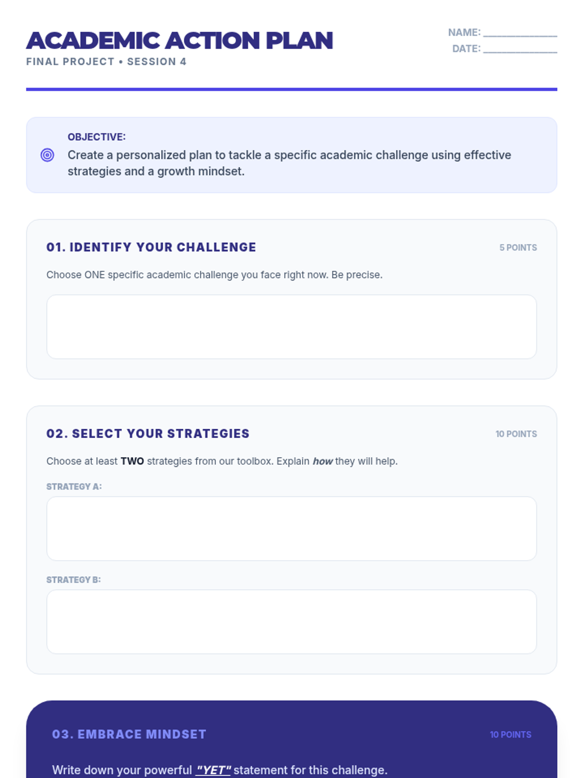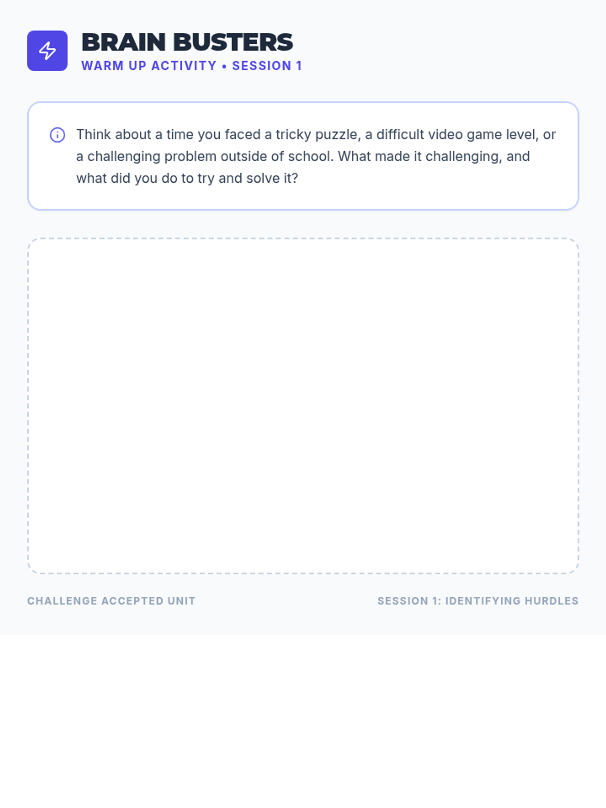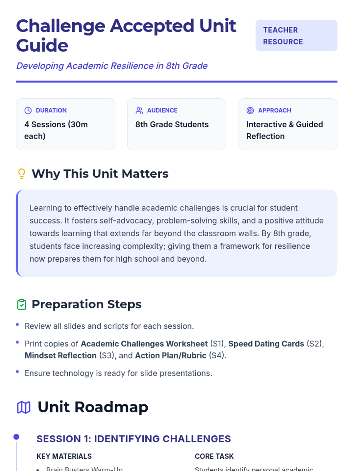 A 4-session unit for 8th-grade students designed to build academic resilience, problem-solving skills, and a growth mindset. Students identify personal hurdles, learn specific strategies, and create a custom action plan for success.