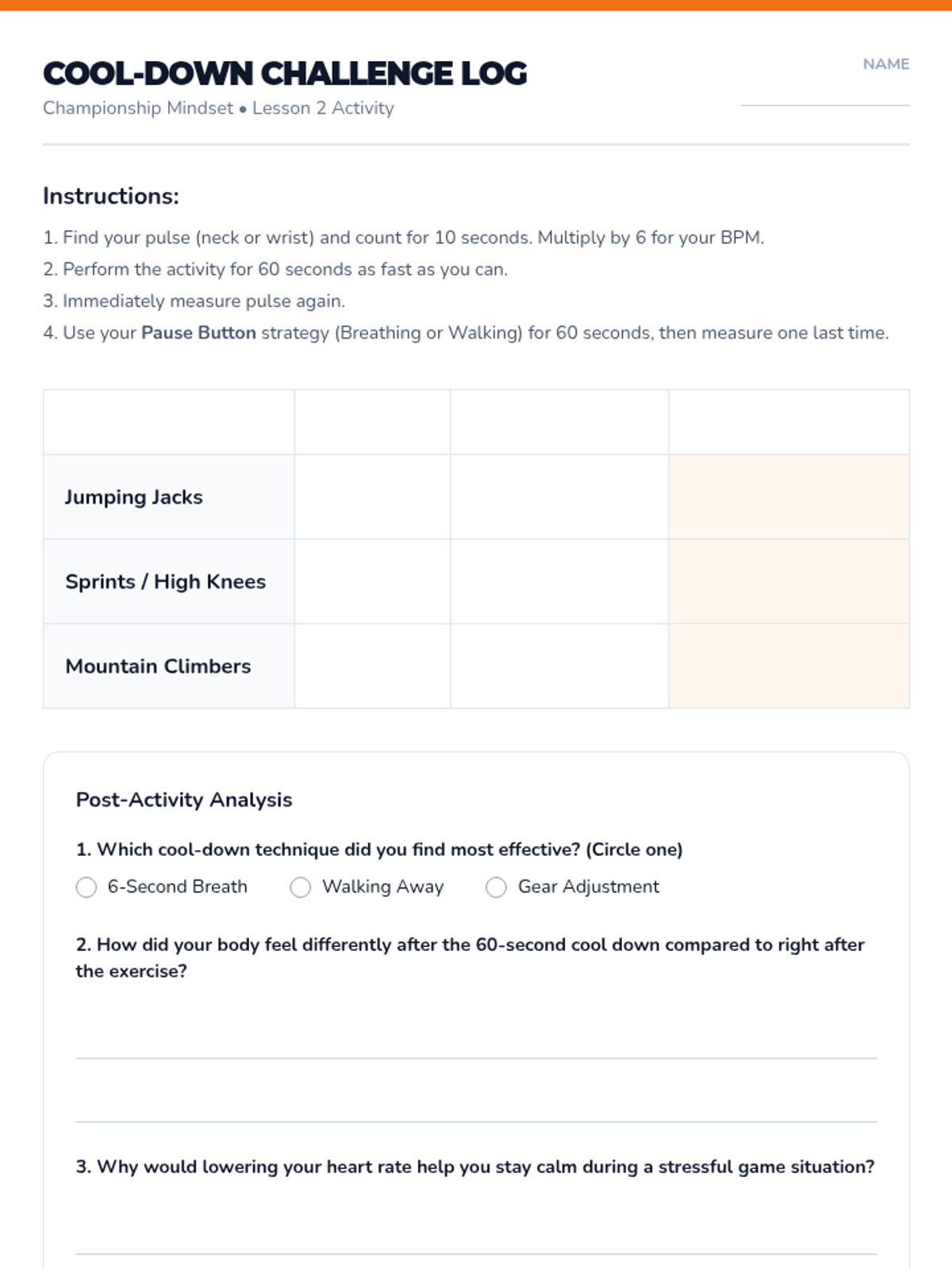 This sequence focuses on the internal aspect of sportsmanship: emotional regulation. Students learn concrete strategies for managing frustration, anger, and excitement during competitive play, progressing from identifying triggers to applying coping mechanisms in real-time games.