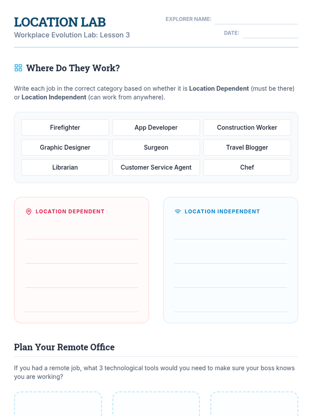 This sequence explores the evolution of the workplace, from historical tools to modern automation, remote work, the gig economy, and future career forecasting for 3rd-grade students.