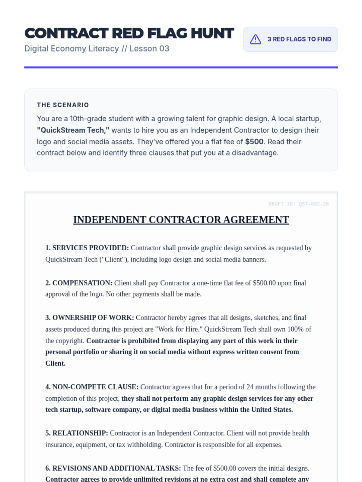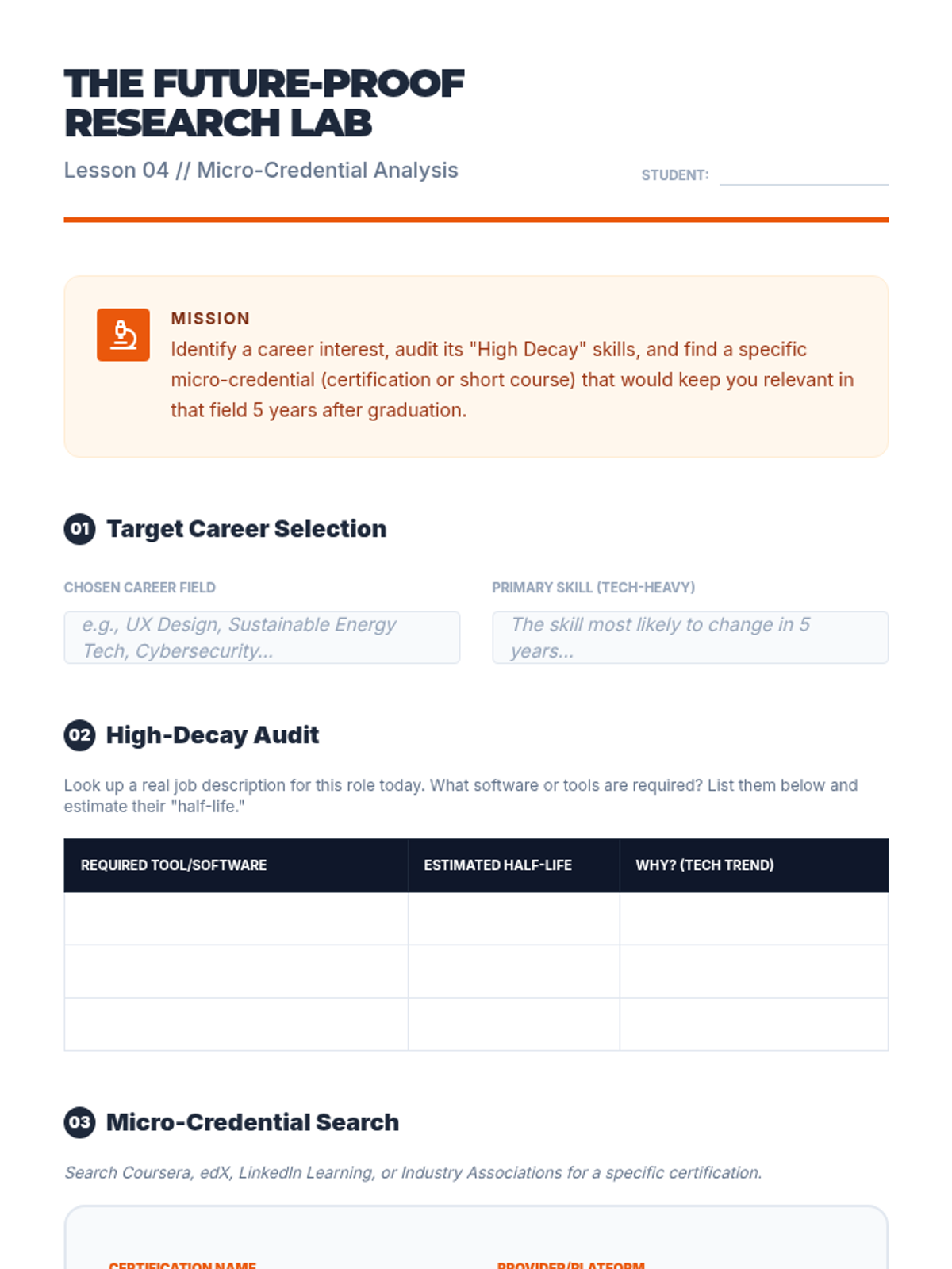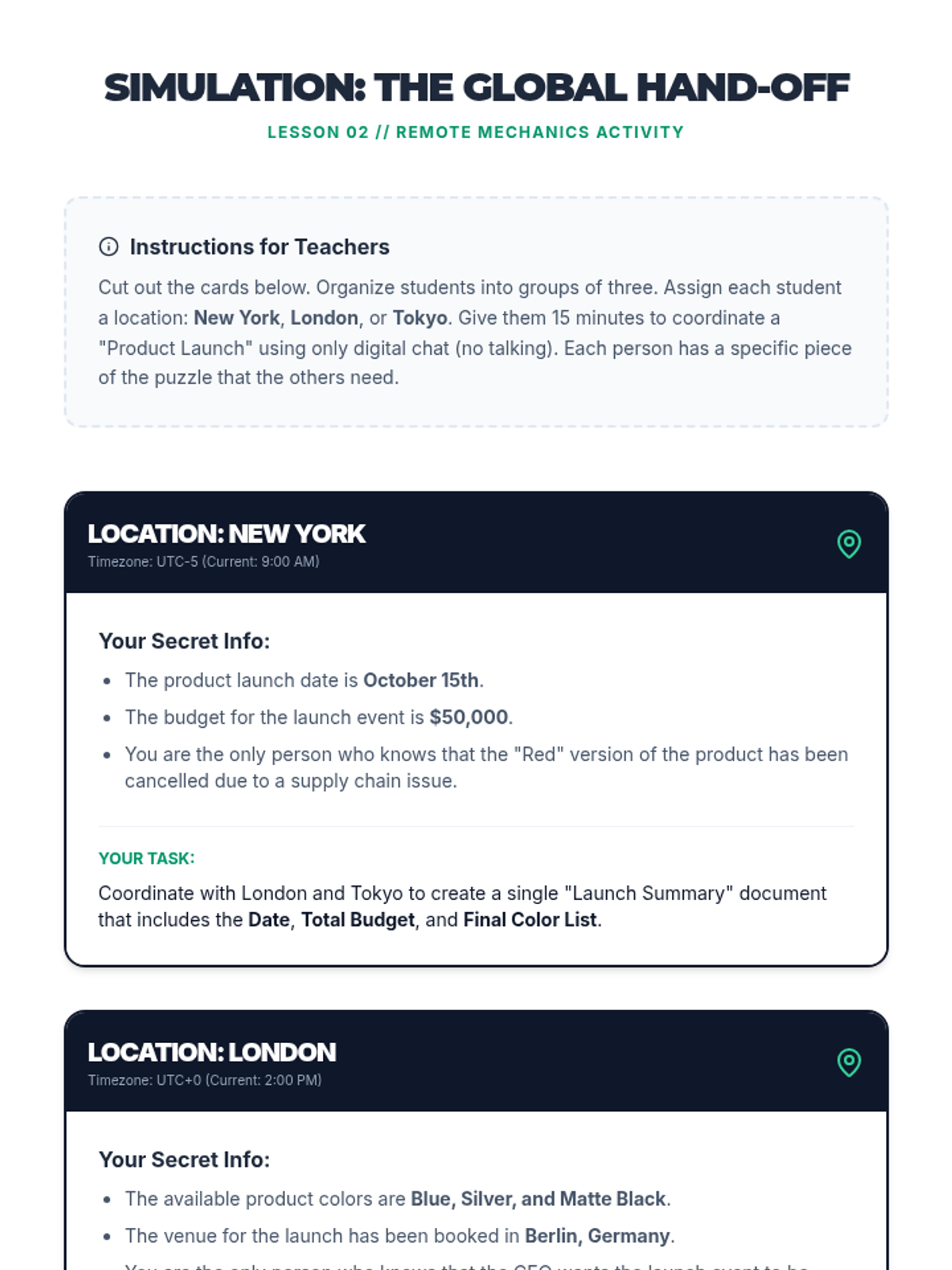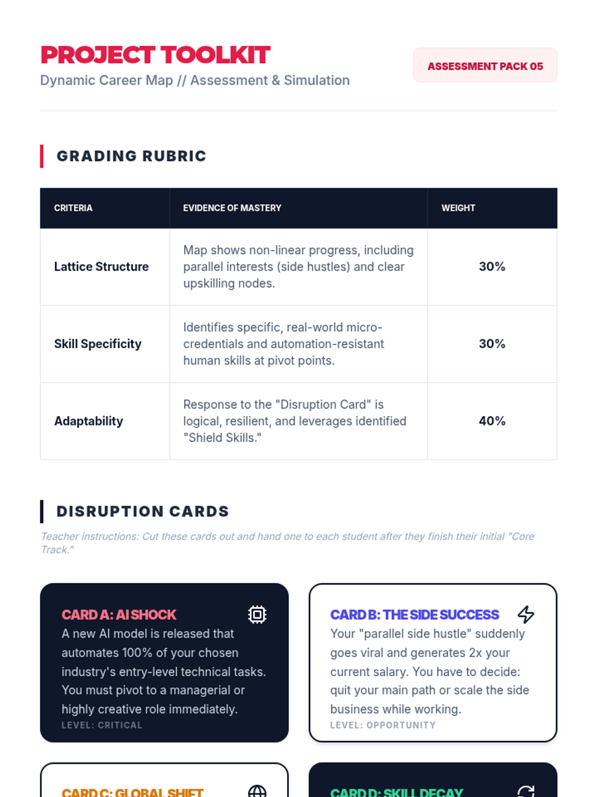 A comprehensive workshop-style sequence for 10th graders focusing on adaptability, soft skills, and career readiness in a rapidly evolving, automated, and decentralized economy. Students learn to audit human-centric skills, collaborate remotely, navigate gig economy contracts, and plan for continuous upskilling.