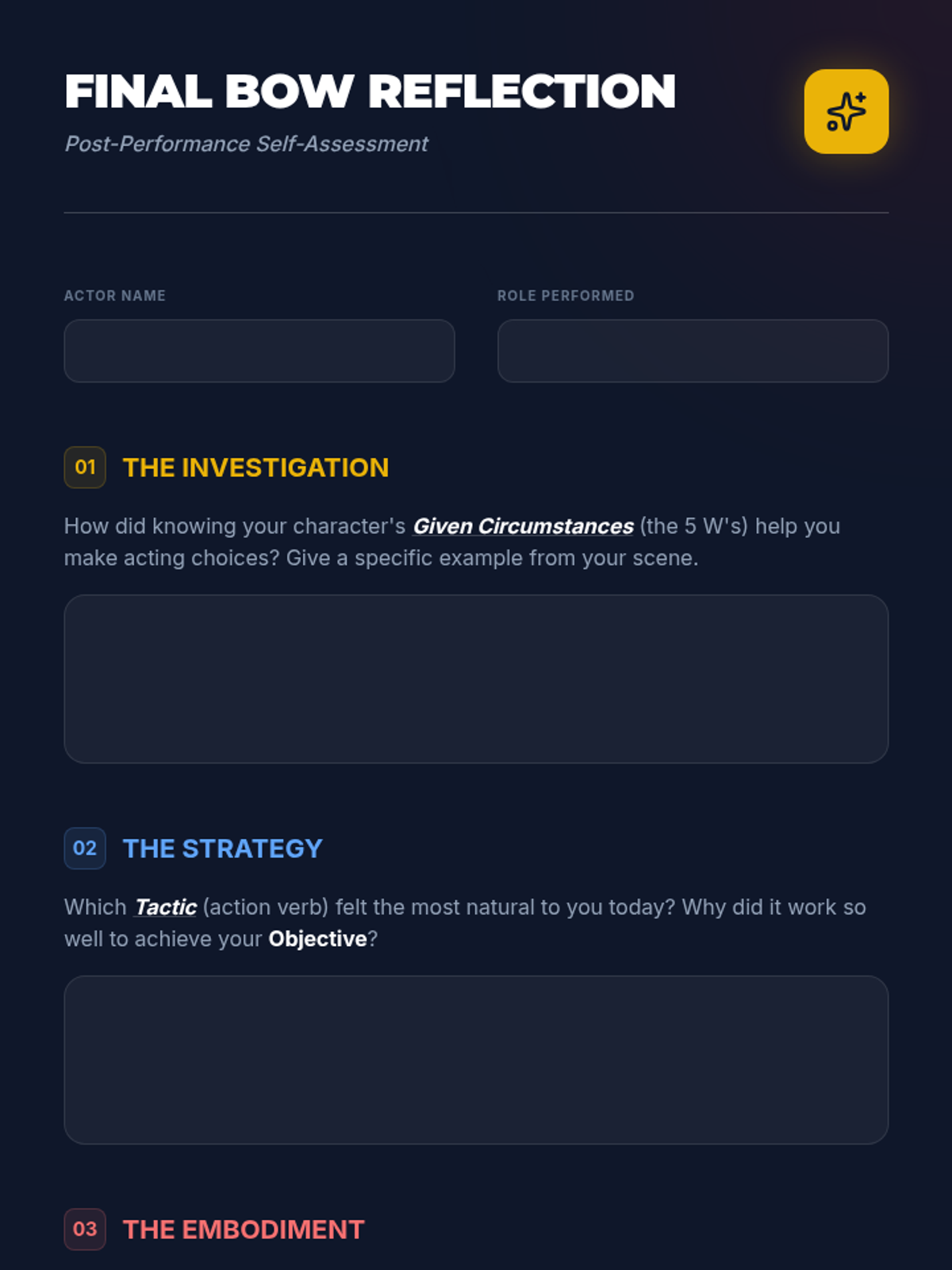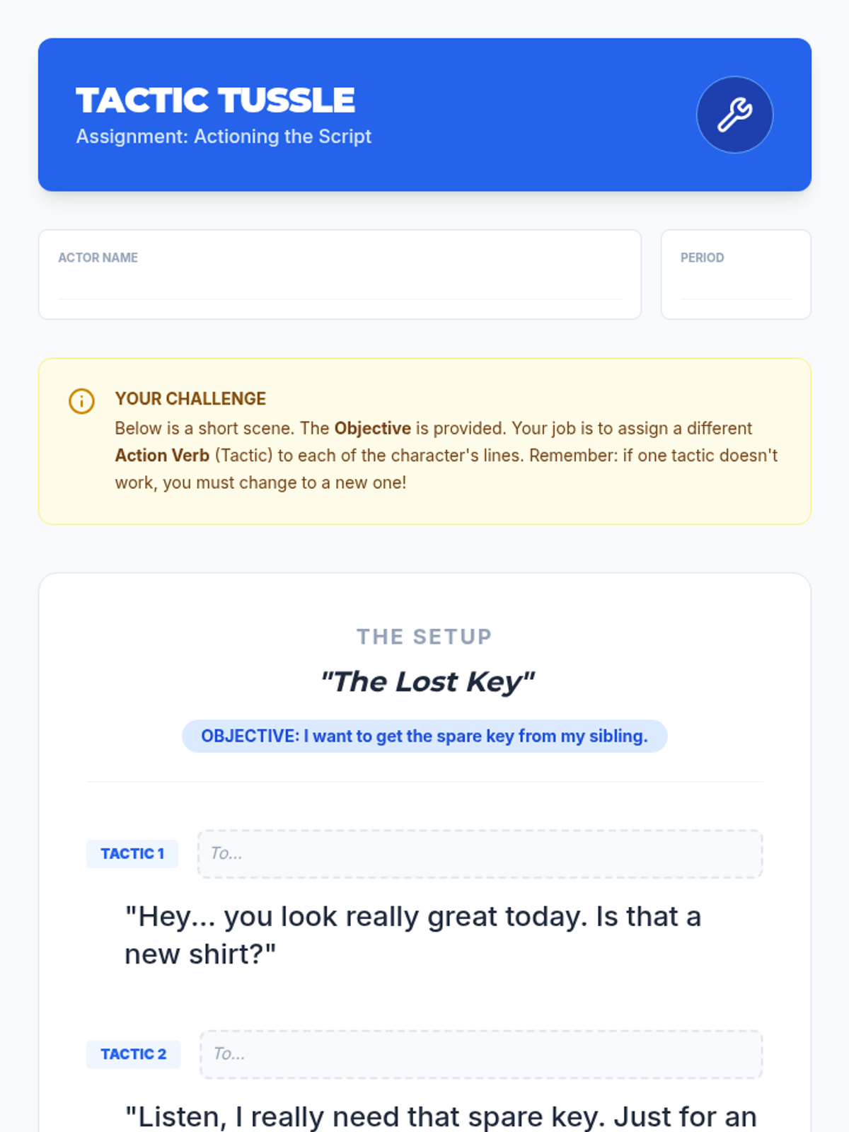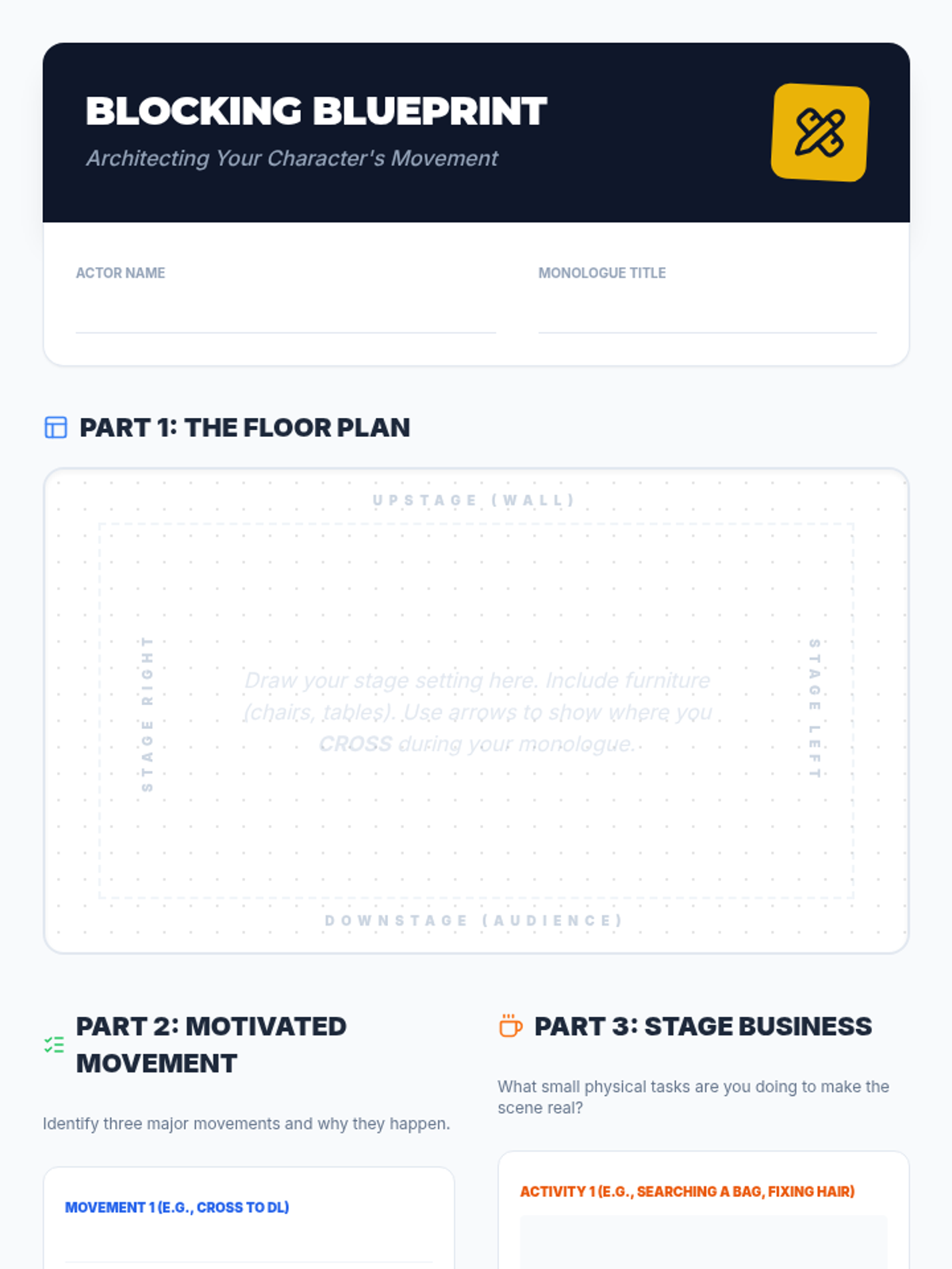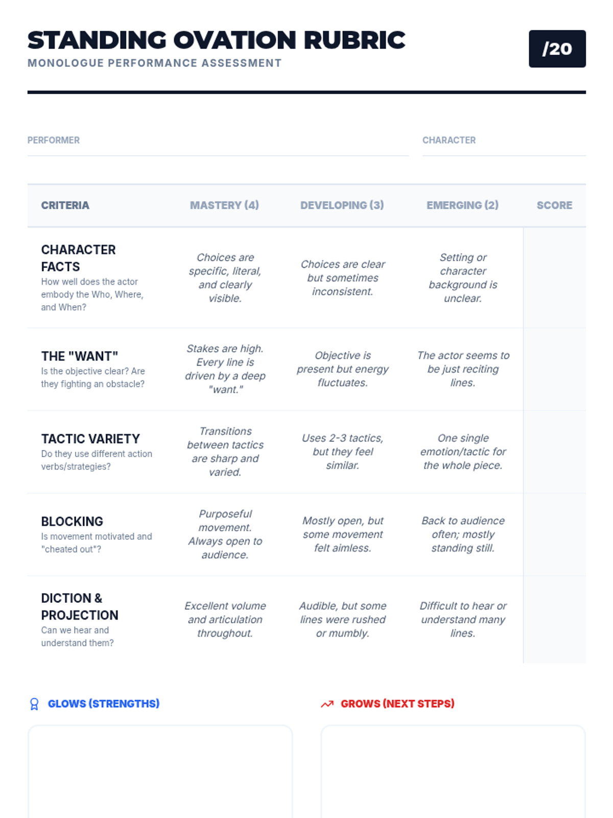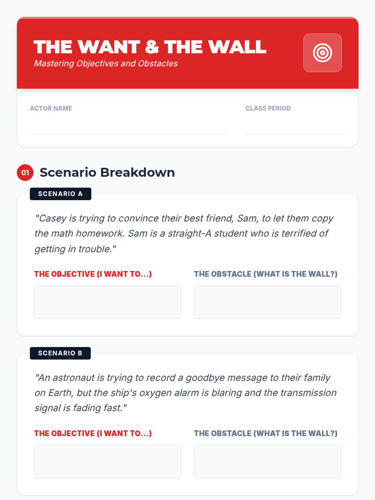 This 6th-grade theater sequence guides students through the process of script analysis, focusing on given circumstances, objectives, obstacles, tactics, and blocking to create authentic character performances. Students move from analytical reading to physical embodiment, culminating in a monologue performance.