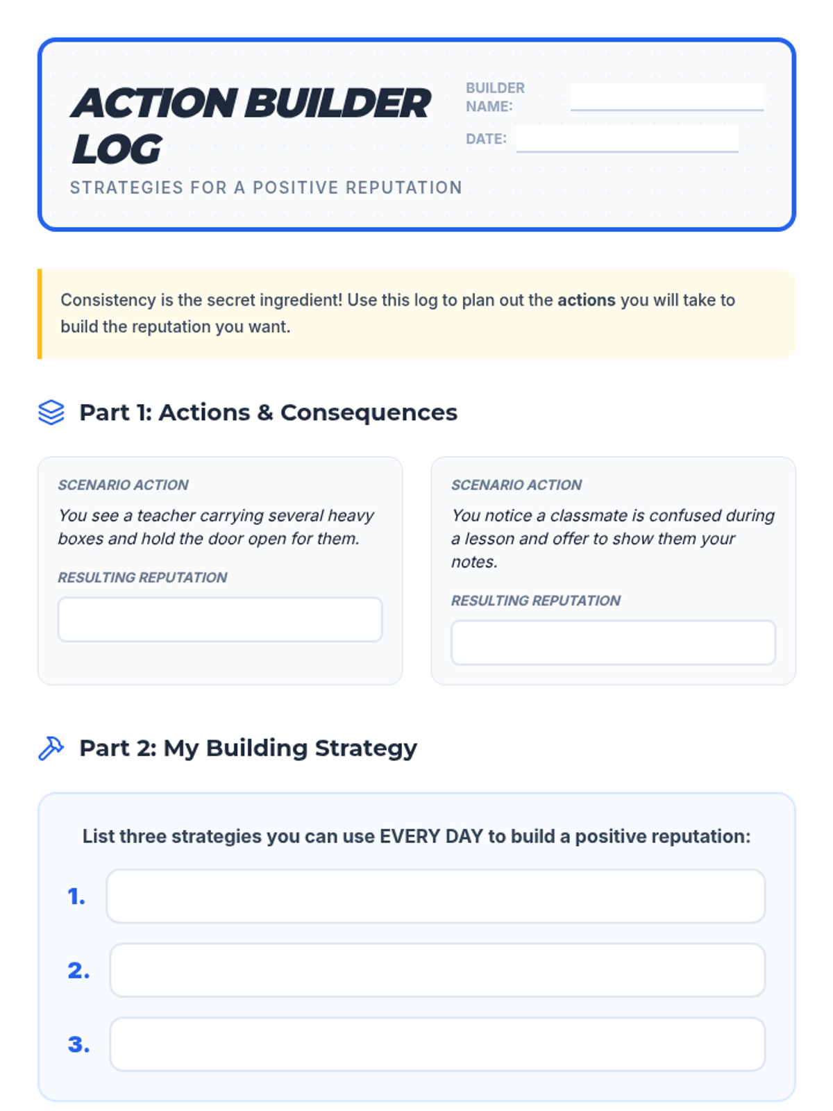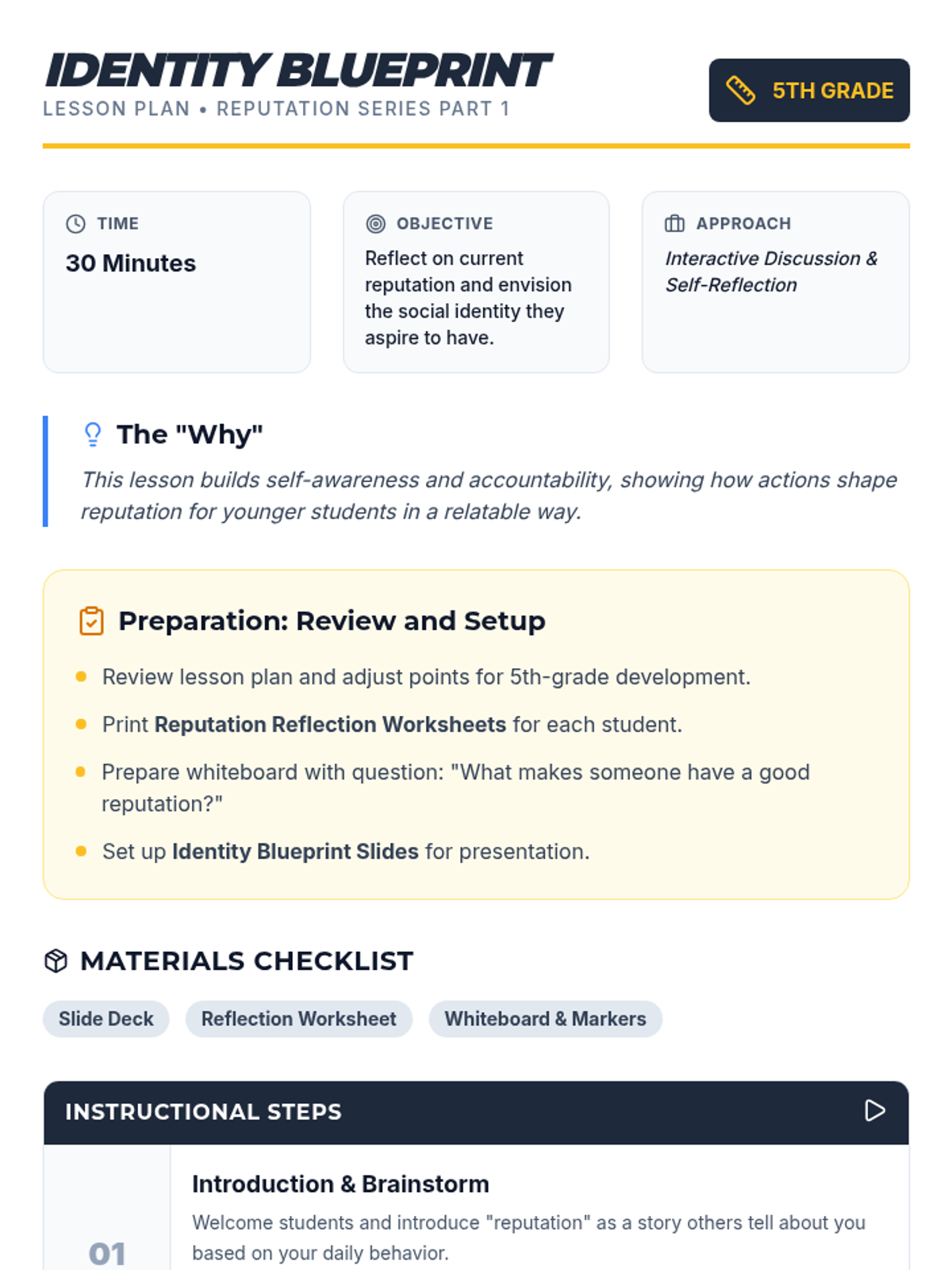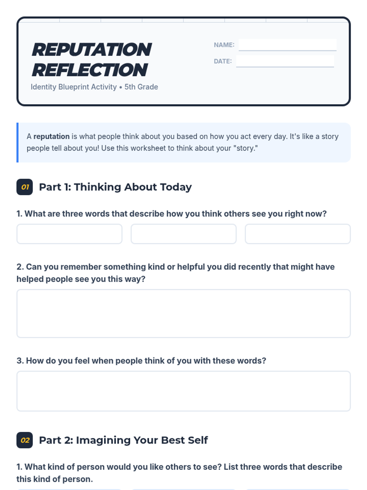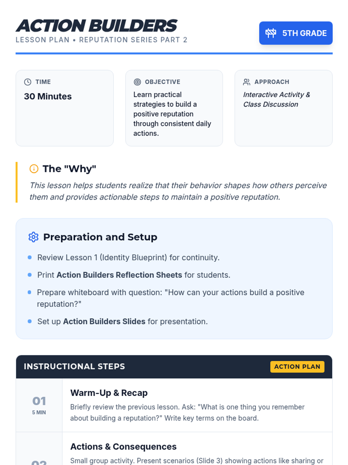 A two-part sequence for 5th graders to understand how their daily actions shape their reputation and to develop strategies for building a positive social identity.