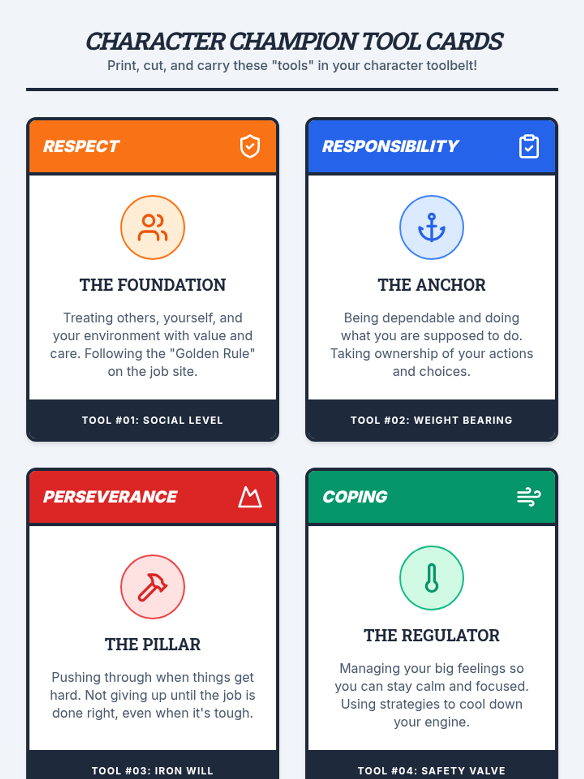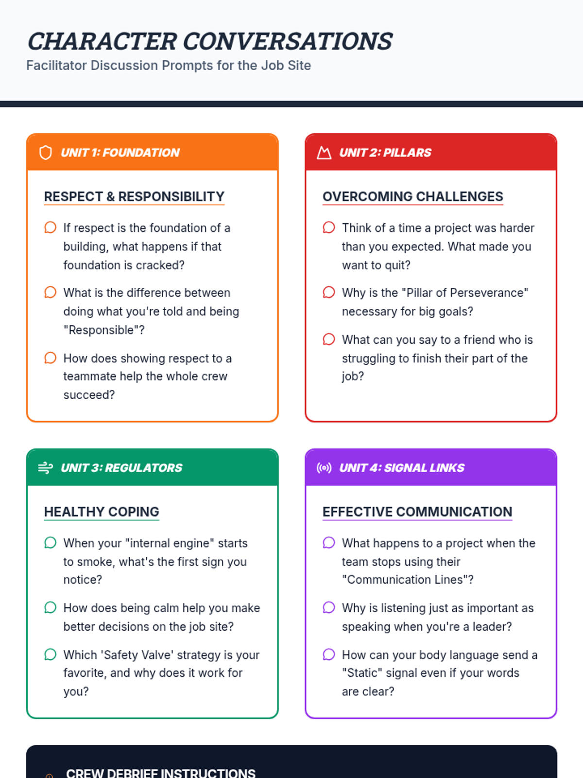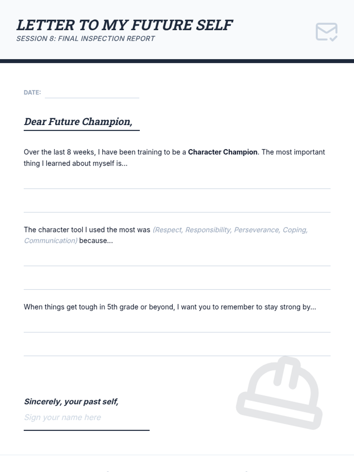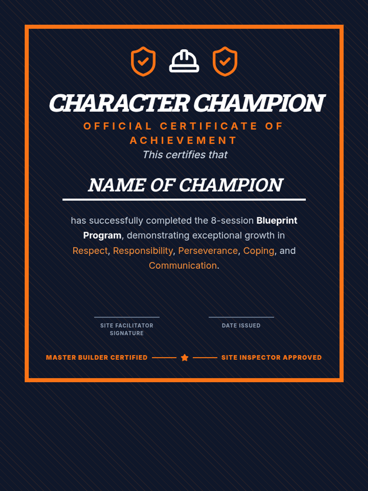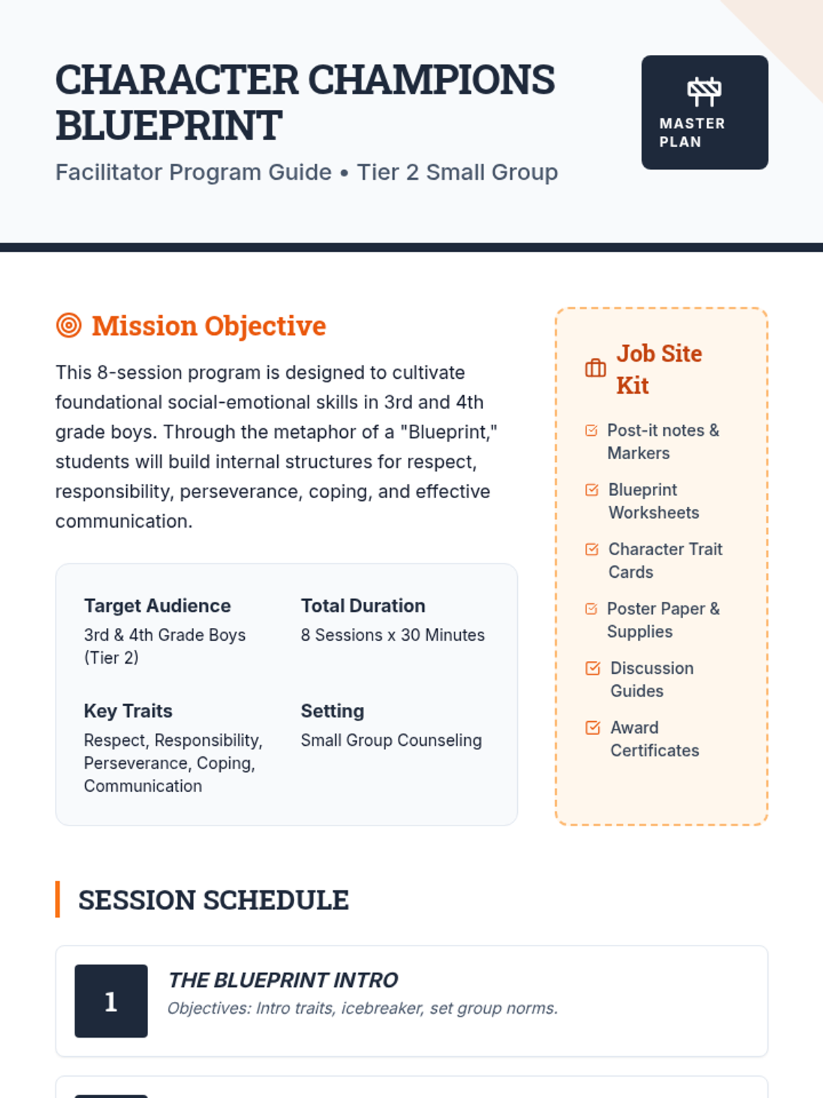 An 8-session character building program for 3rd and 4th grade boys, focusing on respect, responsibility, perseverance, coping, and communication through a construction and blueprint theme.
