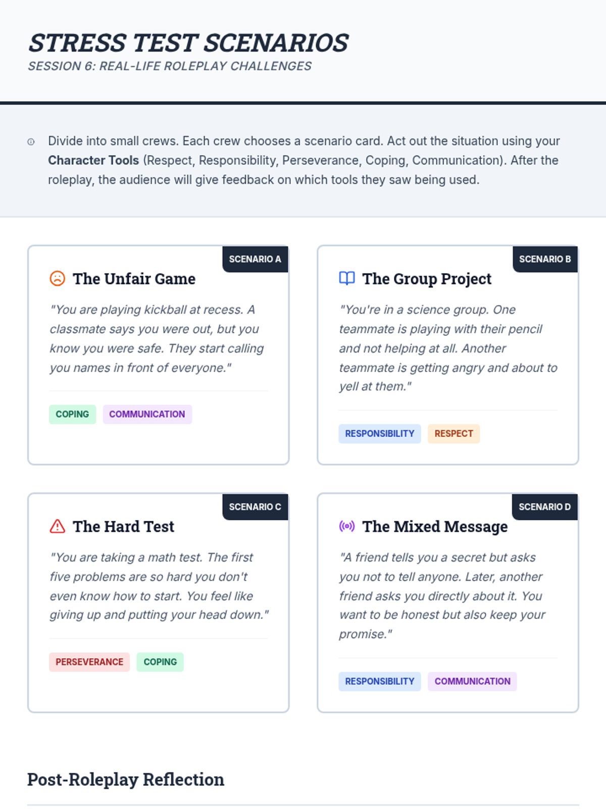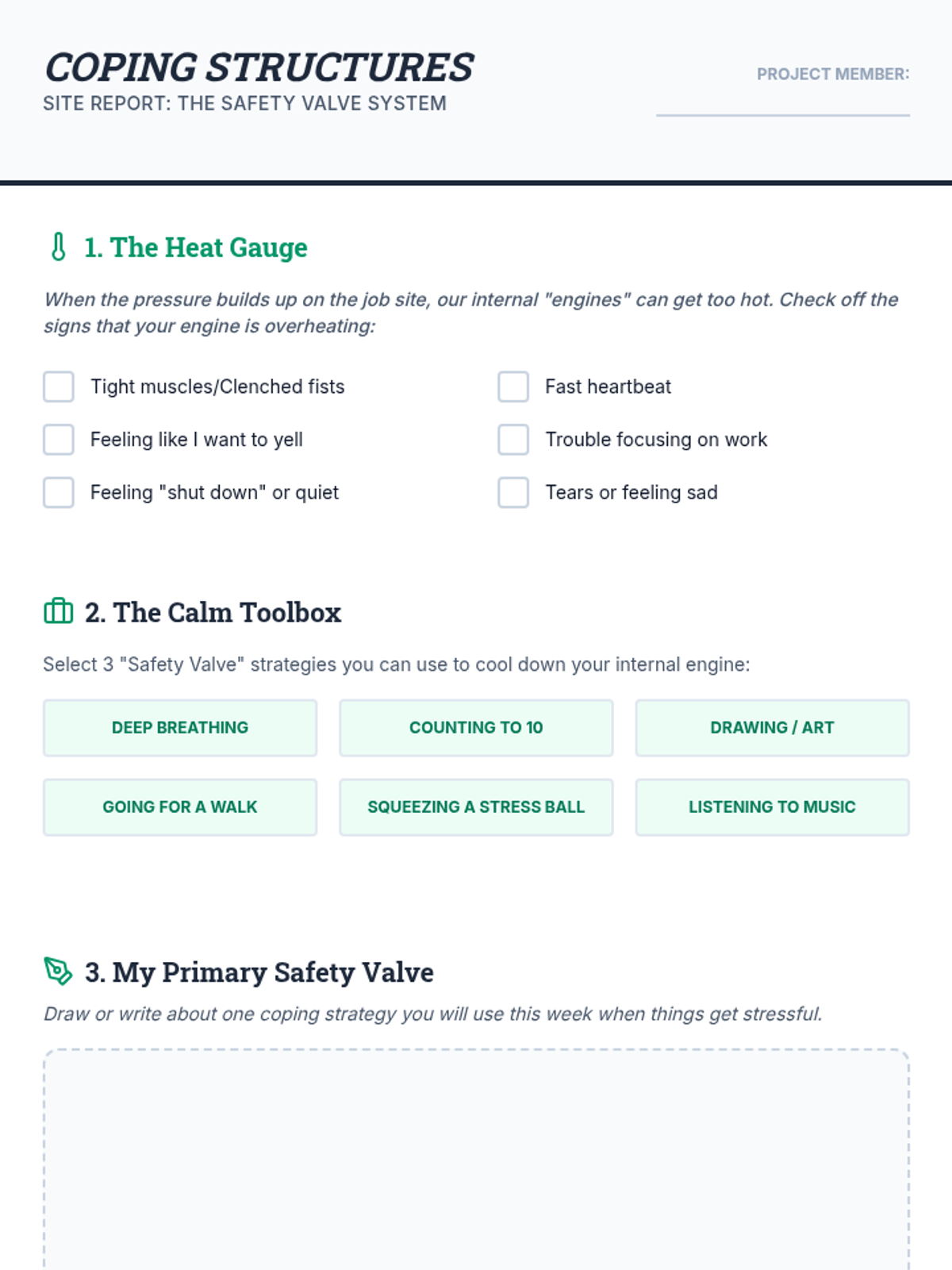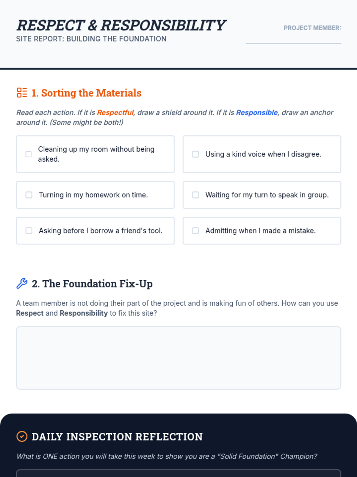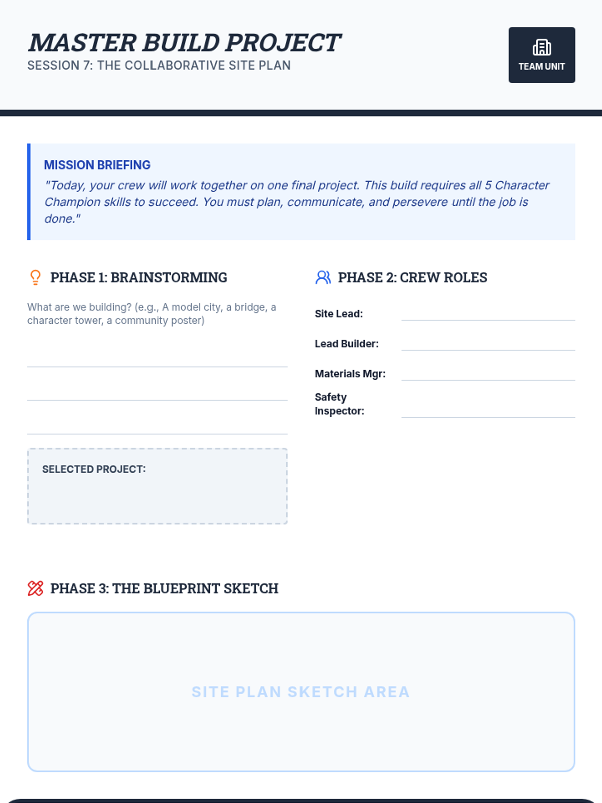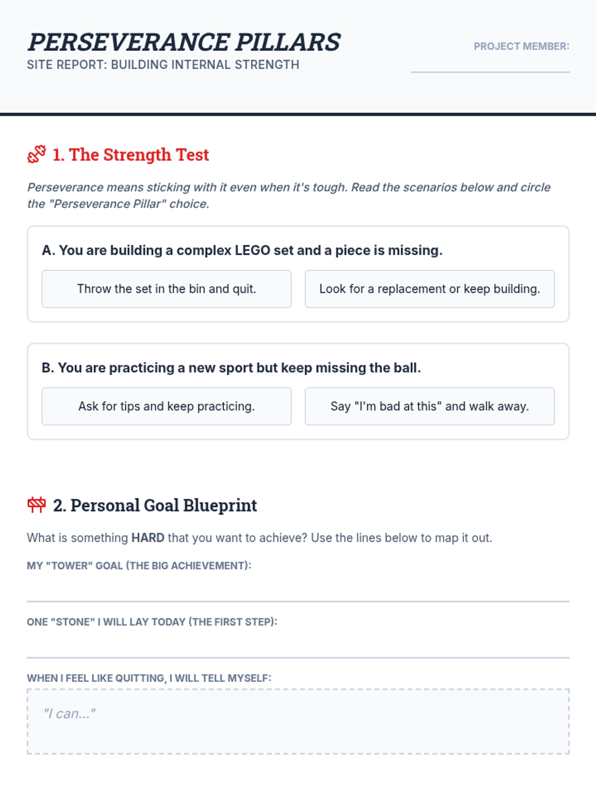 An 8-session character building program for 3rd and 4th grade boys, focusing on respect, responsibility, perseverance, coping, and communication through a construction and blueprint theme.
