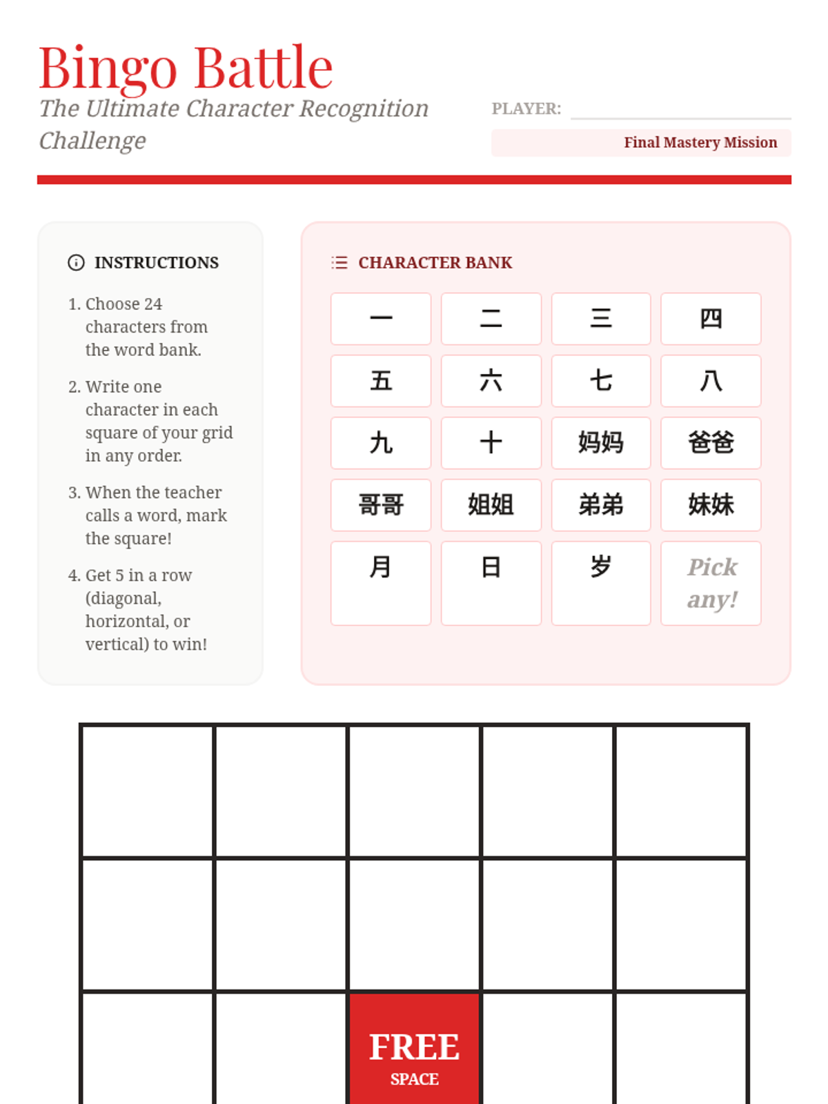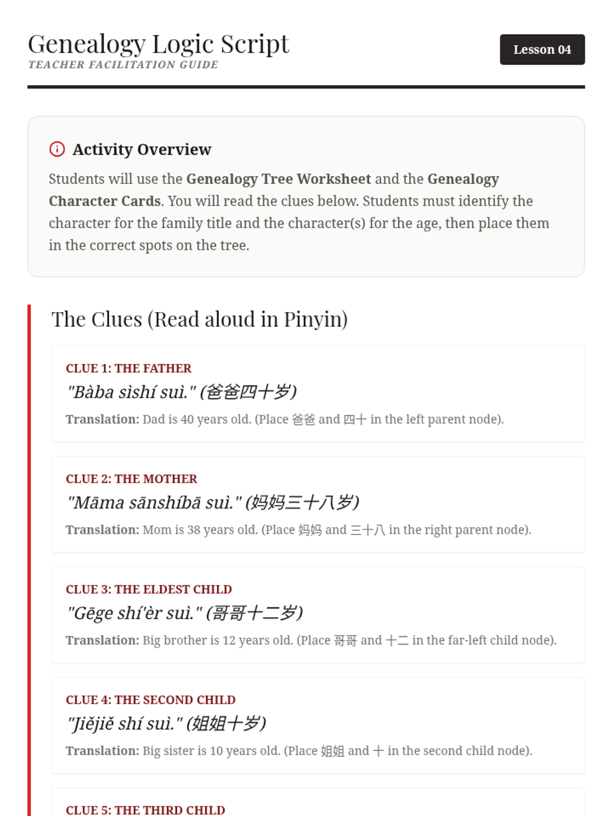 A 5-lesson sequence for 5th-grade students focused on mastering Mandarin Chinese characters for numbers 1-10 and immediate family members through game-based learning and logical puzzles.