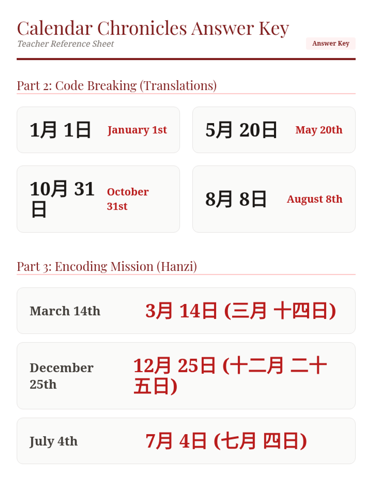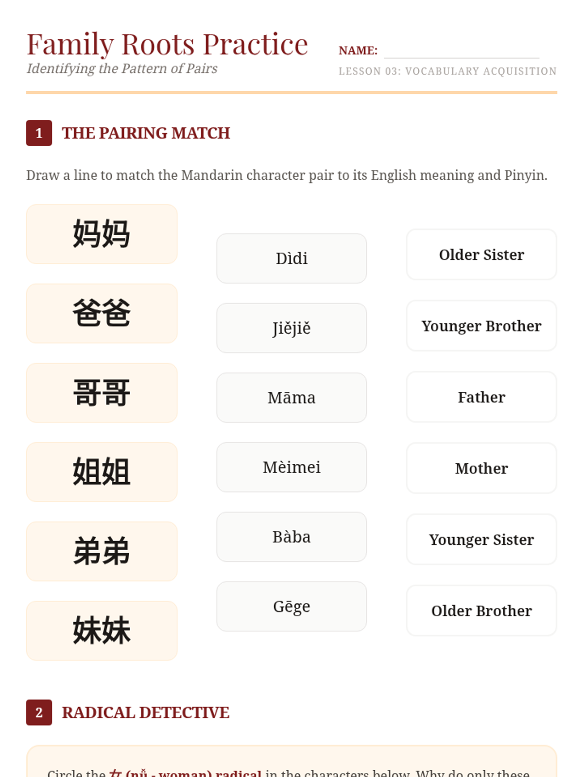A 5-lesson inquiry-based sequence where 5th-grade students become 'Linguistic Detectives' to decode Mandarin Chinese characters by analyzing their radicals. Students move from simple nature-based radicals to complex compound characters, culminating in a real-world decoding challenge.