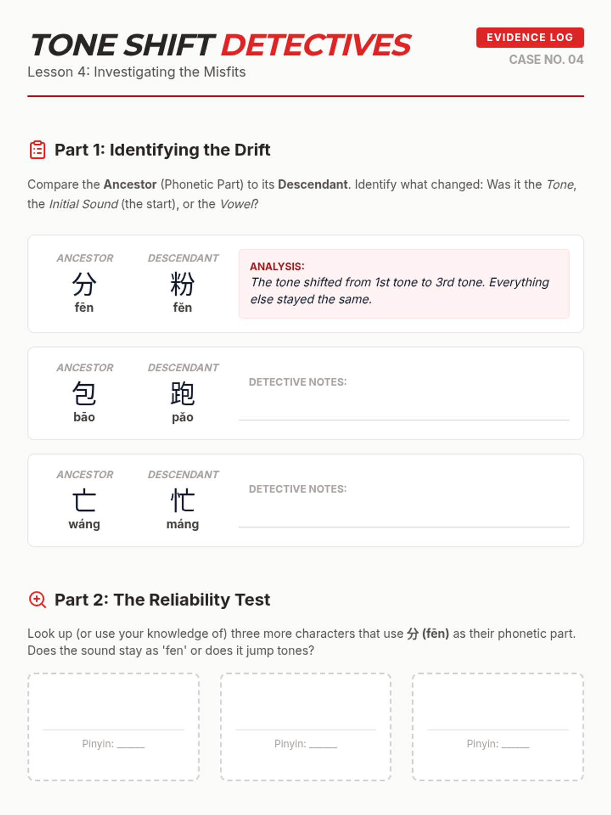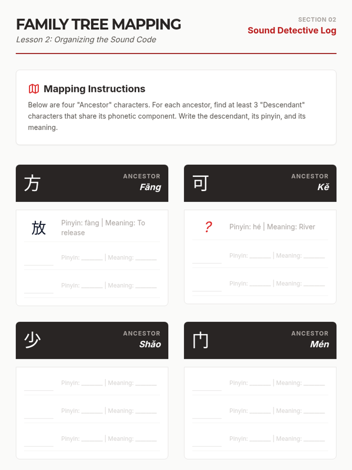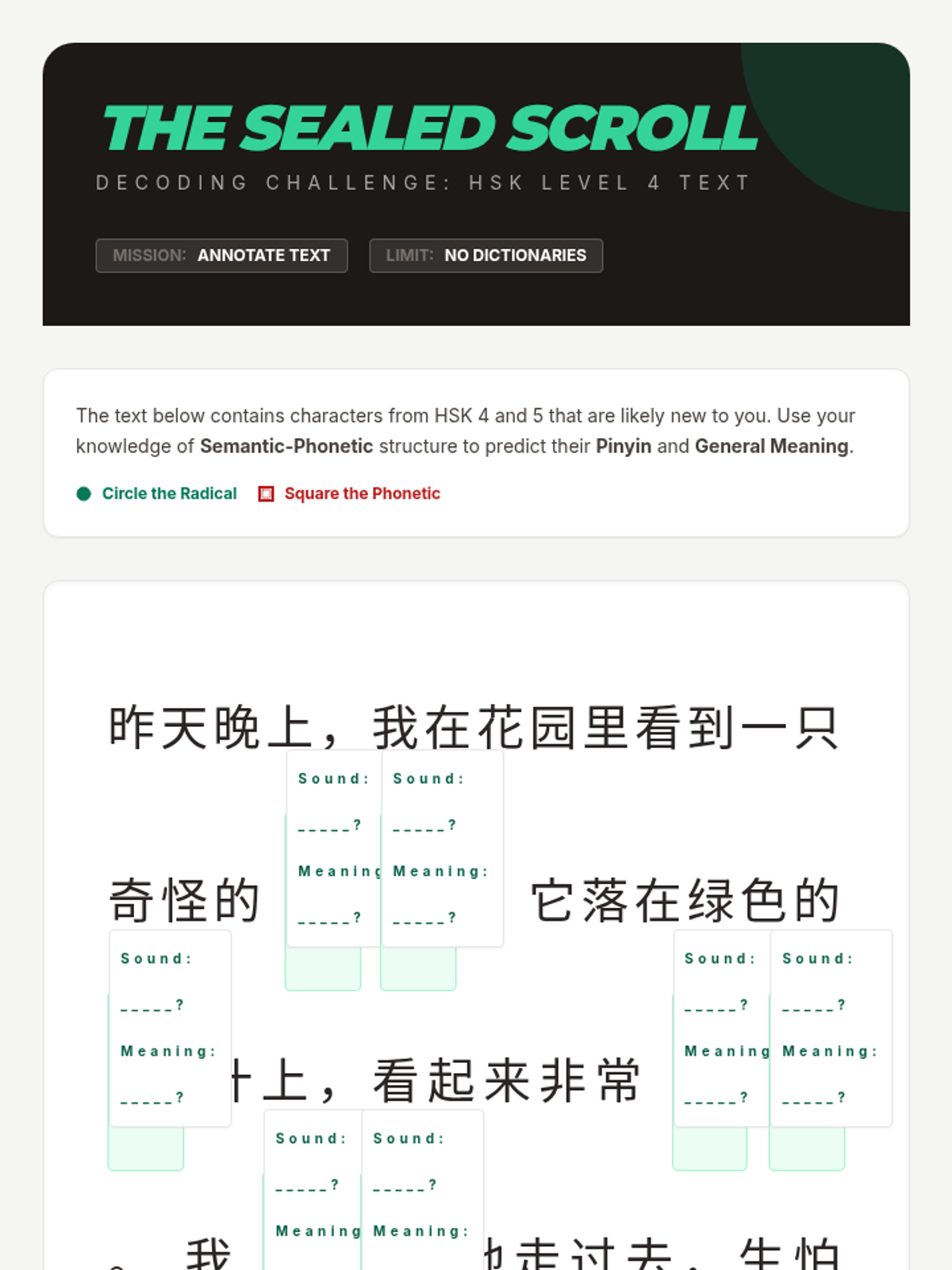 An inquiry-based exploration of Mandarin Chinese semantic-phonetic character structure, empowering 6th-grade students to decode unfamiliar characters using structural logic.