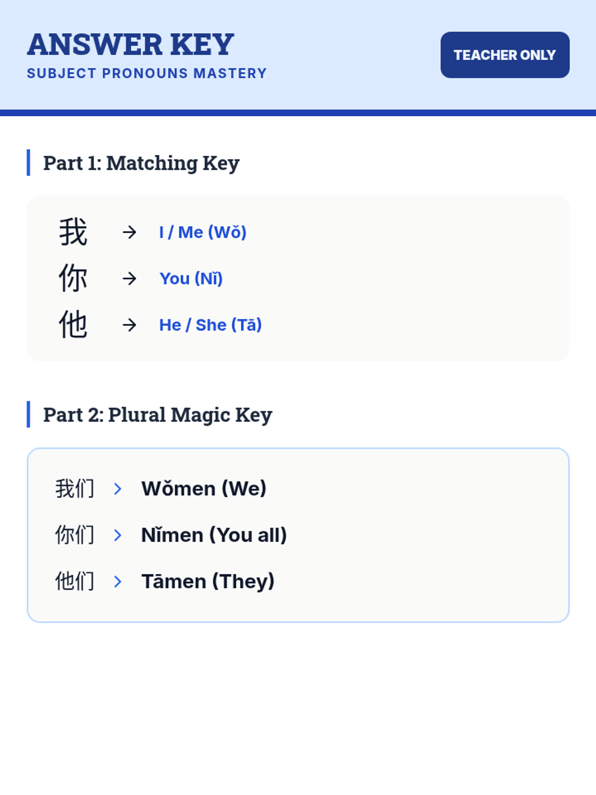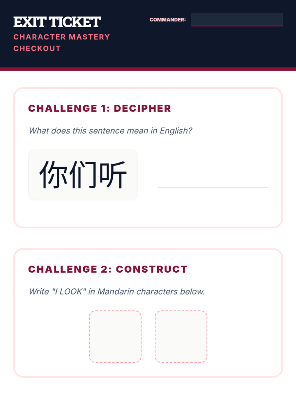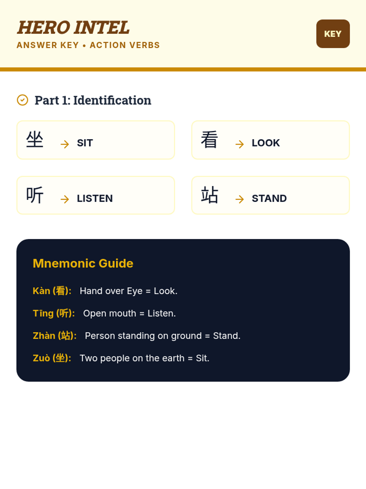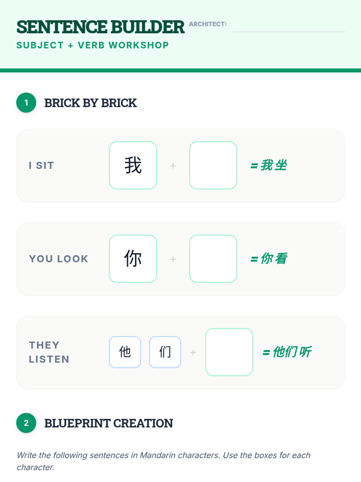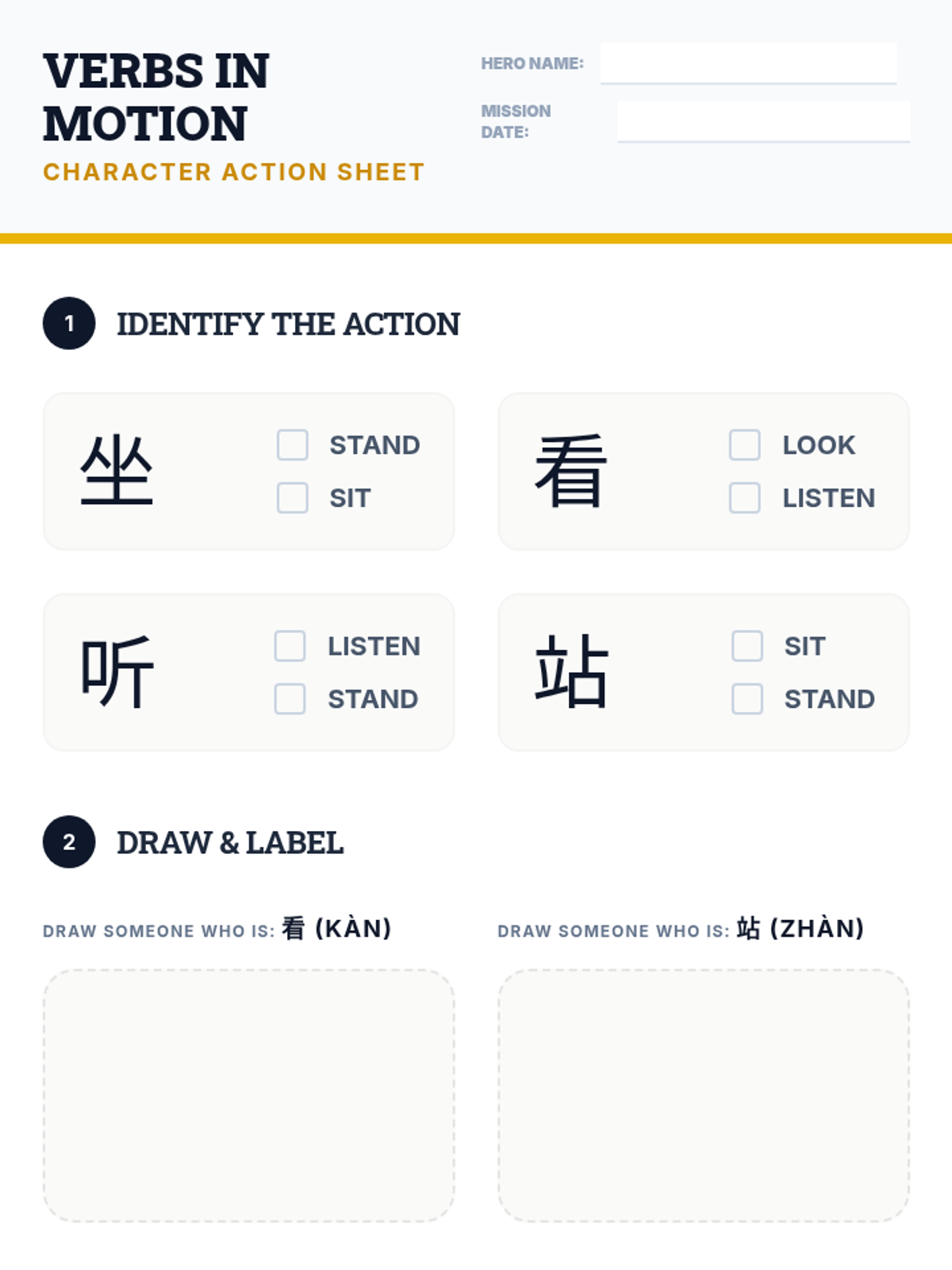A beginner Mandarin Chinese sequence for 4th graders focusing on connecting written characters to physical actions and body parts through Total Physical Response (TPR). Students will progress from individual nouns and verbs to constructing simple Subject-Verb sentences.