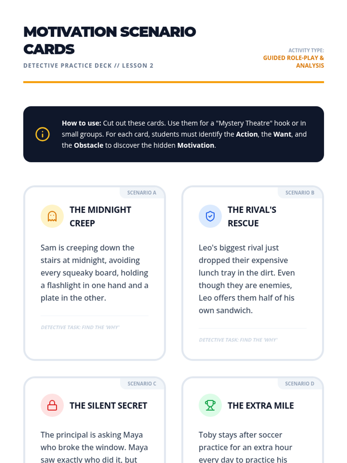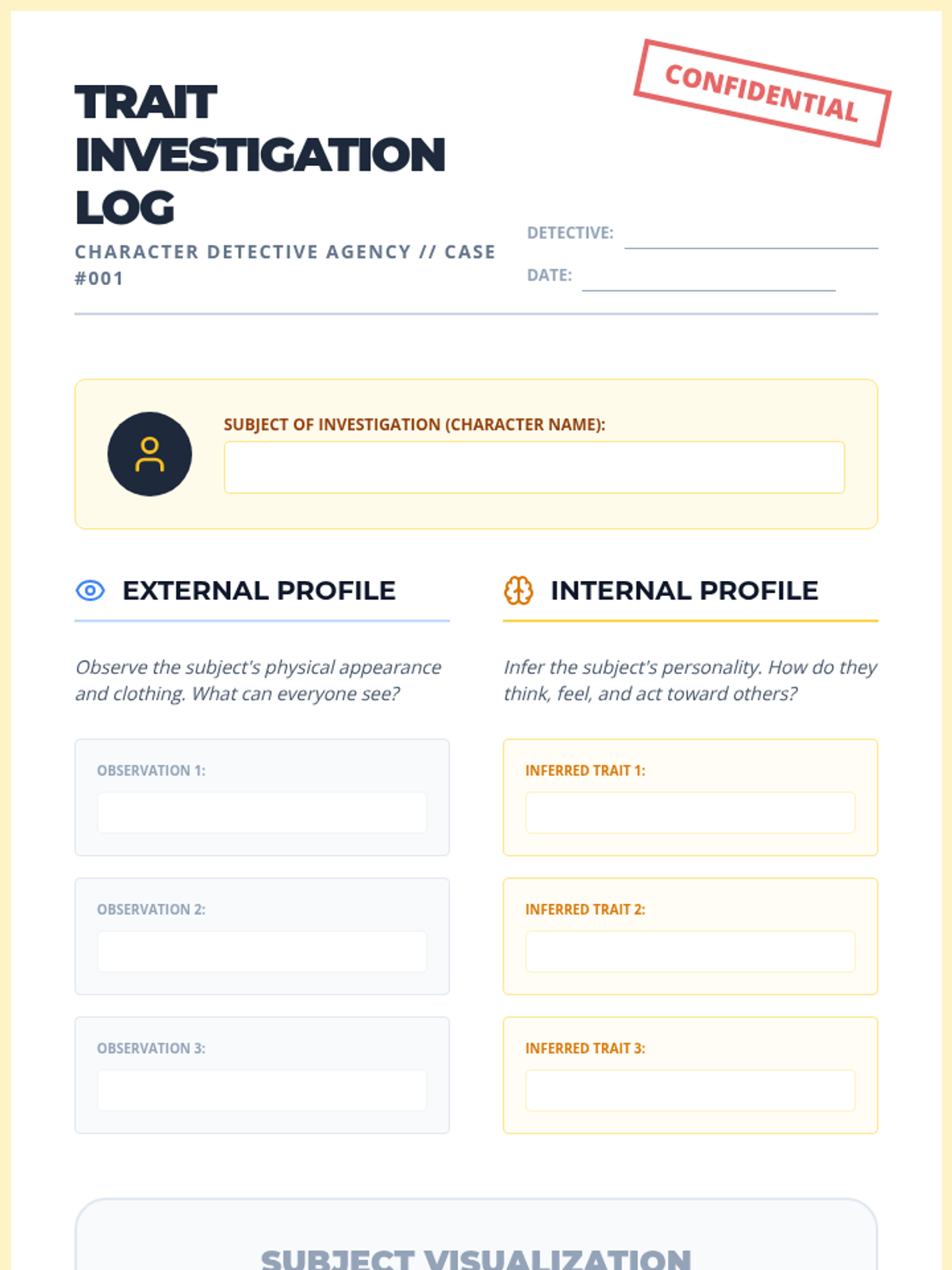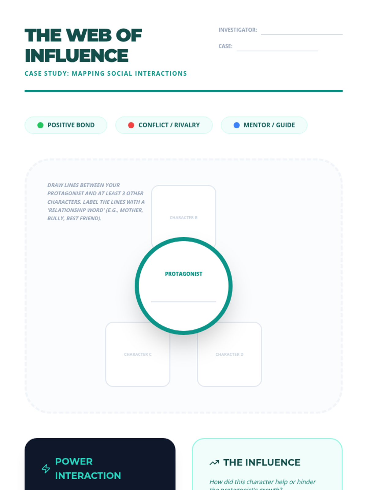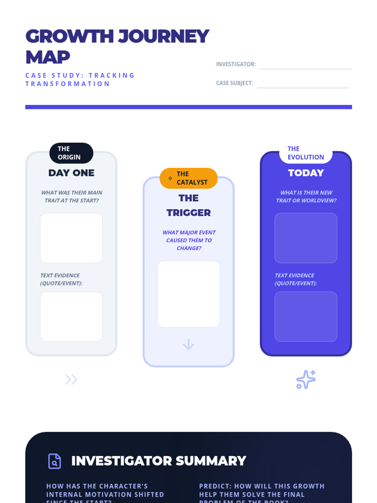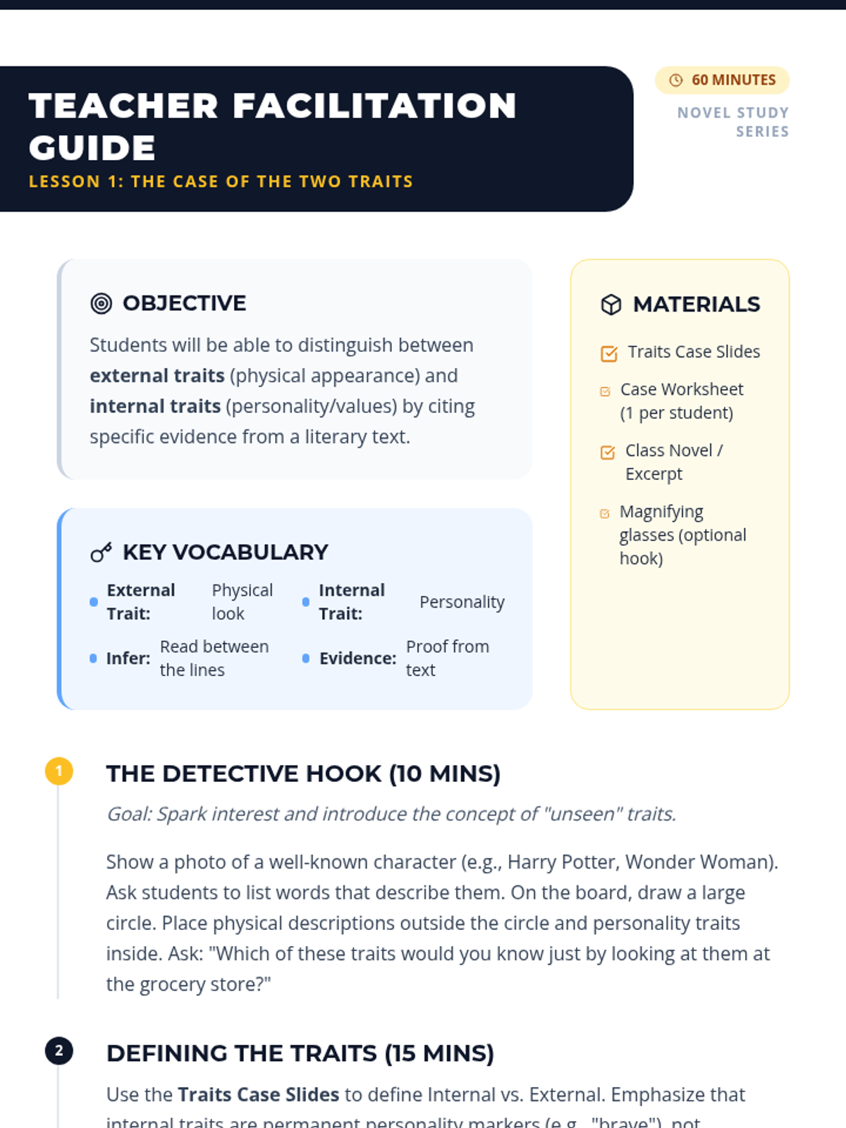 A comprehensive novel study sequence for 4th graders to master character analysis, focusing on the distinction between internal and external traits, understanding motivation, tracking development, and analyzing social interactions. Students act as 'Character Detectives' to uncover textual evidence and build a complete character profile.