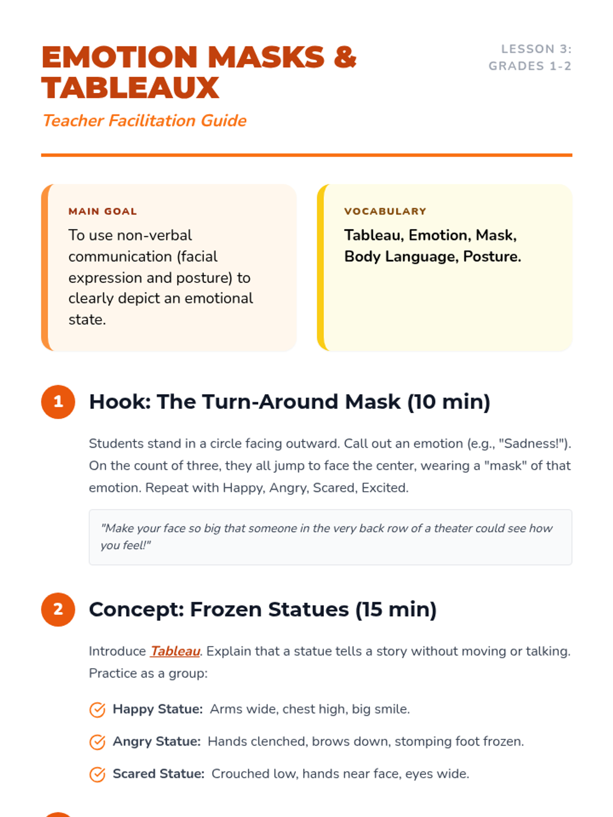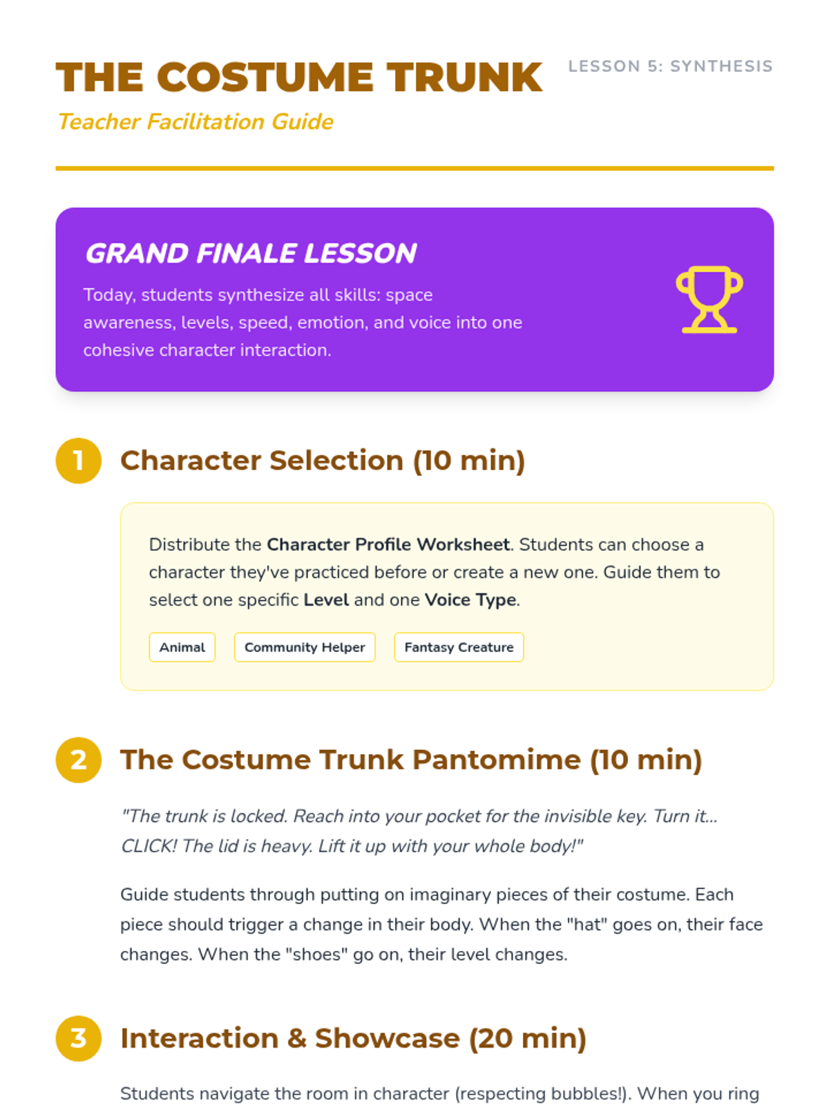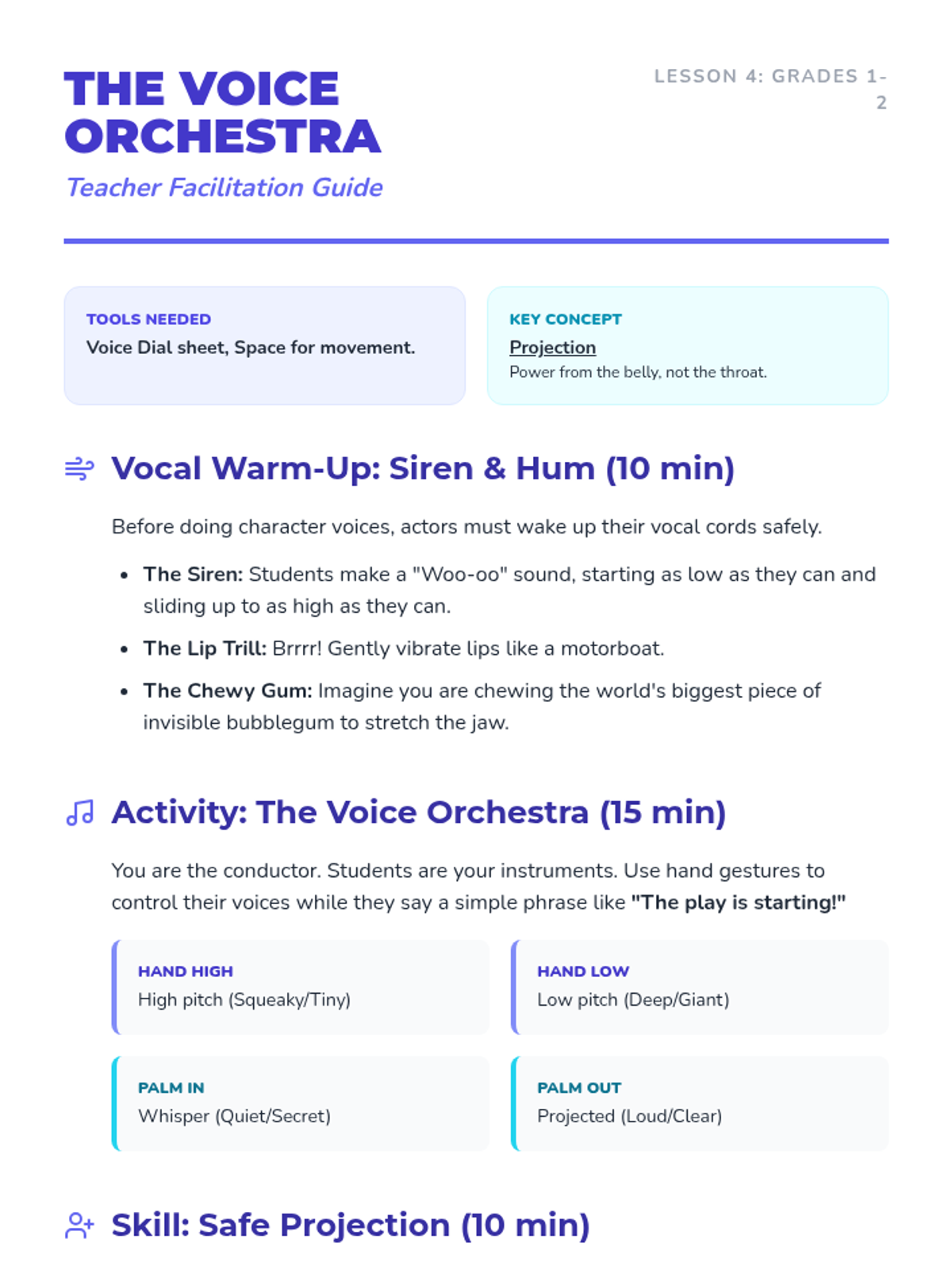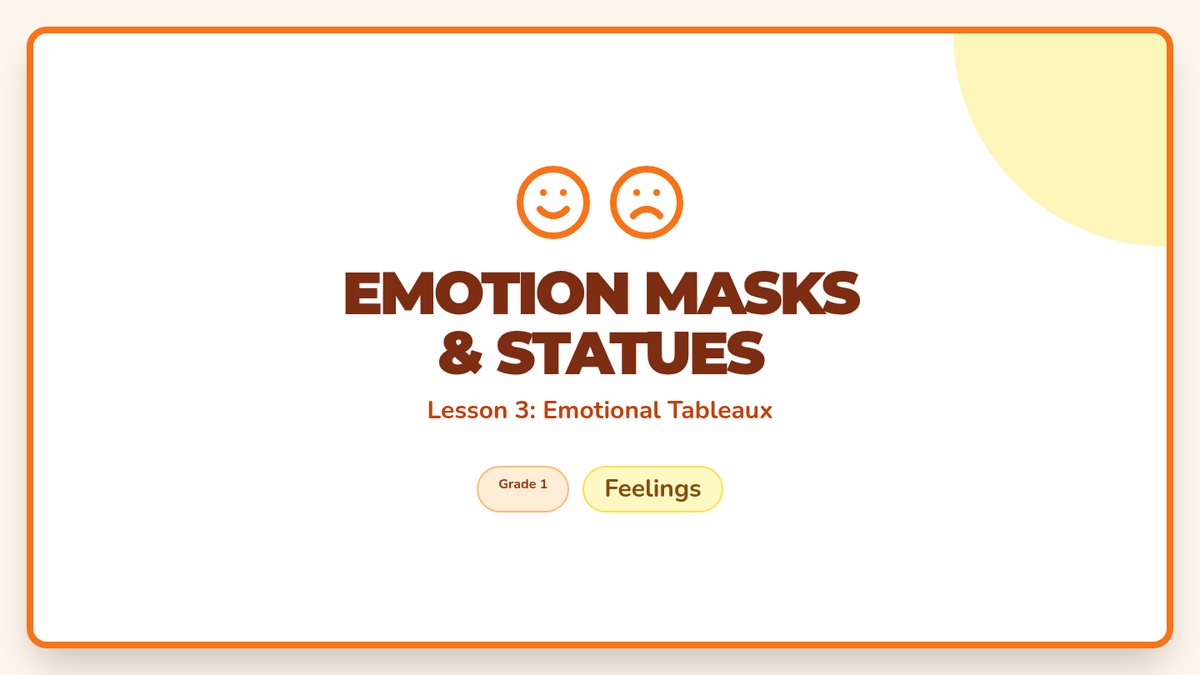 A 1st-grade theater sequence focusing on the actor's primary tools: the body and the voice. Students progress from spatial awareness and physical levels to emotional expression and vocal variety, culminating in a short character performance.