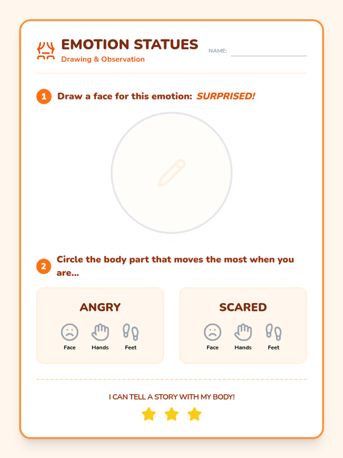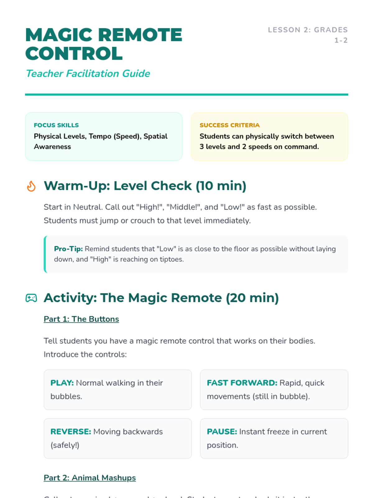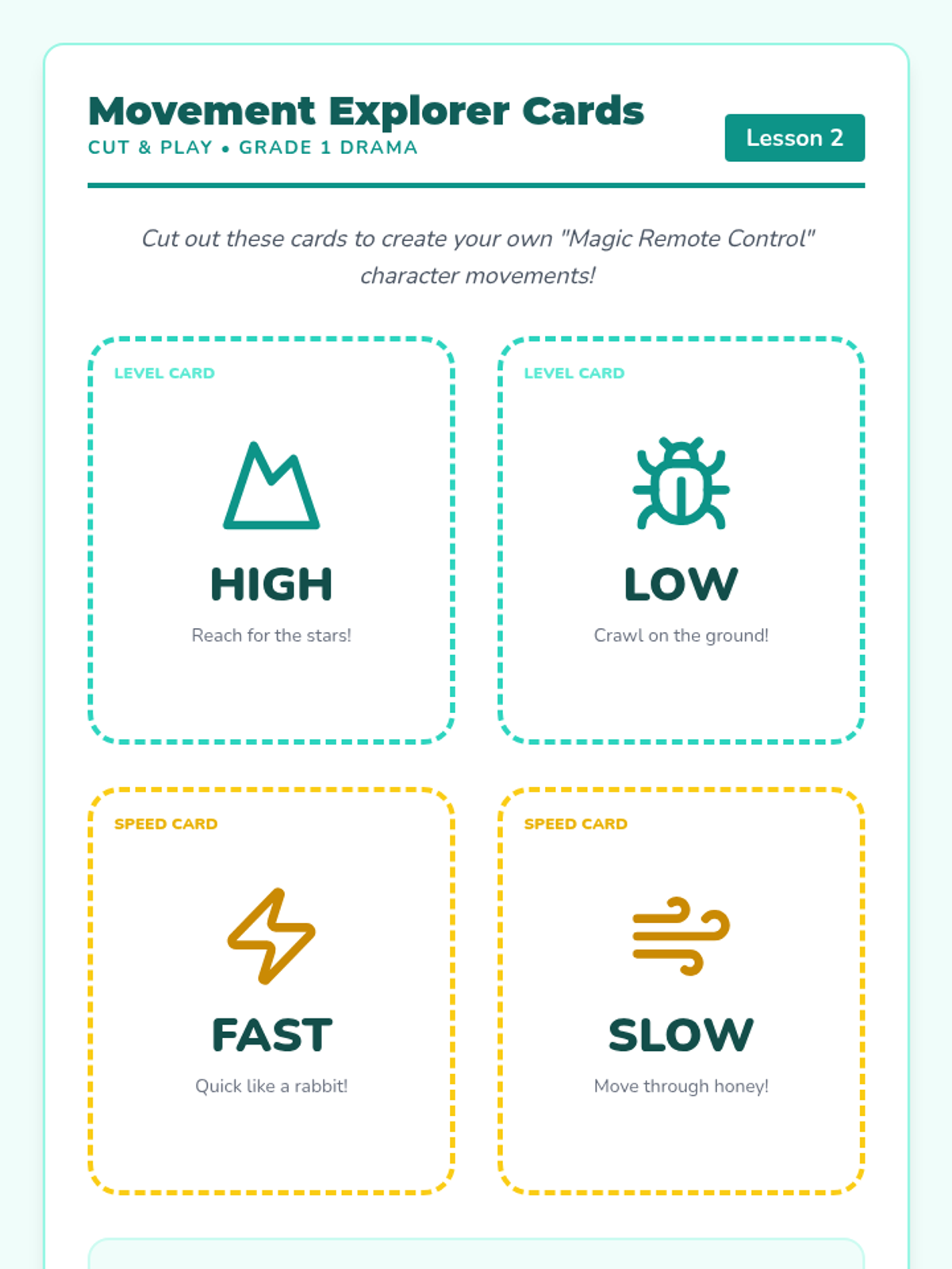 A 1st-grade theater sequence focusing on the actor's primary tools: the body and the voice. Students progress from spatial awareness and physical levels to emotional expression and vocal variety, culminating in a short character performance.