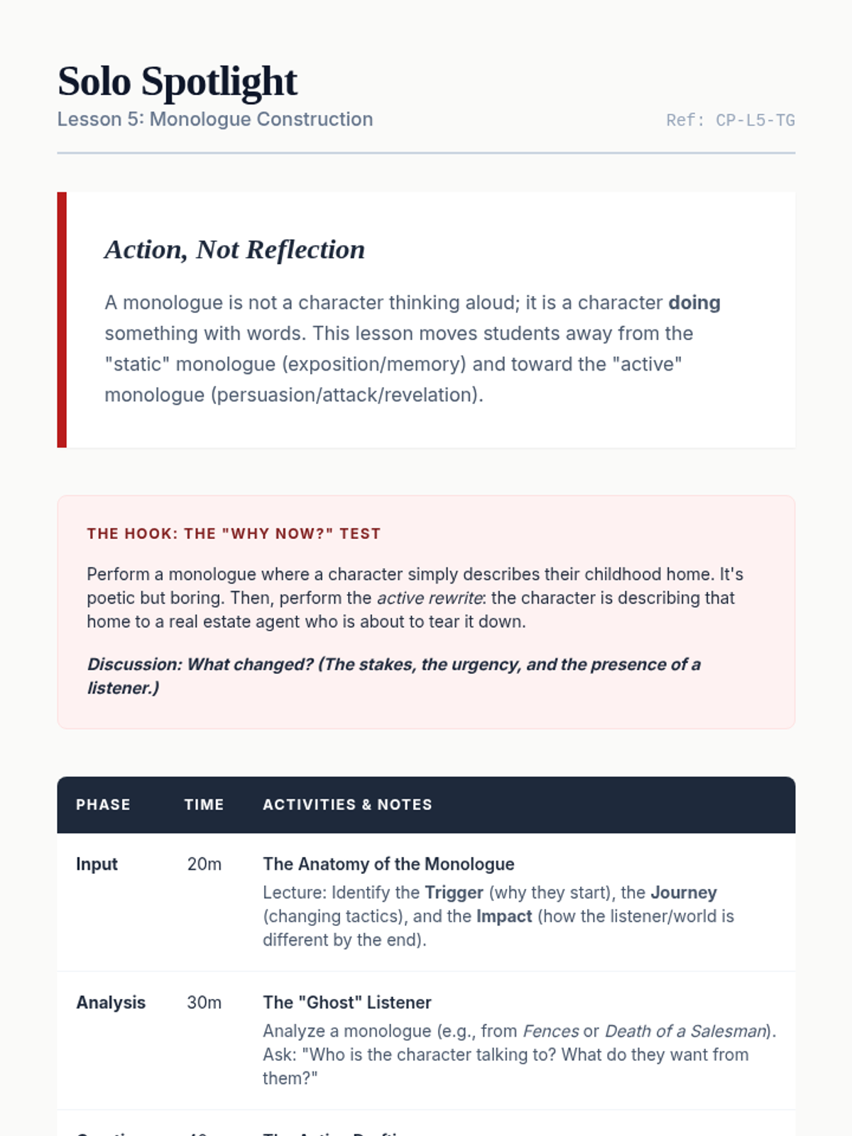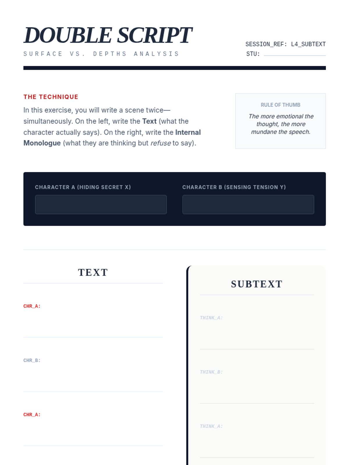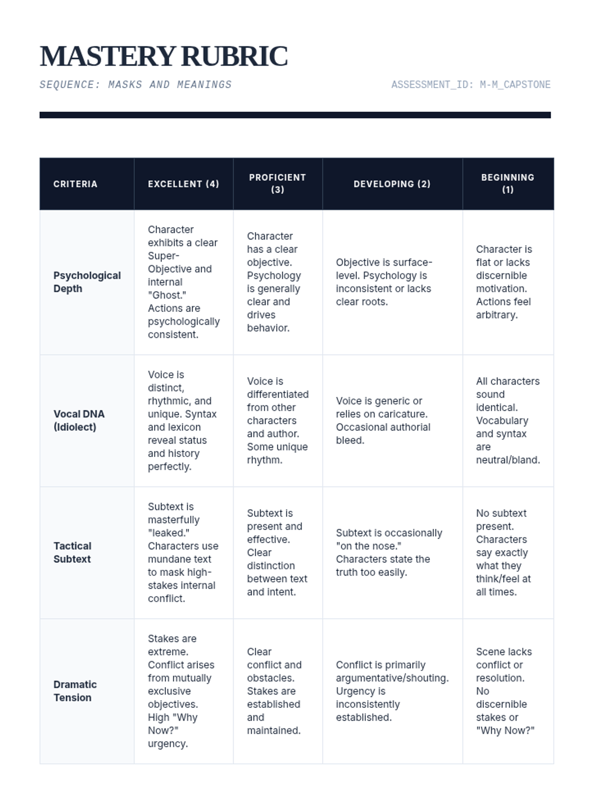 This sequence explores the depths of character development and dialogue for undergraduate playwrights, focusing on psychological realism, objectives, voice differentiation, and the masterly use of subtext. Students progress from building internal character foundations to crafting active, subtext-rich scenes and monologues.
