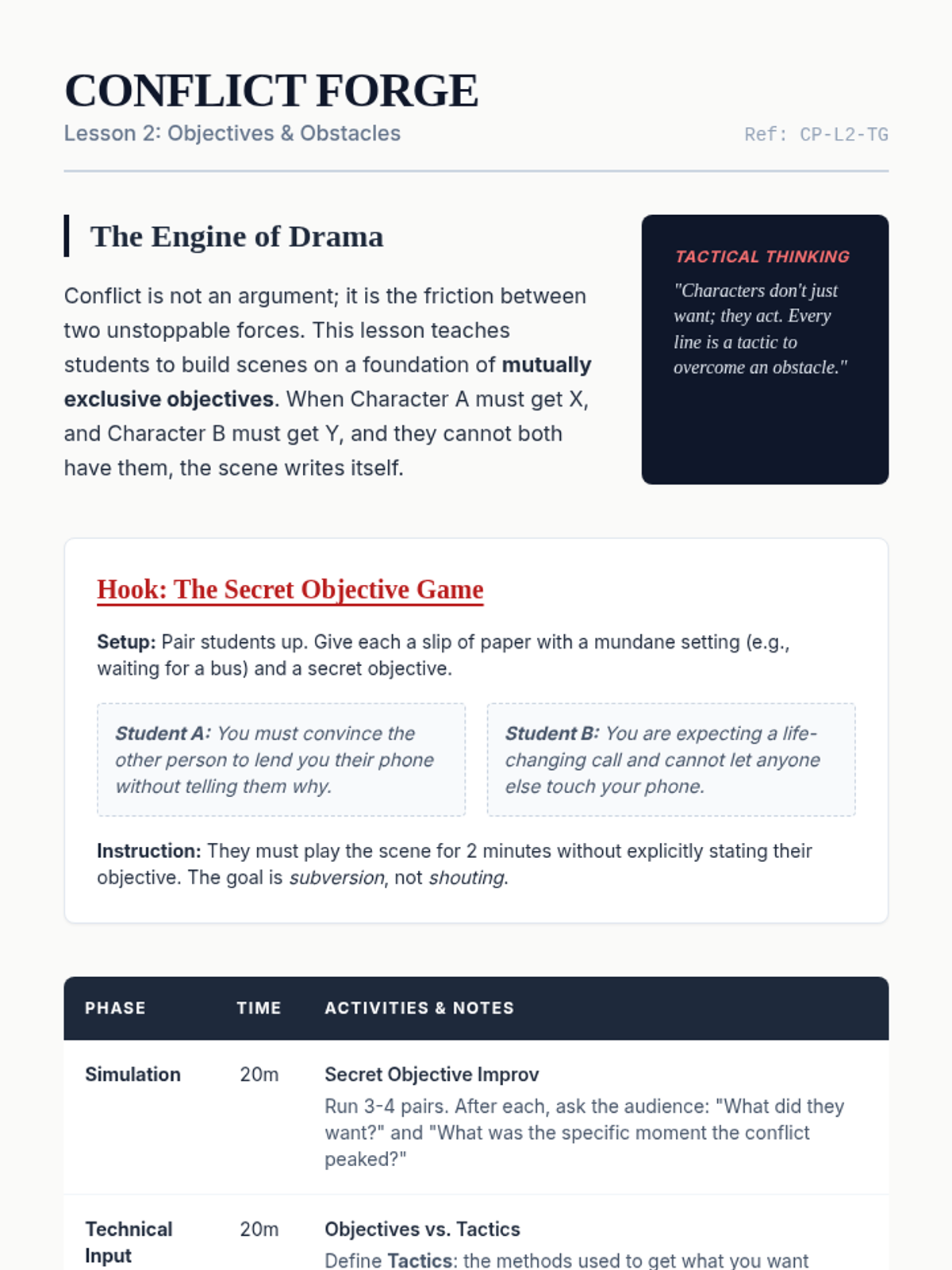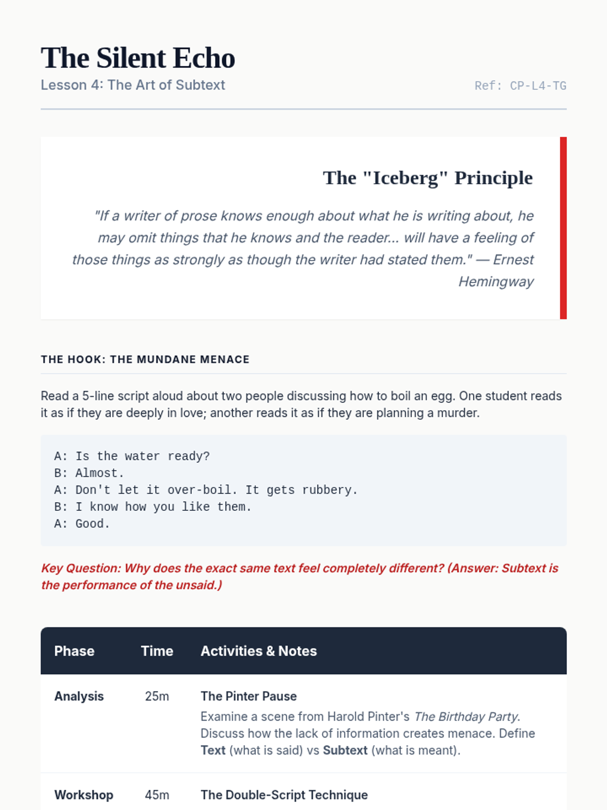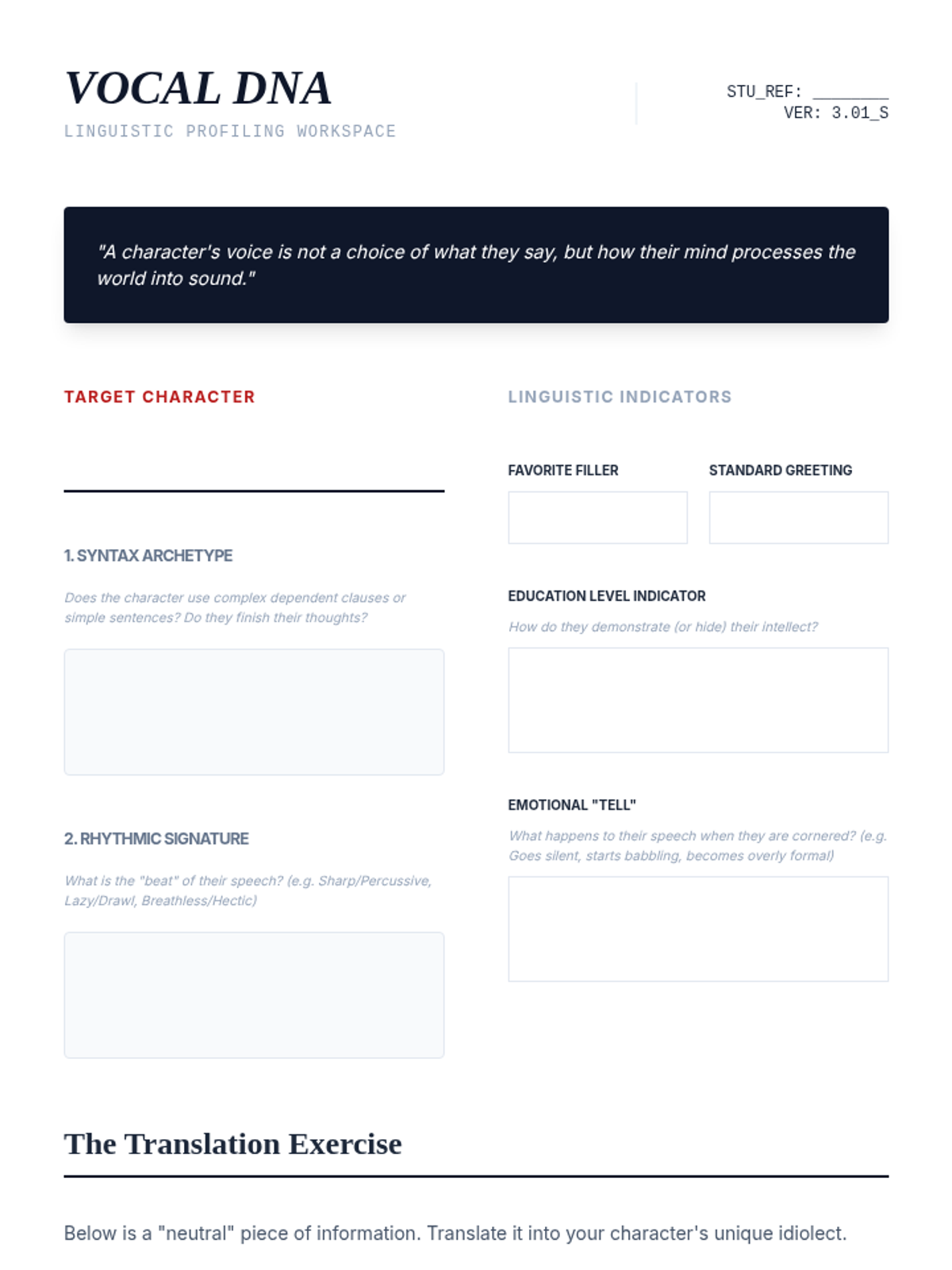 This sequence explores the depths of character development and dialogue for undergraduate playwrights, focusing on psychological realism, objectives, voice differentiation, and the masterly use of subtext. Students progress from building internal character foundations to crafting active, subtext-rich scenes and monologues.