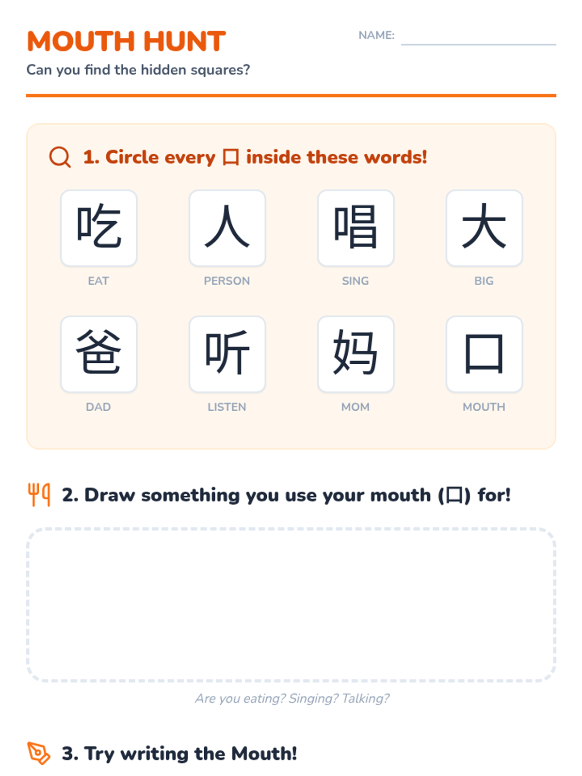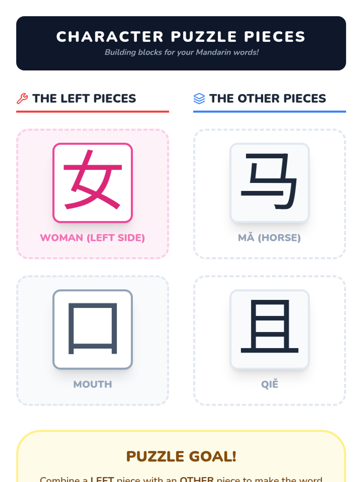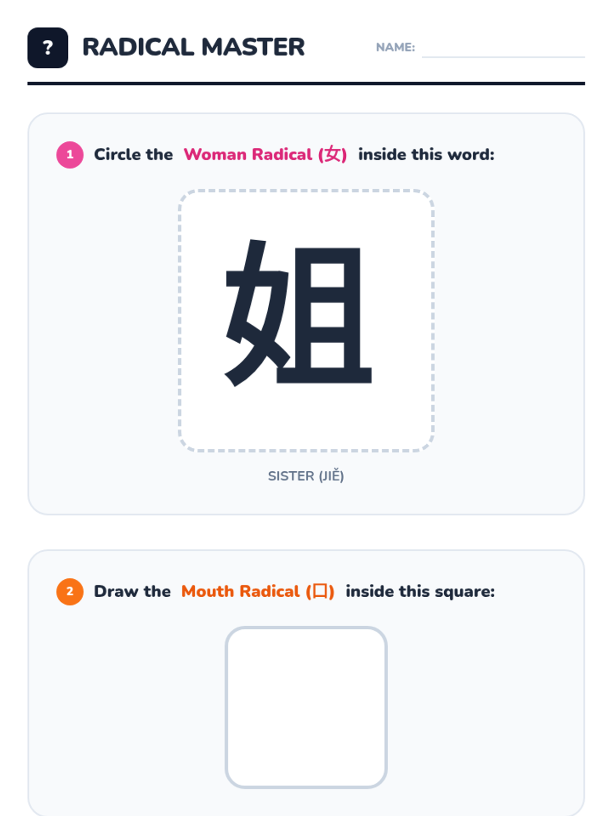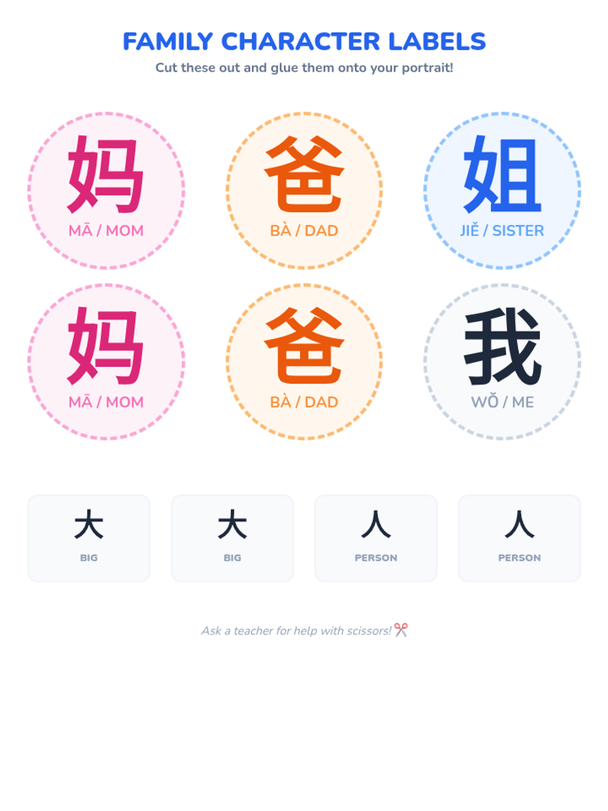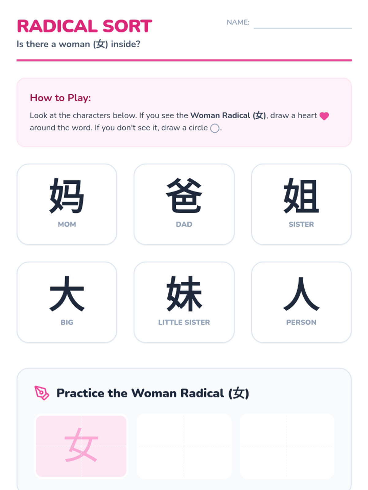 A Kindergarten intro to Mandarin Chinese focusing on radicals as building blocks for family-related characters. Students learn to recognize 'Person', 'Mouth', and 'Female' components through movement, observation, and hands-on puzzles.