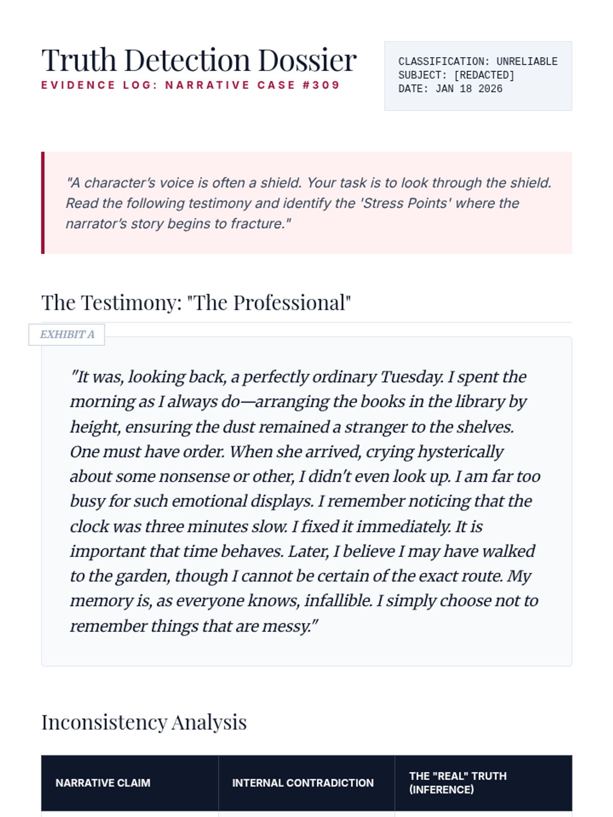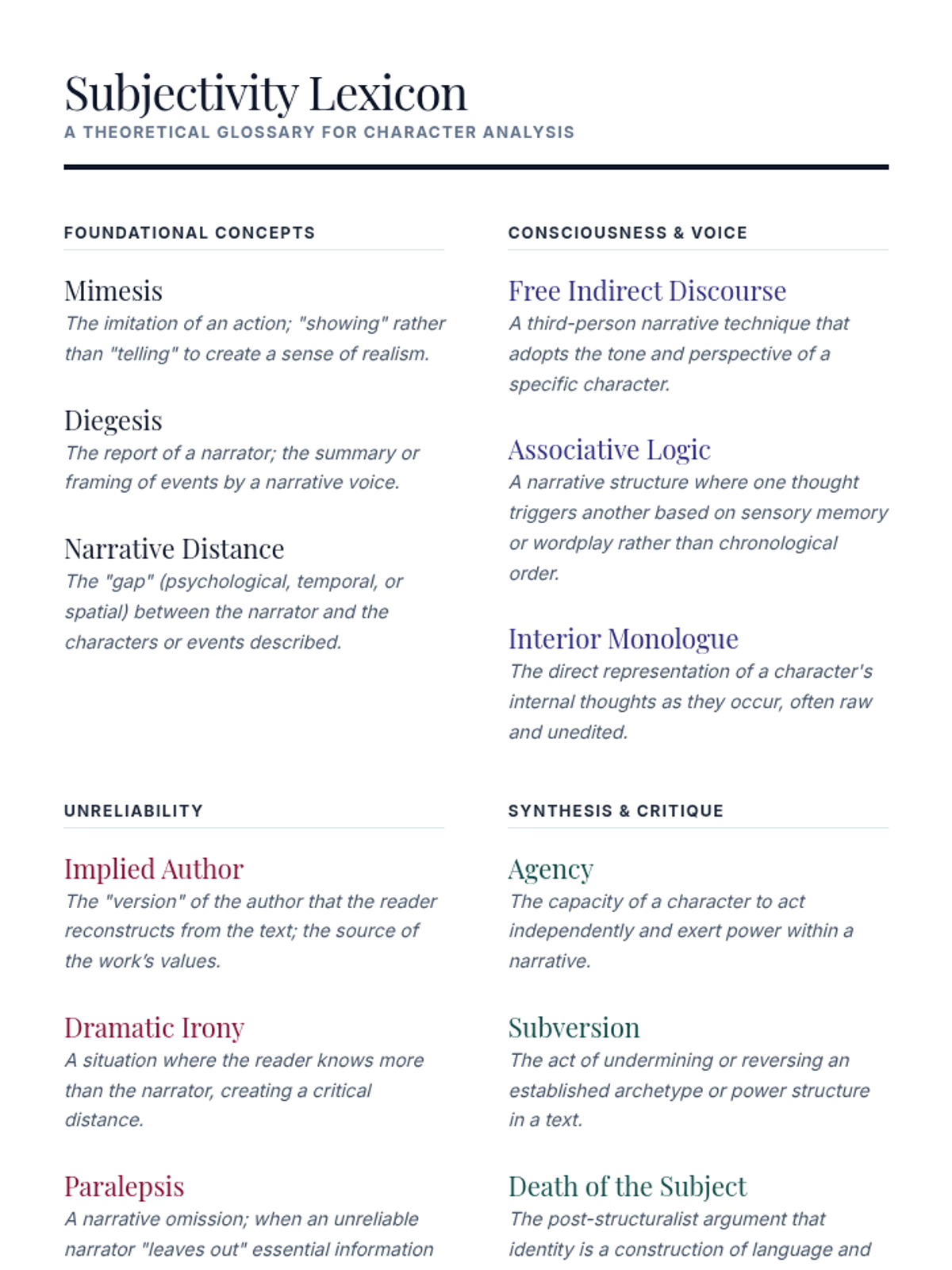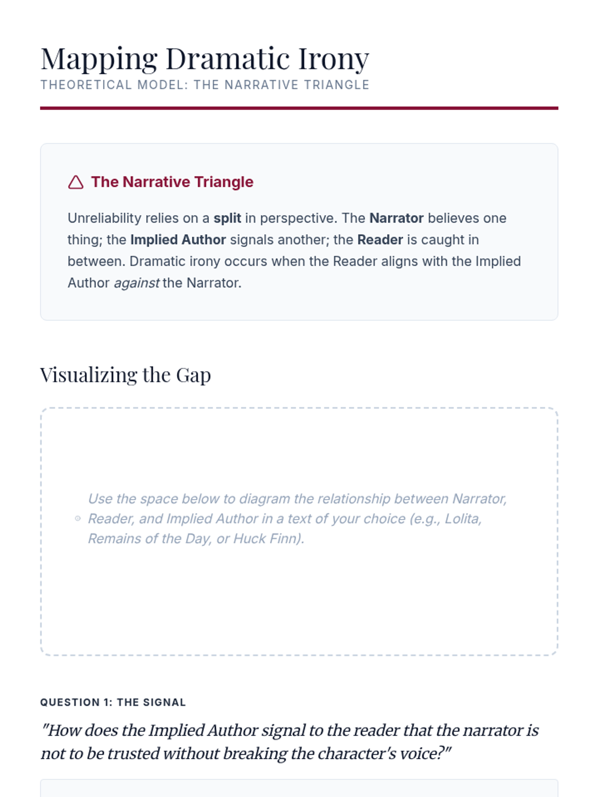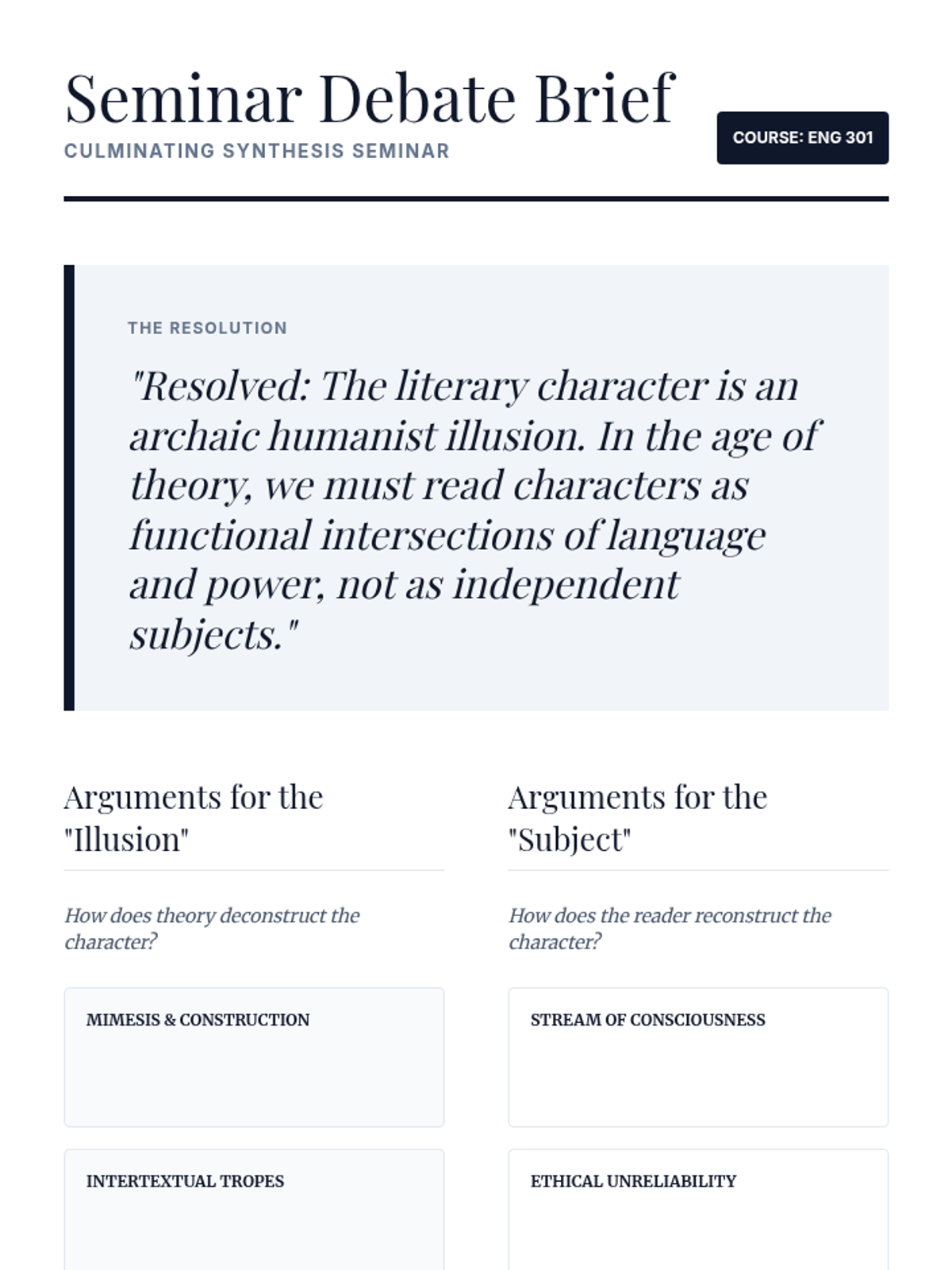 An advanced undergraduate sequence exploring the theoretical construction of character through mimesis, interiority, unreliability, and post-structuralist critique. Students deconstruct literary figures to understand the relationship between narrative voice and subjectivity.