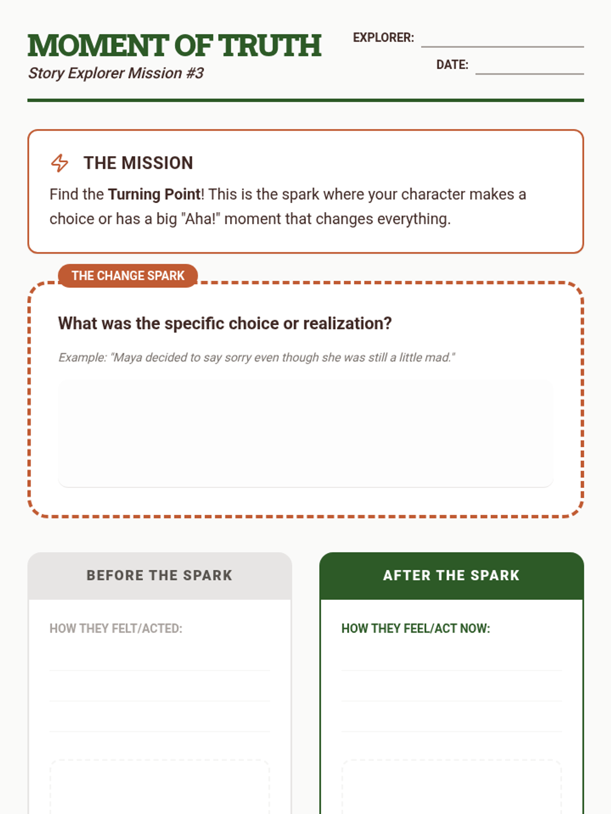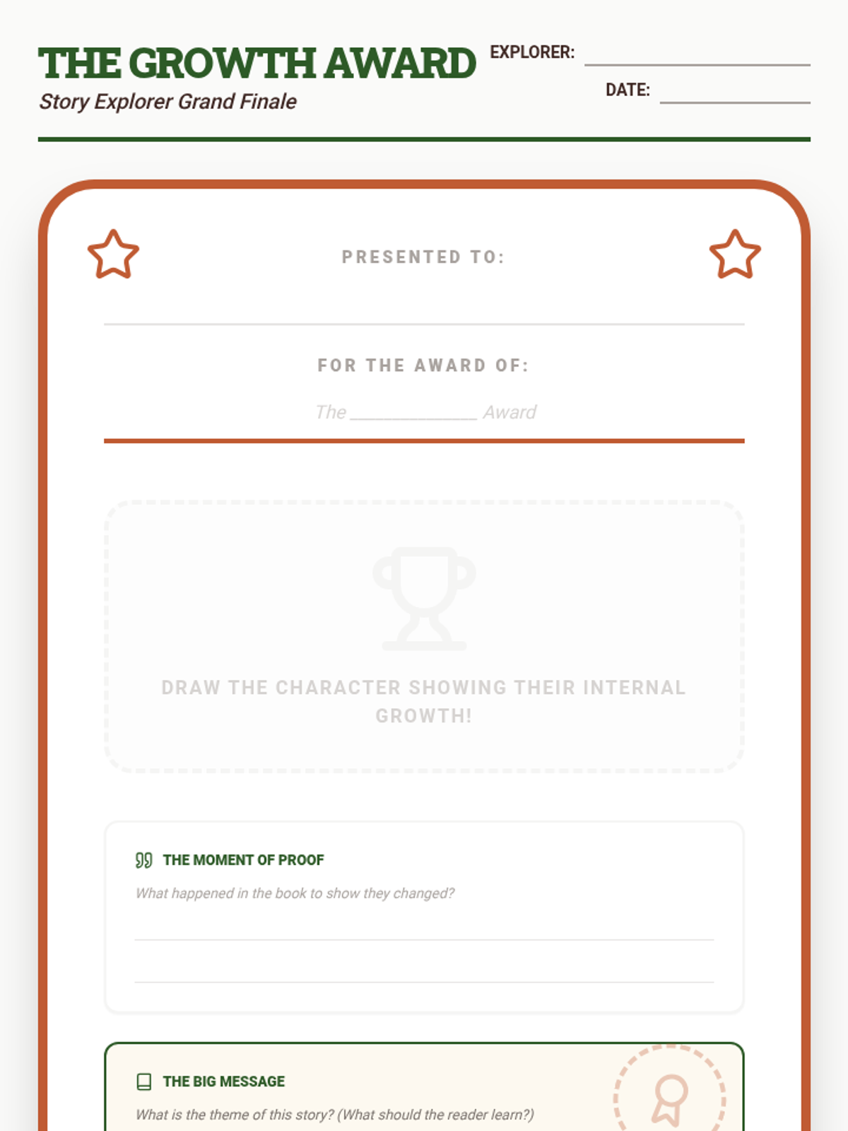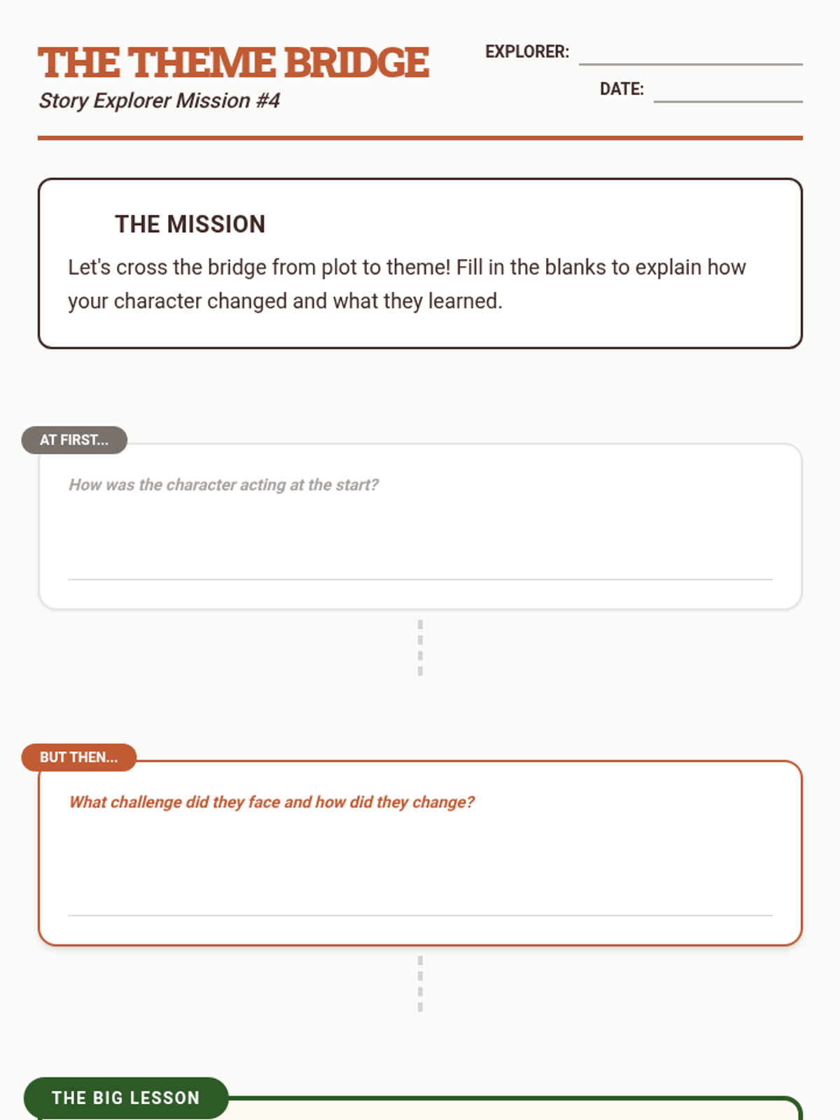 A 2nd Grade ELA sequence exploring how character growth and change reveal a story's theme. Students act as 'Story Explorers' to track traits, challenges, and turning points to discover the big lesson.