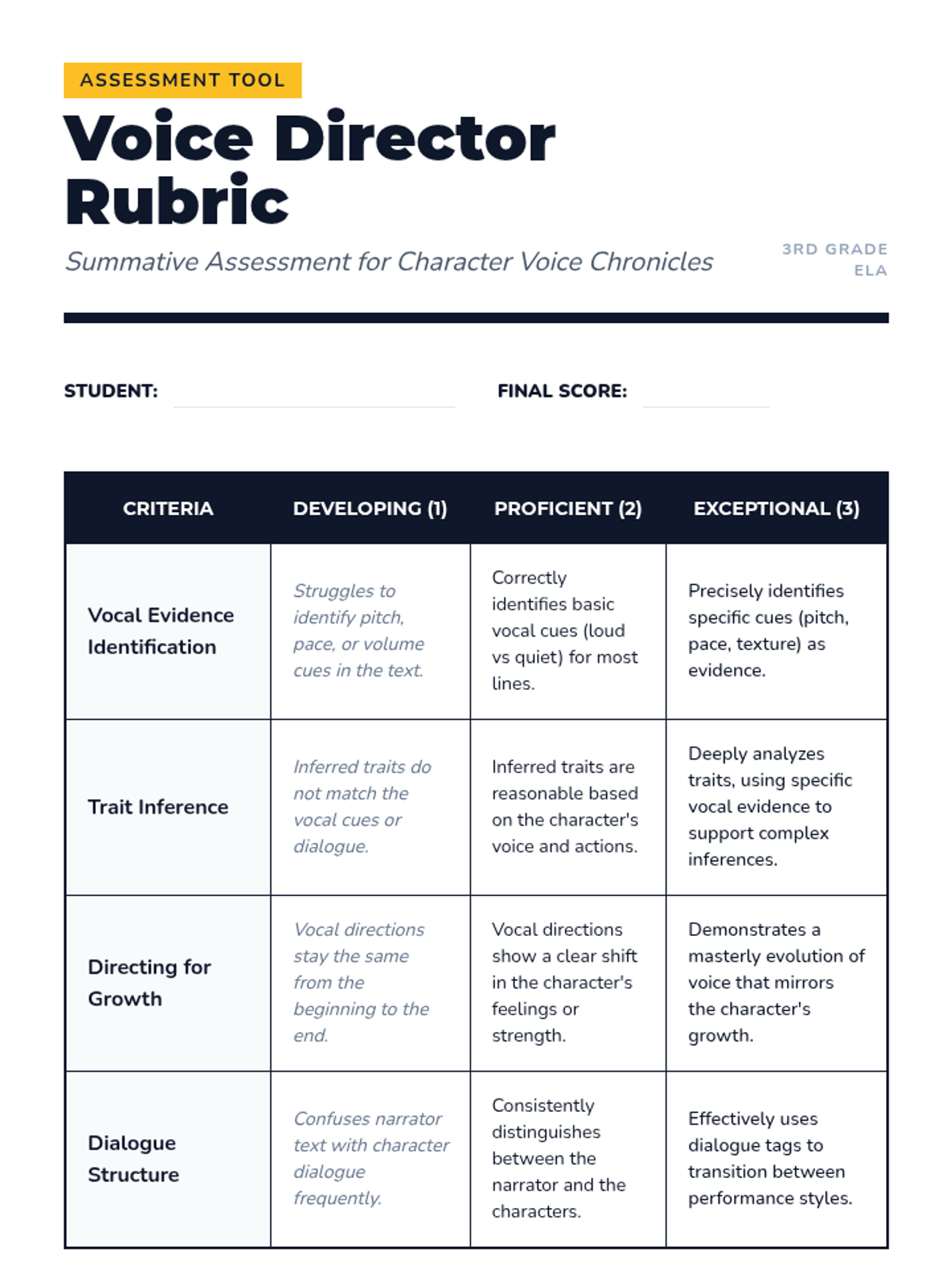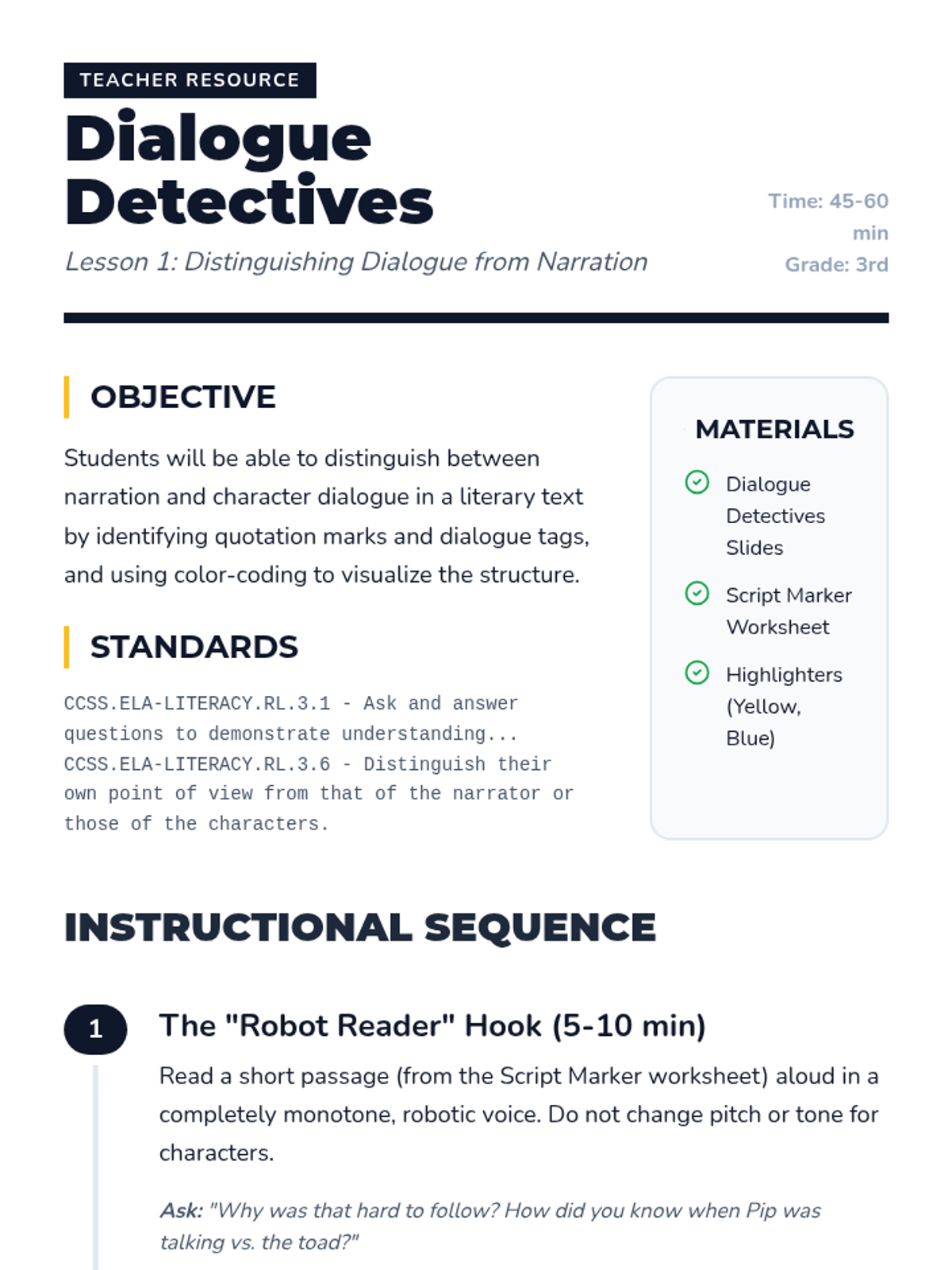 This sequence uses dramatic read-alouds and dialogue analysis to help 3rd-grade students infer character traits, motivations, and relationships. Students progress from identifying text structures like dialogue tags to acting as 'Voice Directors' who interpret character growth through vocal performance.
