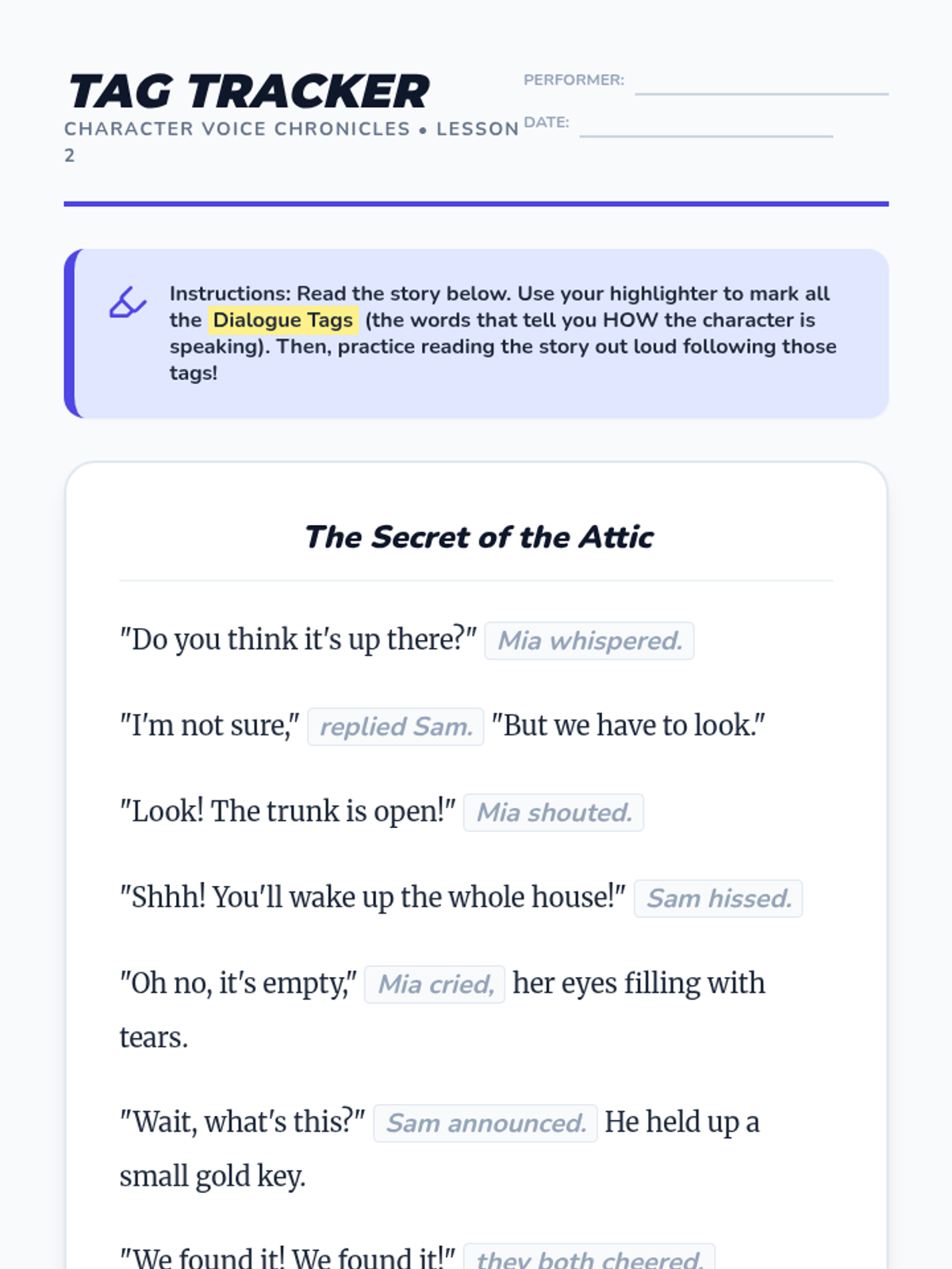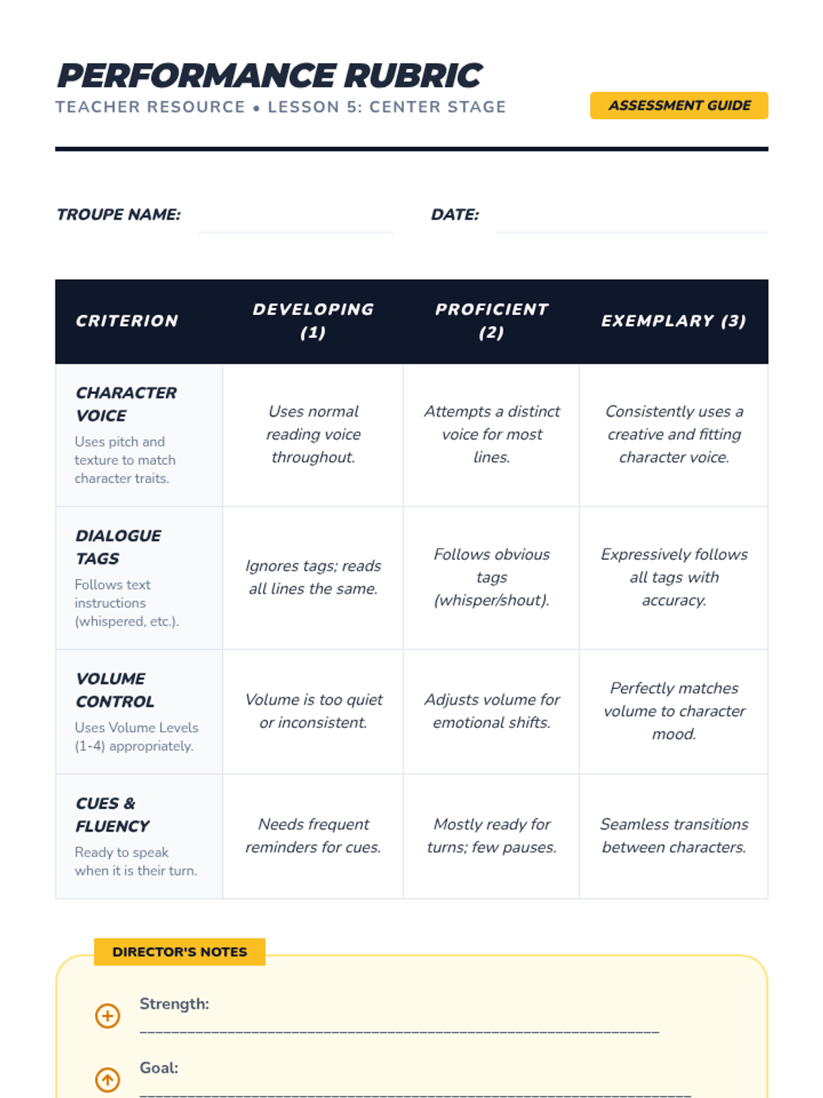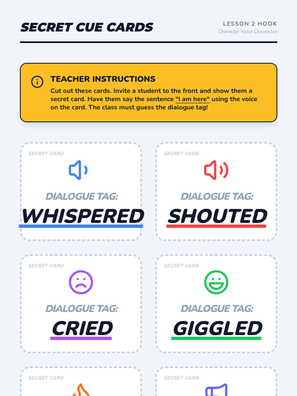 Students analyze how narrators use distinct voices to differentiate characters, map character traits to vocal qualities, and practice performing dialogue for a final Reader's Theater performance.