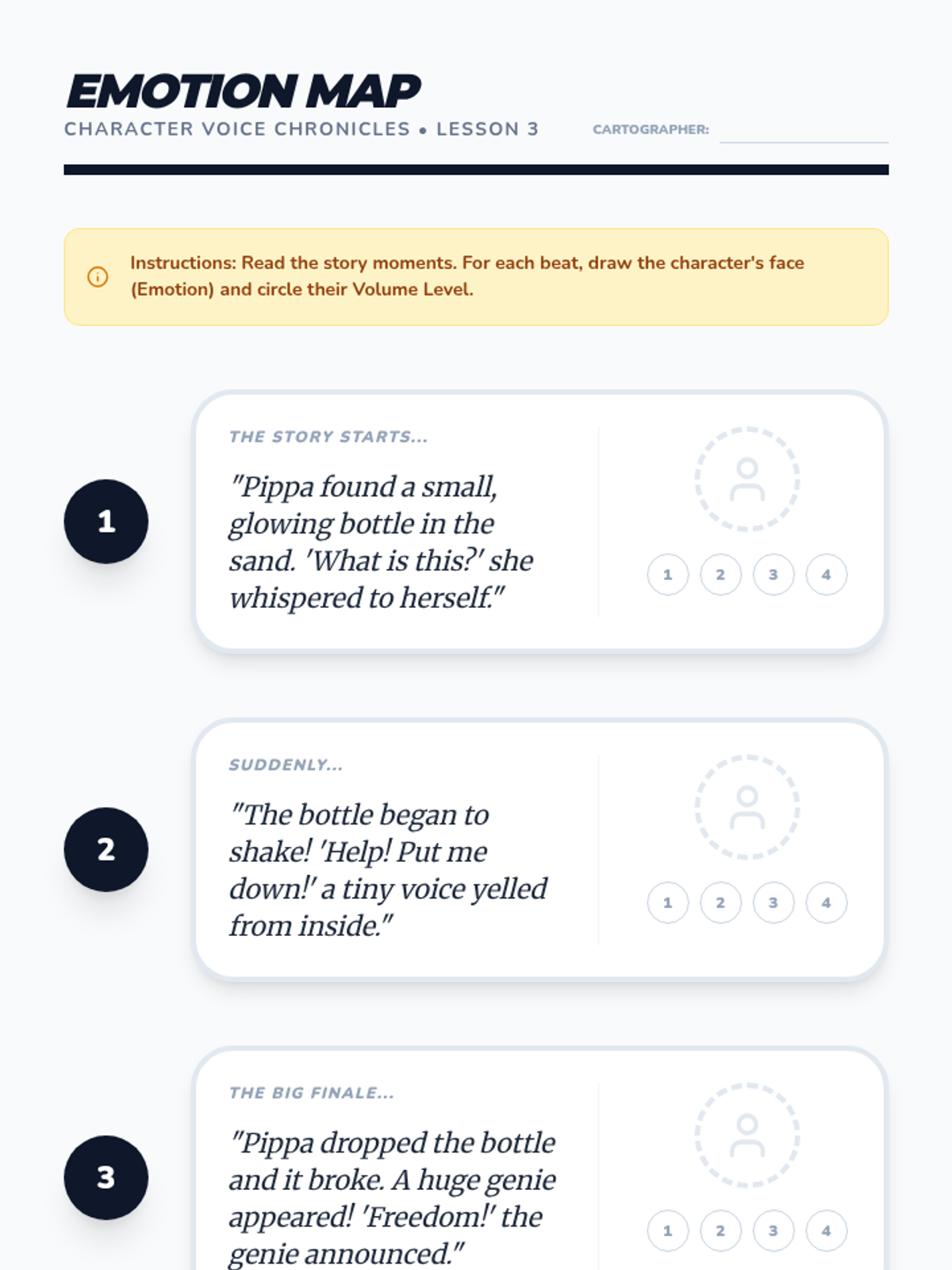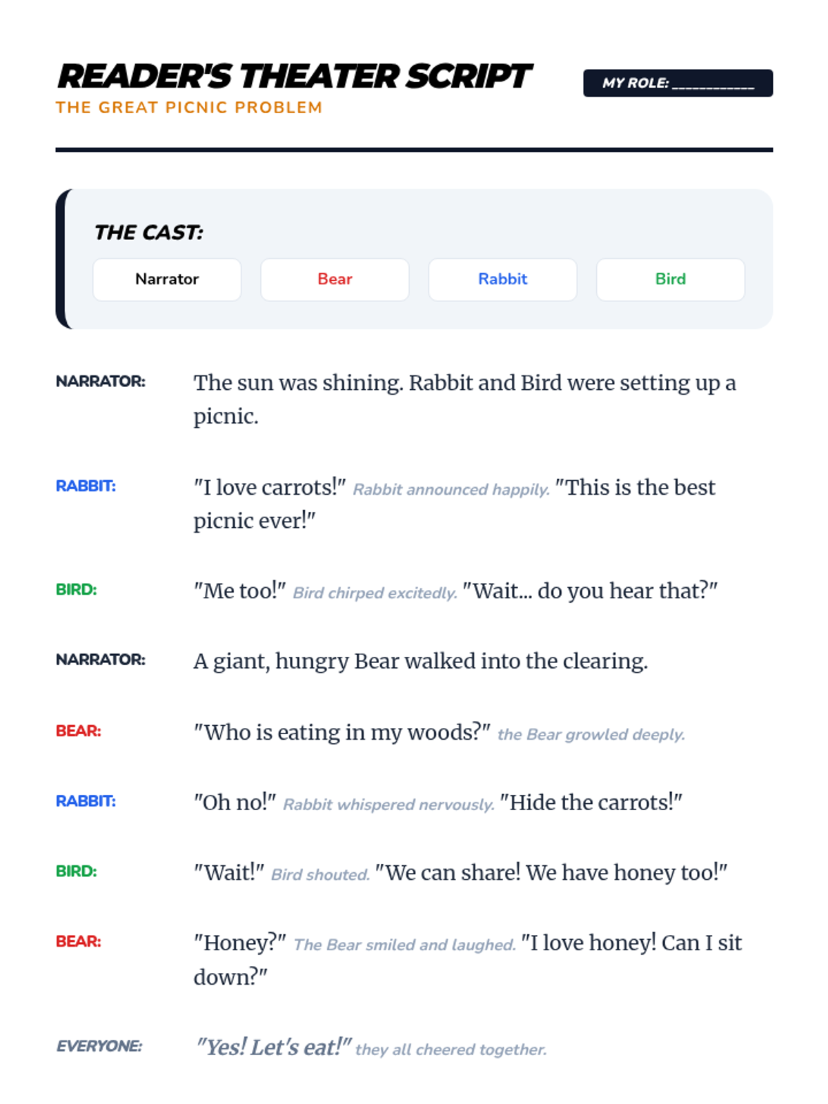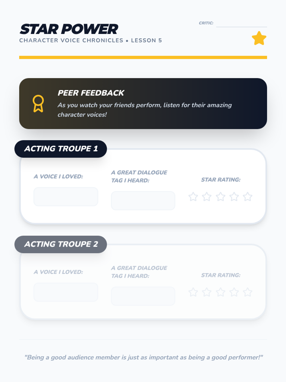Students analyze how narrators use distinct voices to differentiate characters, map character traits to vocal qualities, and practice performing dialogue for a final Reader's Theater performance.