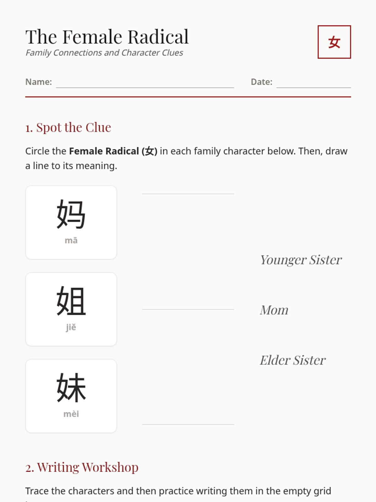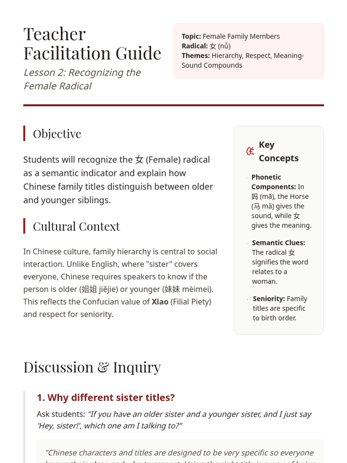 A 5-lesson sequence for 3rd graders exploring Mandarin Chinese characters through the lens of family and identity. Students learn to recognize the 'Person' and 'Female' radicals, master sibling hierarchy terminology, and understand the cultural stories behind compound characters.