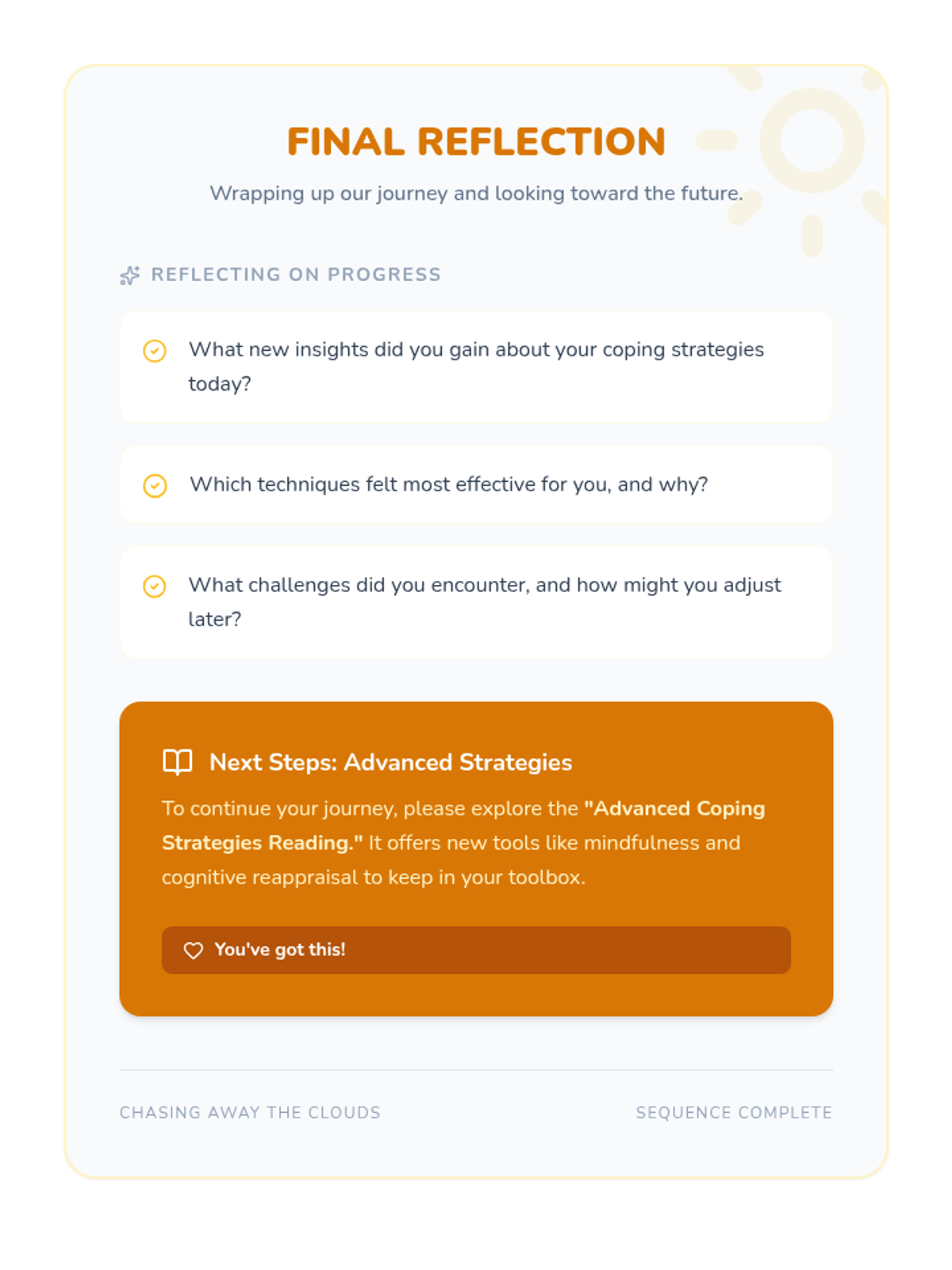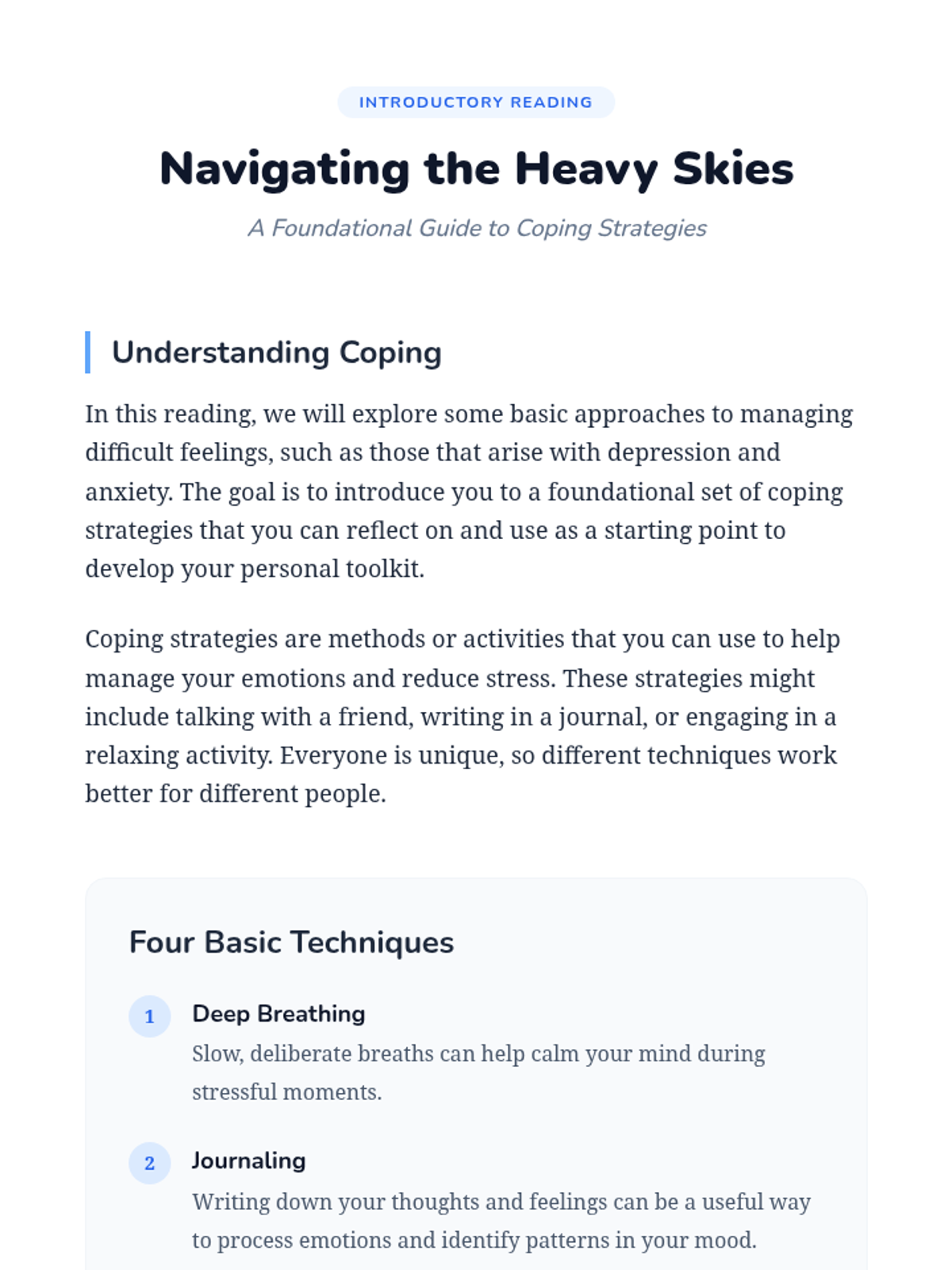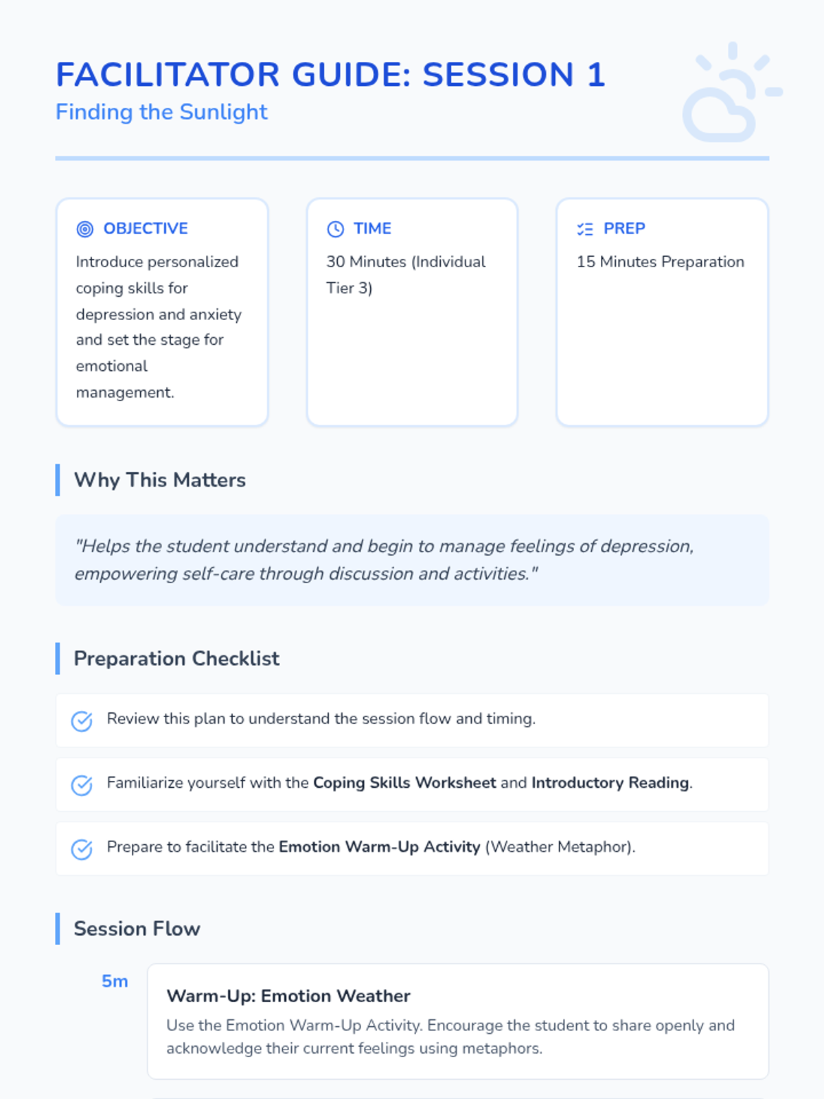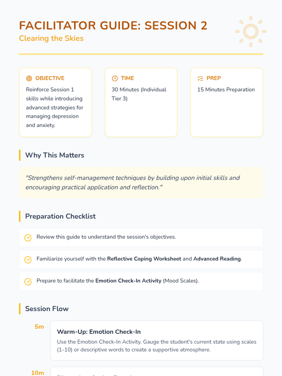 A Tier 3 intervention sequence designed to help individual students develop personalized coping strategies for depression and anxiety through two 30-minute sessions of reflection and practice.