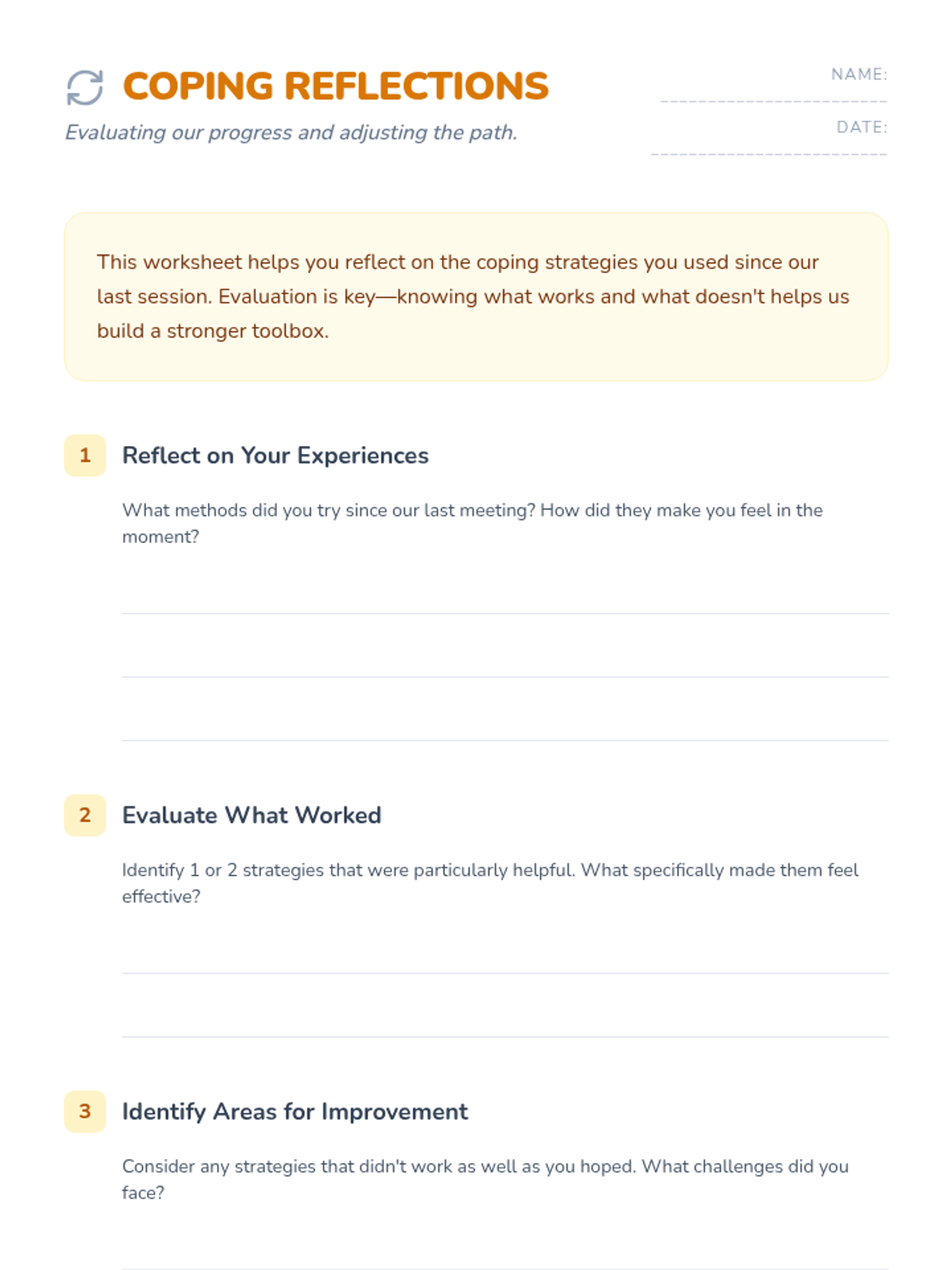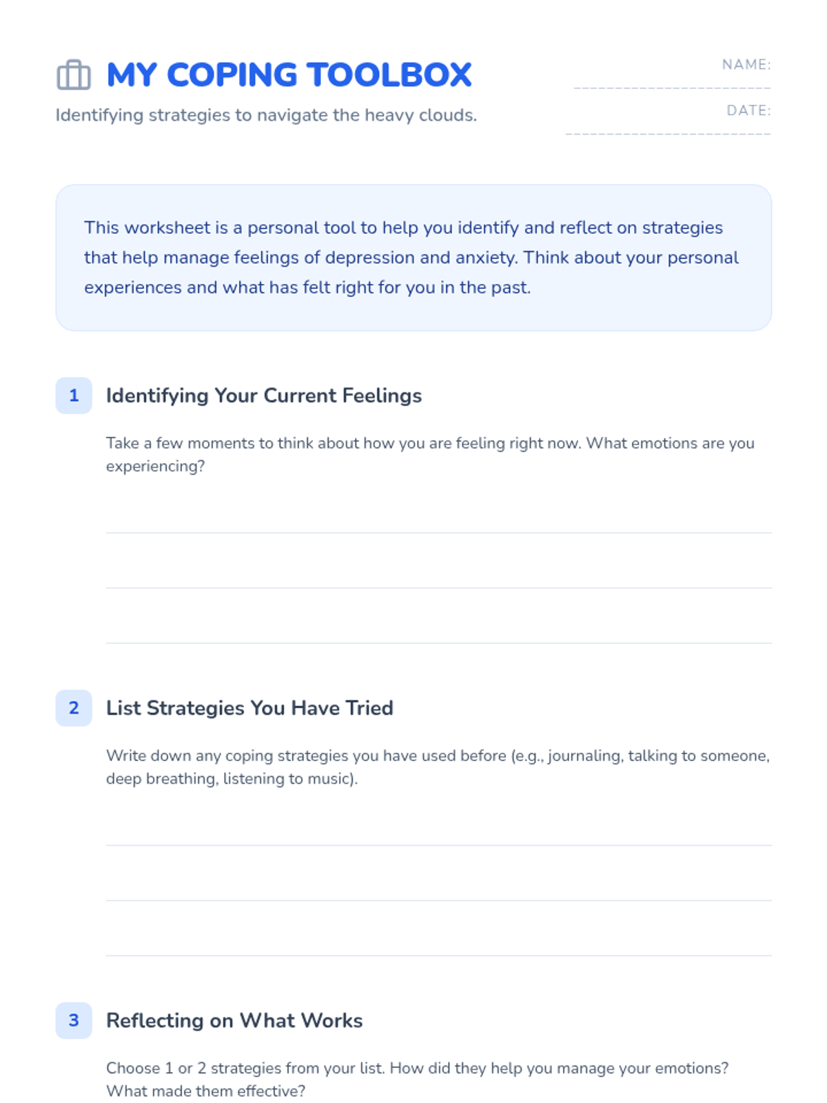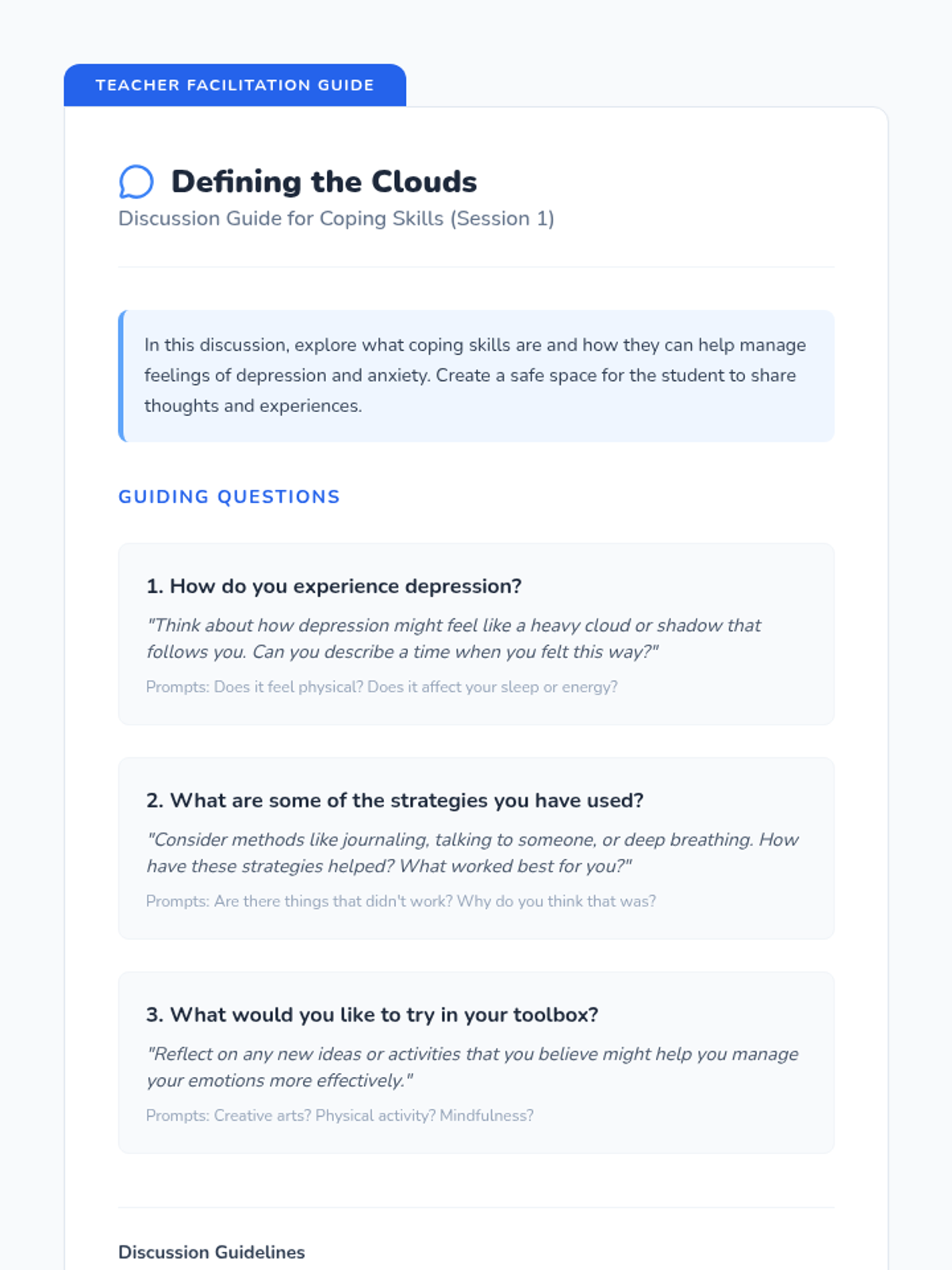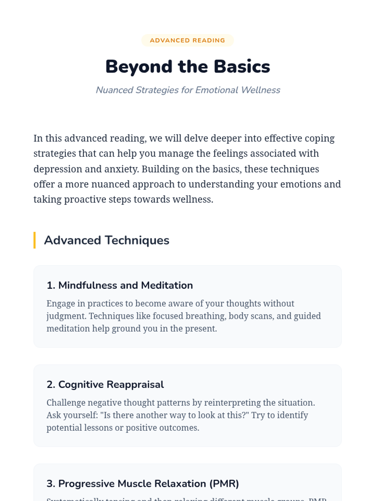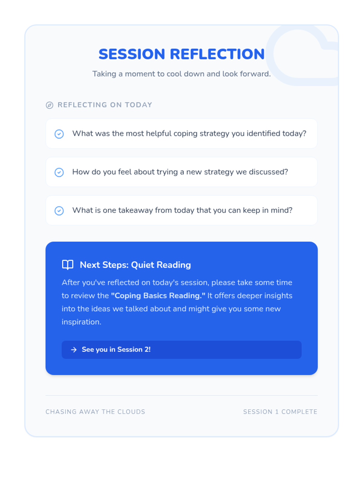 A Tier 3 intervention sequence designed to help individual students develop personalized coping strategies for depression and anxiety through two 30-minute sessions of reflection and practice.