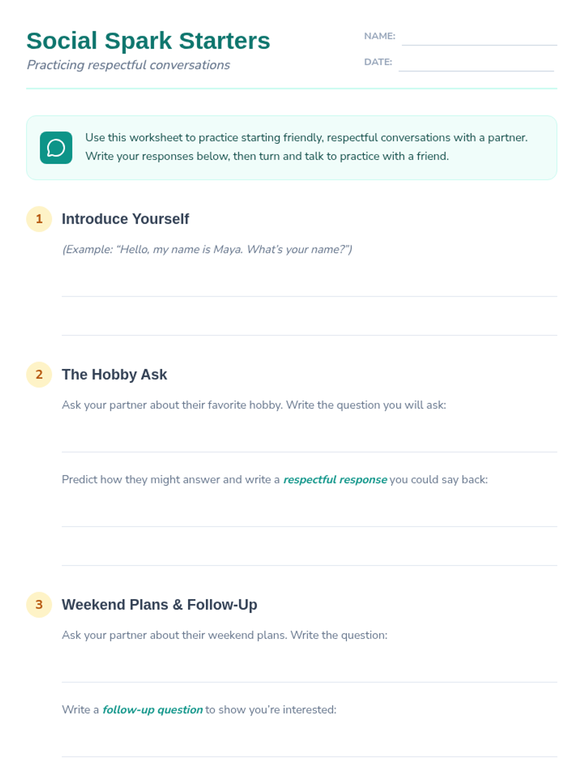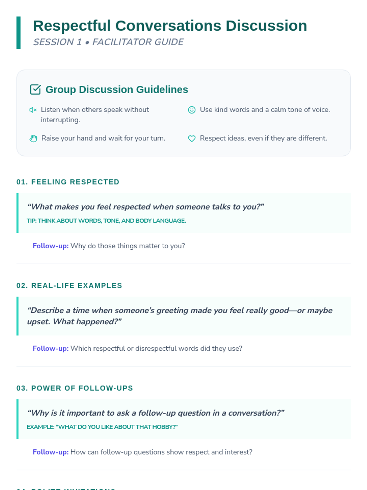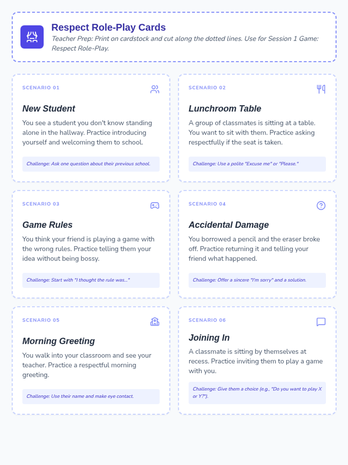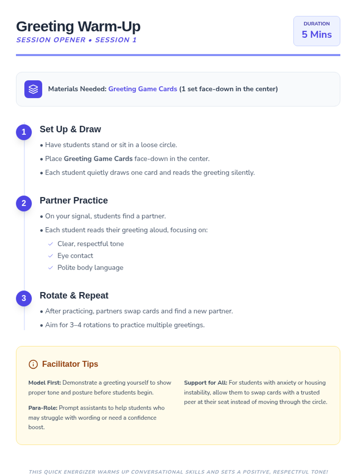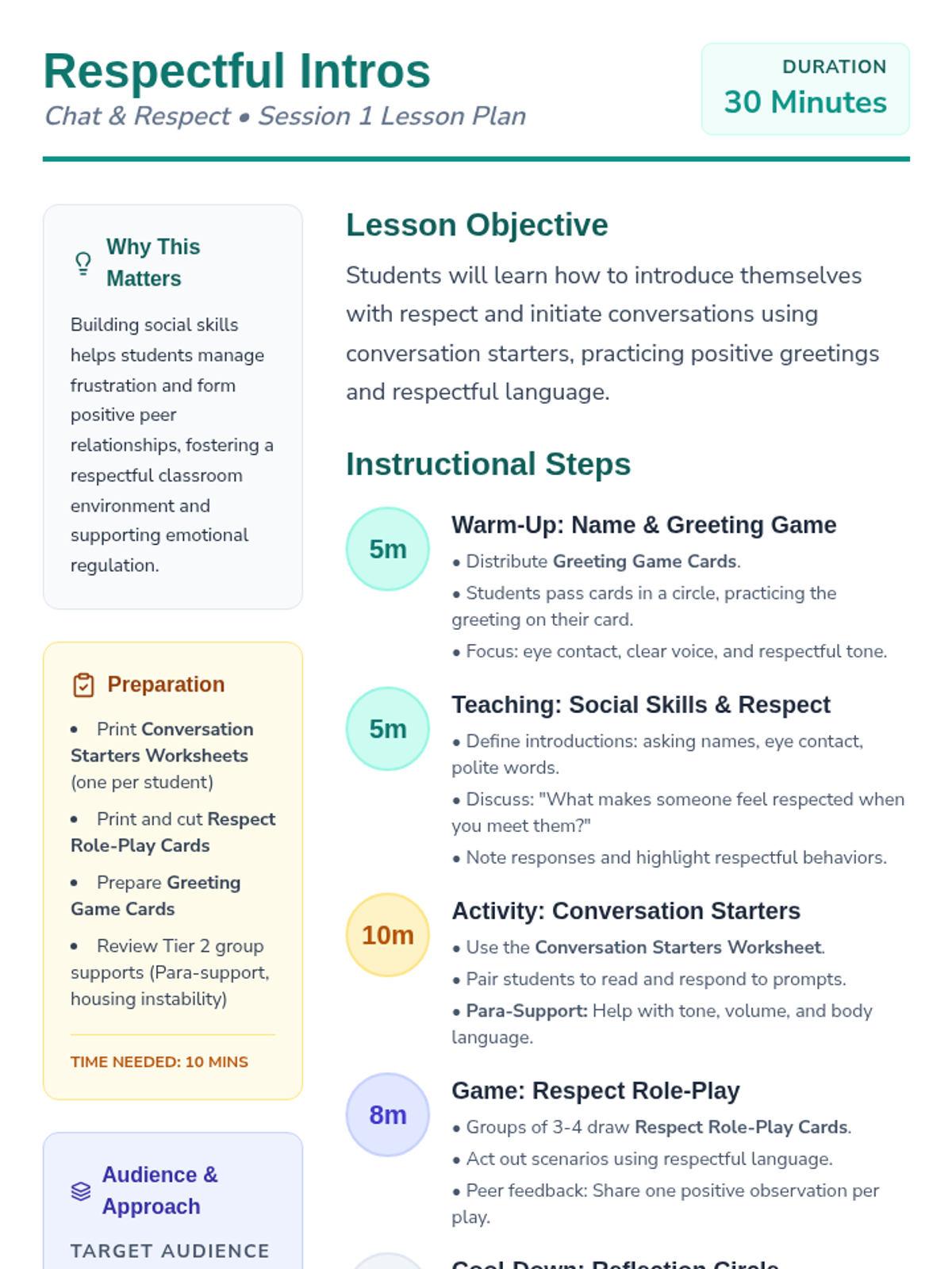 A 2-session social skills program for 5th graders focused on starting conversations, showing respect, and managing frustration through interactive practice and reflection.